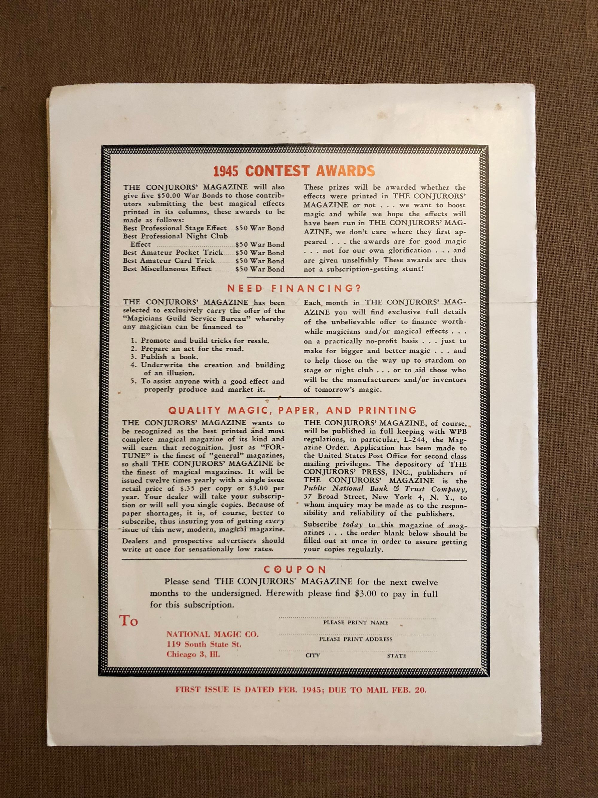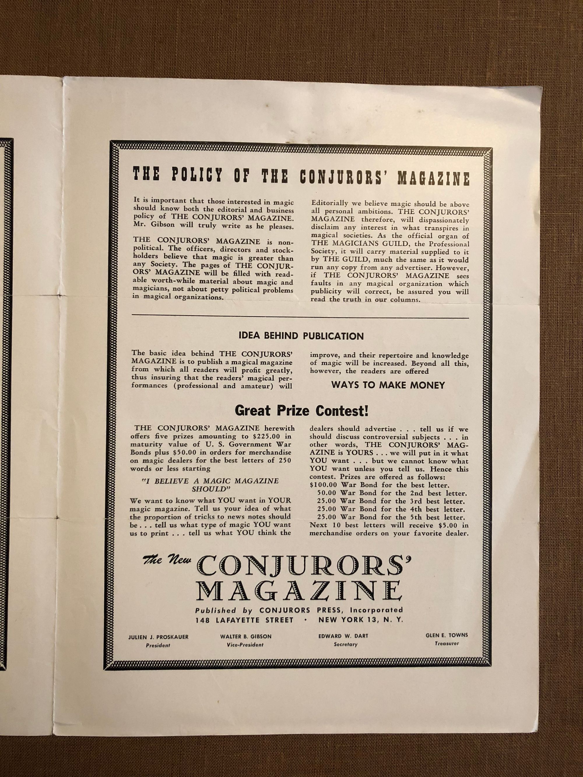 6 sheets typescript. Vol 1 No. 1. Condition: Browned with age, and stapled at the top center. Enclosed in a "Conjurers' Magazine" flyer.