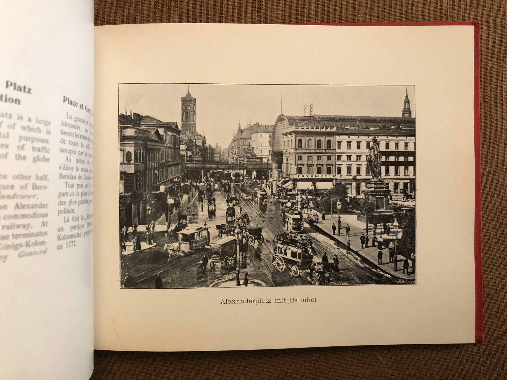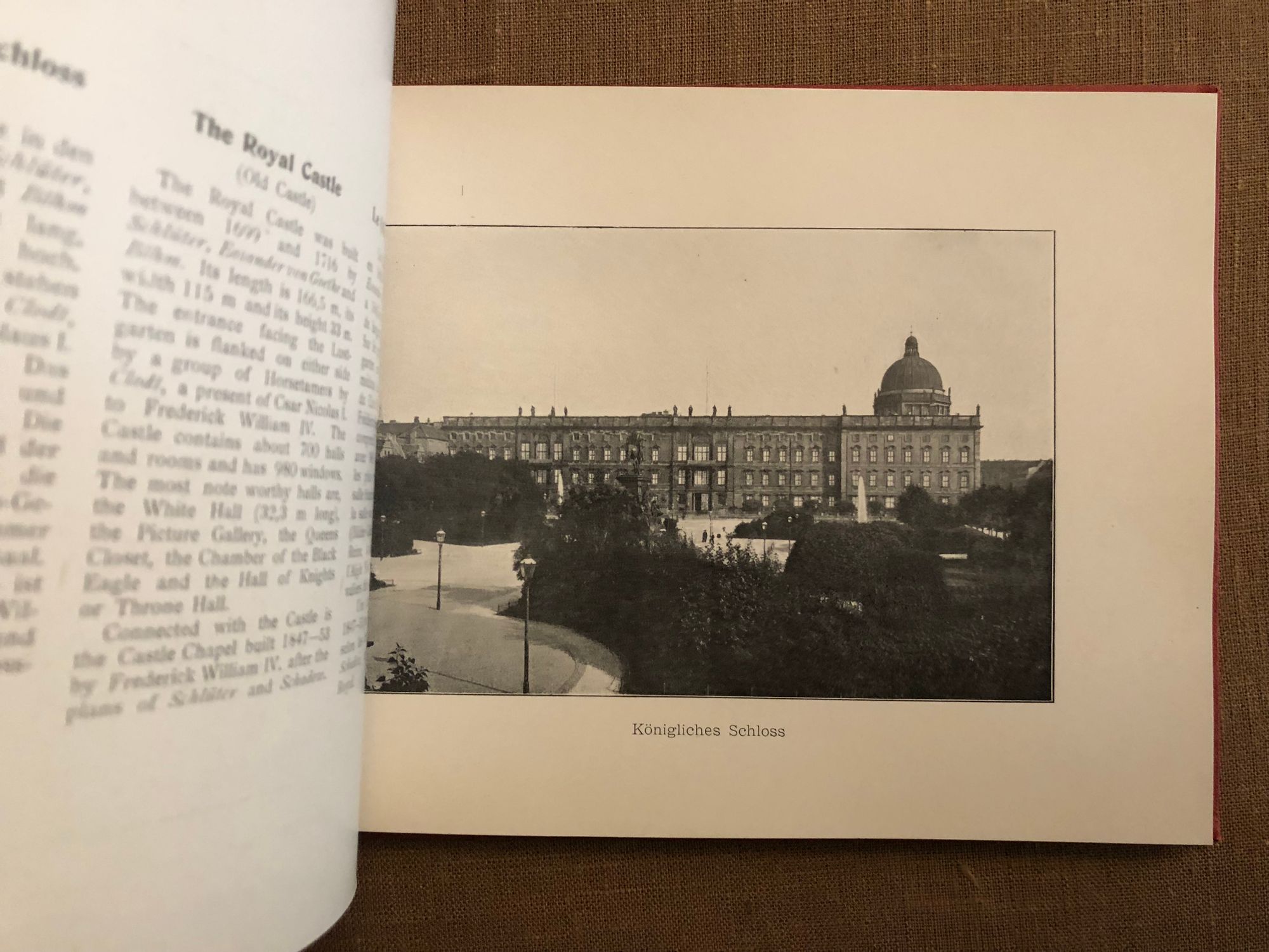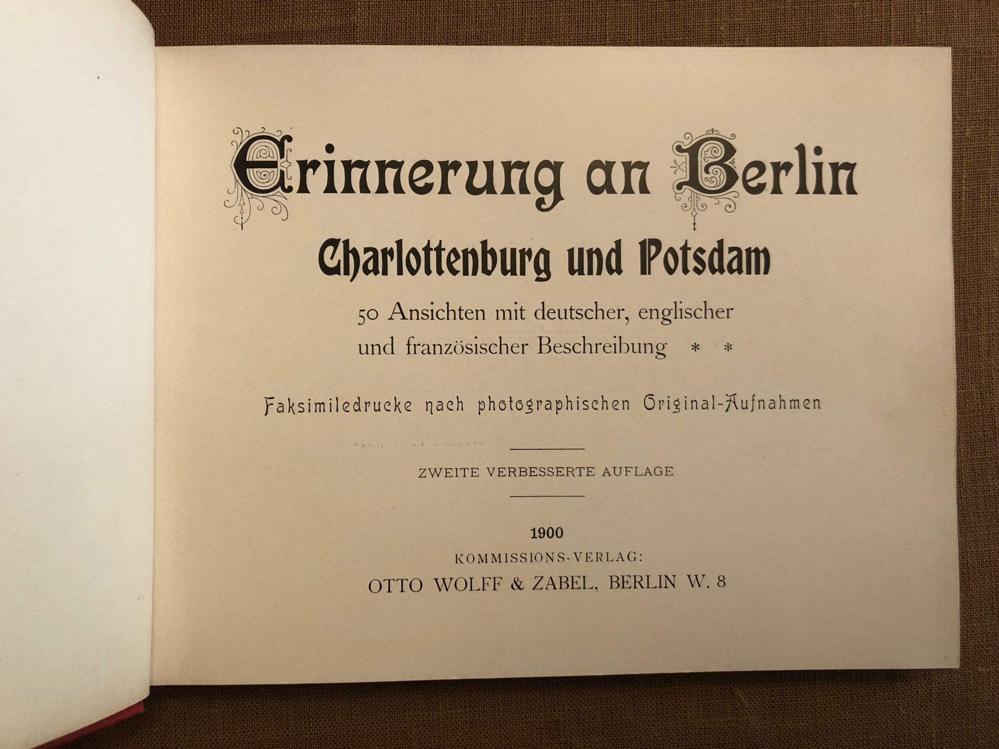 Hard cover, oblong 16mo, (measuring 8 1/2 x 6 1/4 inches) in original red cloth, with pictorial decoration in black and gilt to front board, and stamped in blind to the rear board Wilhelm Greve, Berlin, printer. Richard Sahl bookbindery, Berlin. Unpaginated. Floral printed endpapers. This tourist book in three languages also contains a couple of later news clippings from the cold war era, 1962. Condition: Very Good Minus. A few areas of soiling show to the front board; the ghost of a small removed label on the rear pastedown. Otherwise the book is firm, gently age-toned and clean with no writing or foxing.