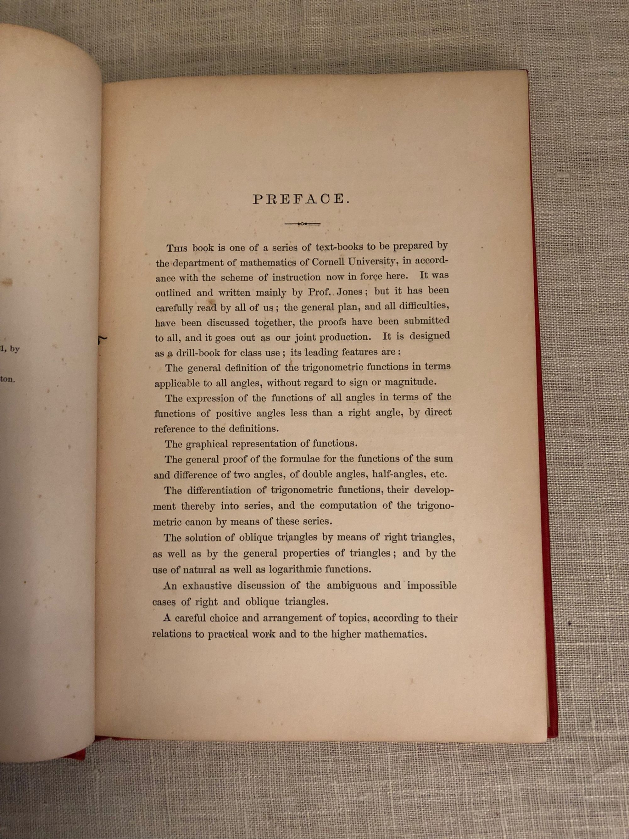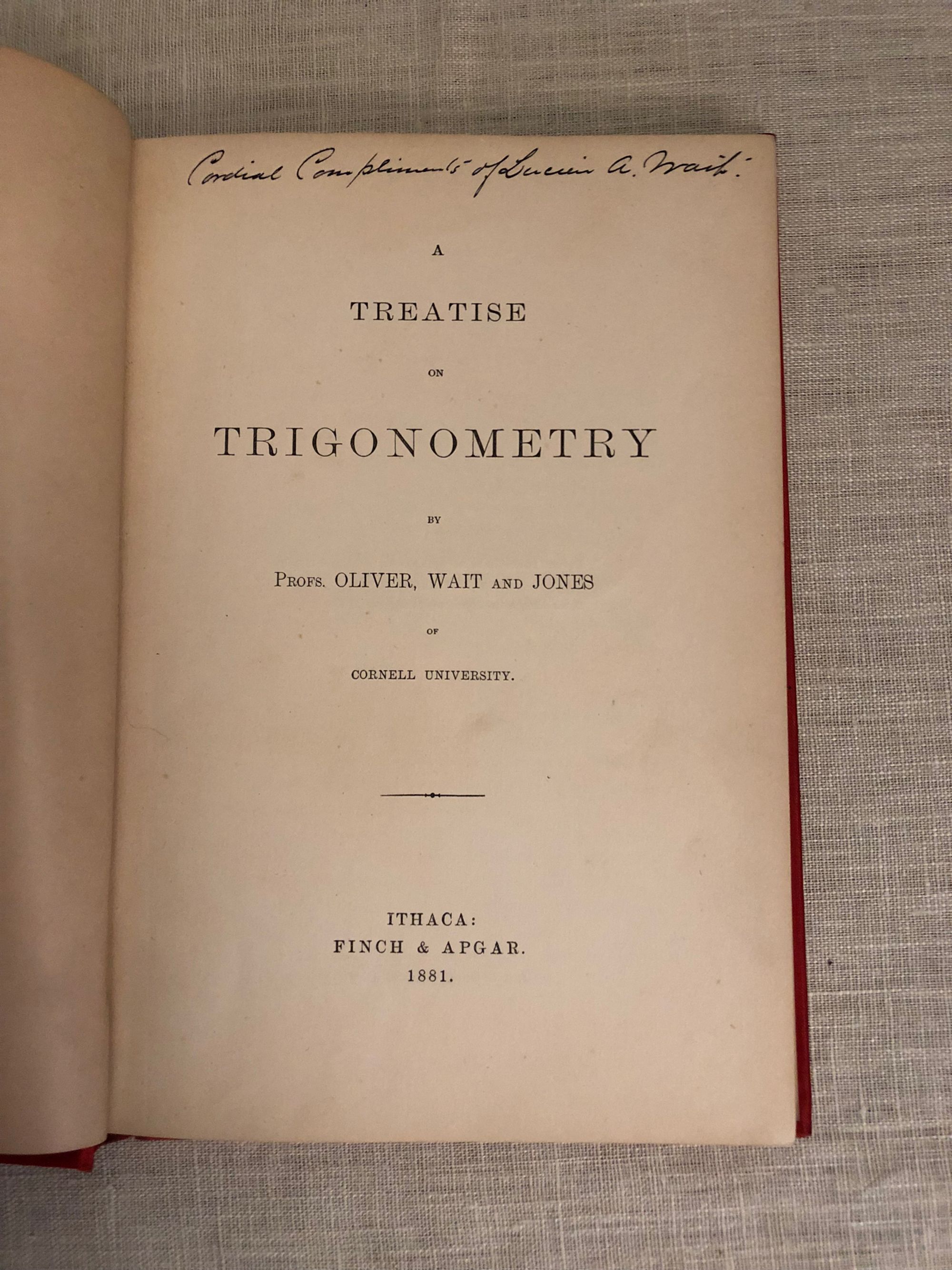Hard cover, 8vo, in red cloth, First Edition, 102pp. Signed by author to title page. Condition: Very Good Minus. Pages age-toned. Some marks to covers. Lucien Augustus Wait (1846-1936) was a Professor of Mathematics at Cornell University. The book covers "Plane Trigonometry" and "Spherical Trigonometry". OCLC 85199547.