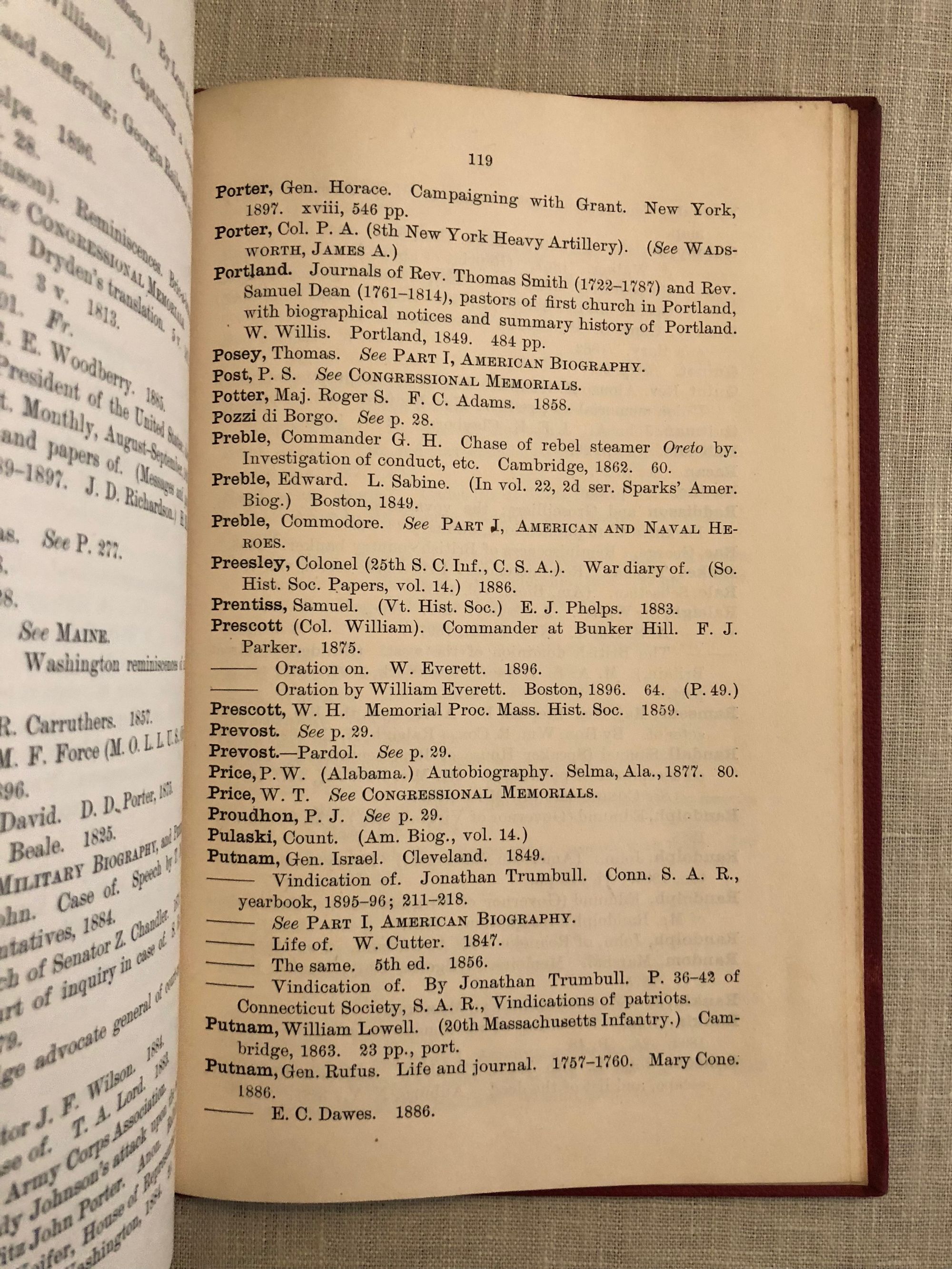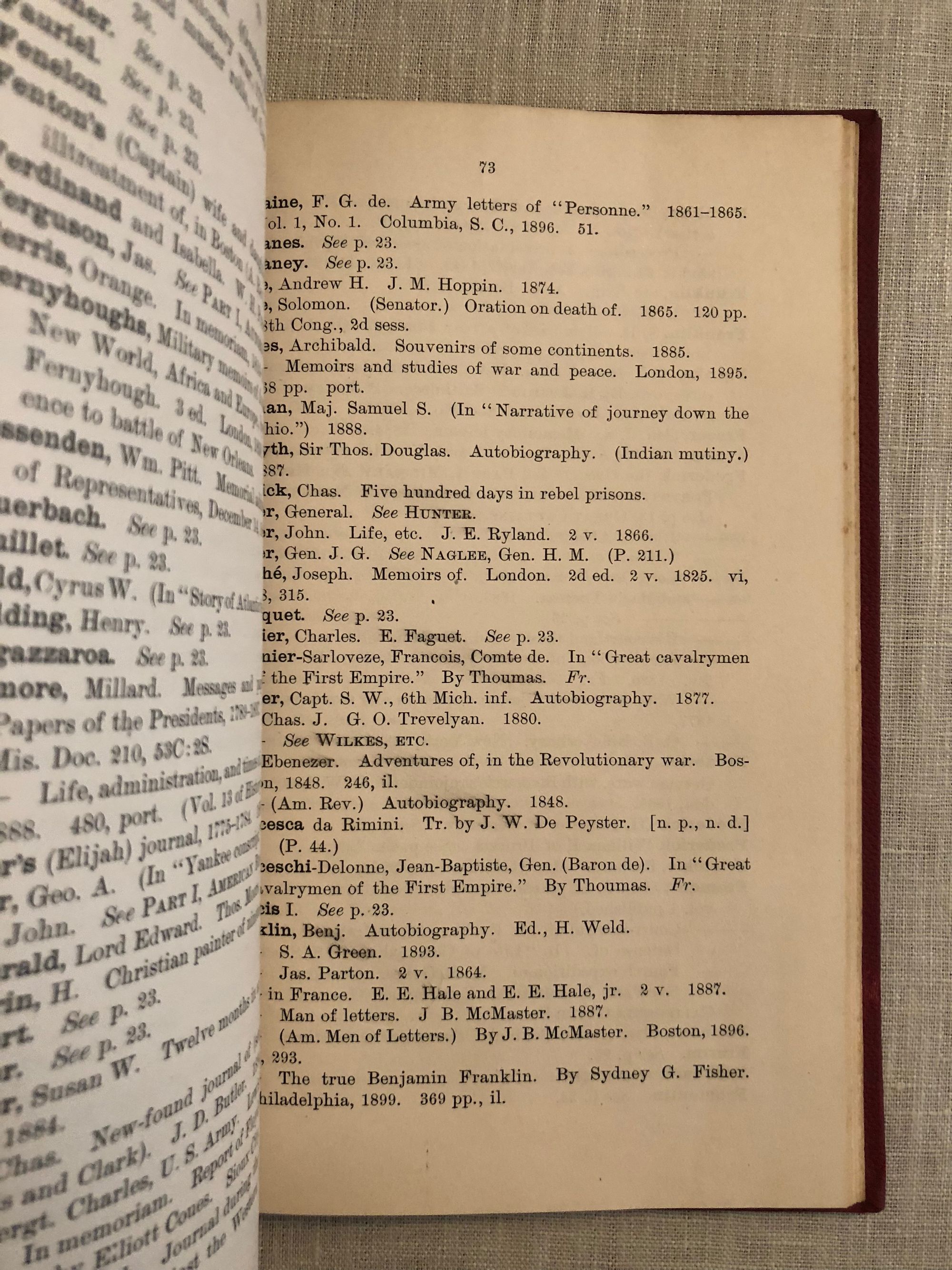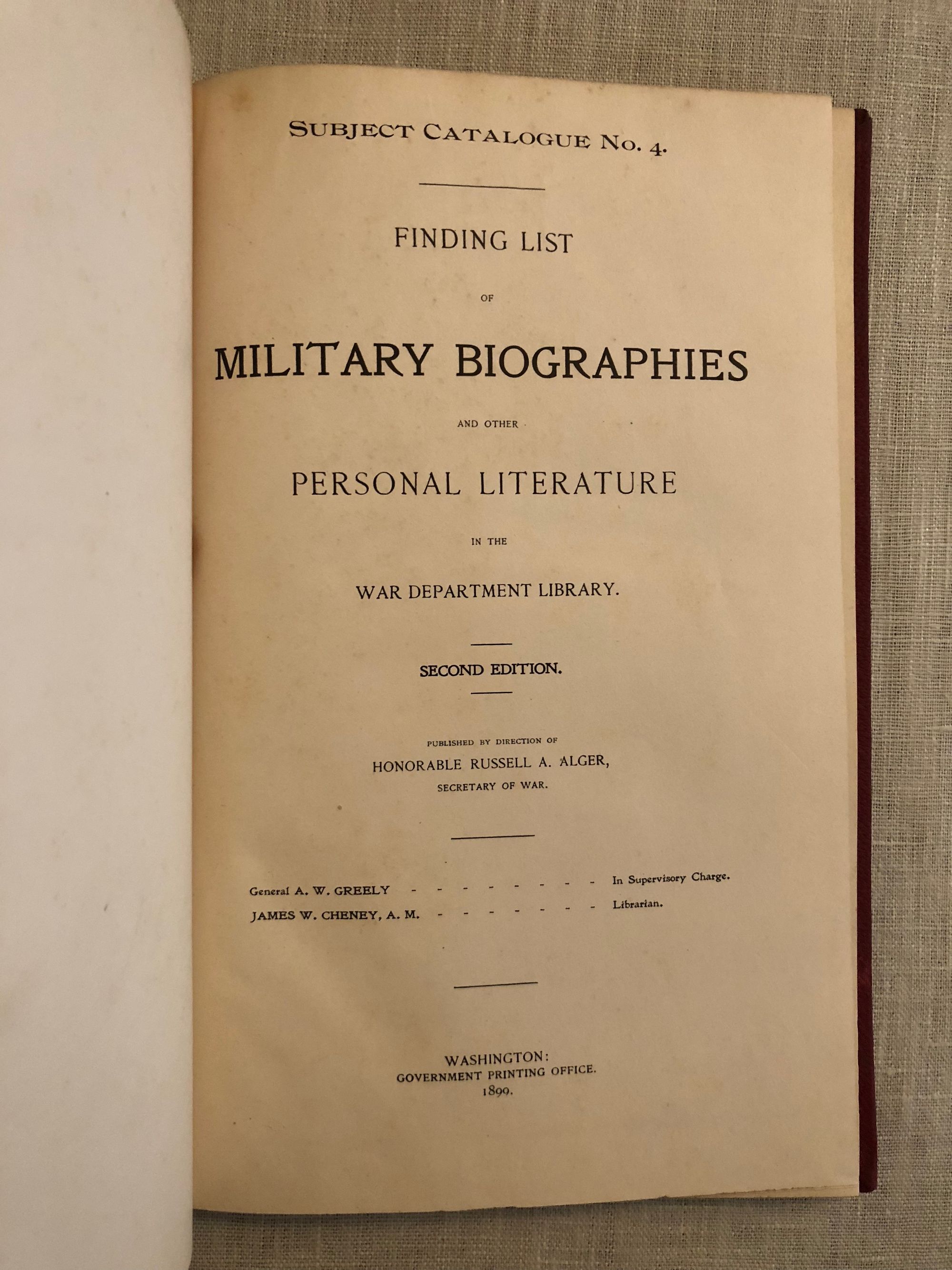 Alger, Russell A.Finding List of Military Biographies and Other Personal Literature in the War Department LibraryPublished by Government Printing Office, Washington DC, 1899.