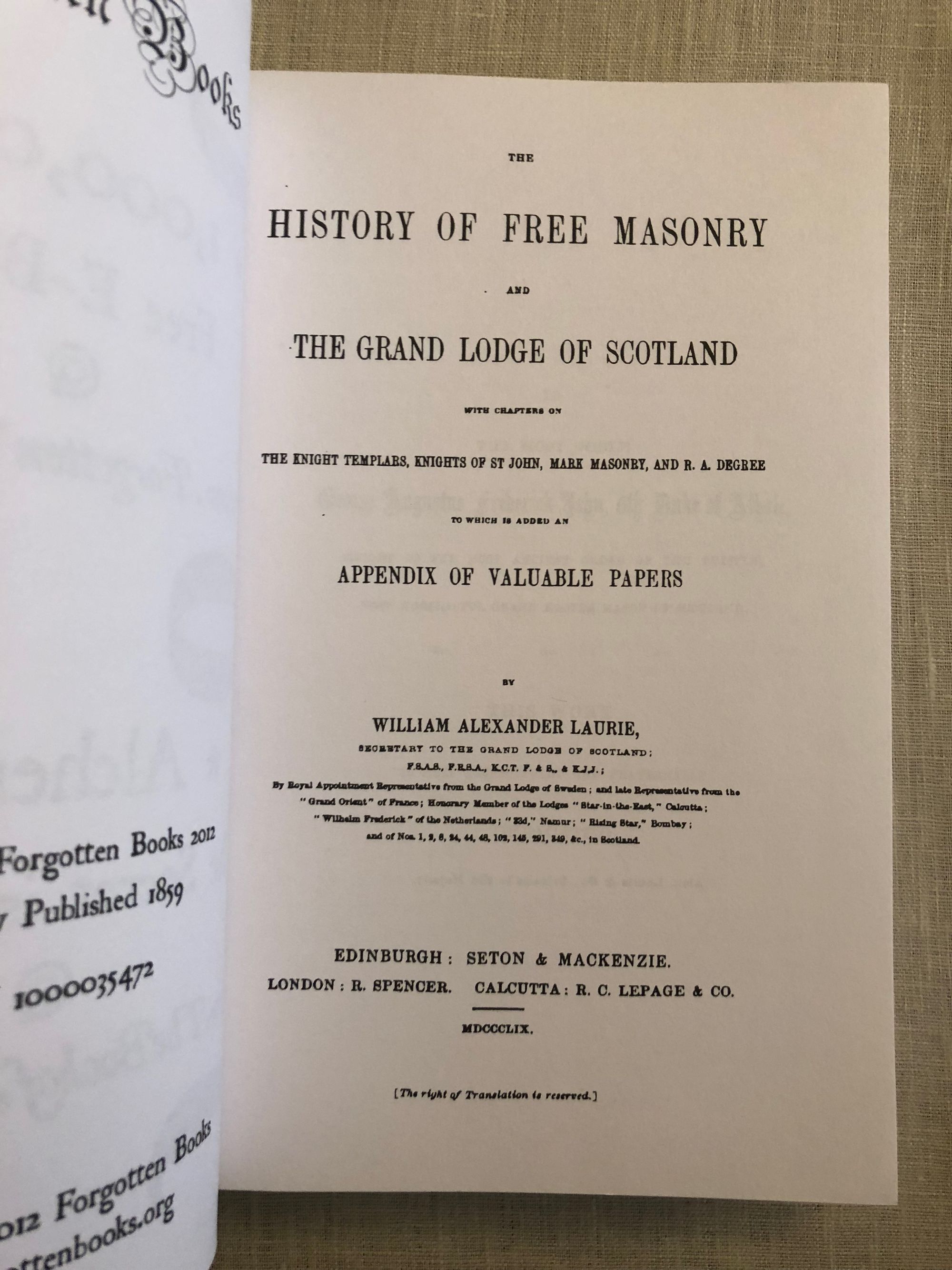 Laurie, William AlexanderThe History of Free Masonry and the Grand Lodge of Scotland, with Chapters on the Knight Templars, Knights of St John, Mark Masonry, and Degree, to Which is Added an Appendix of Valuable Papers.Published by Forgotten Books, London, 2012.
