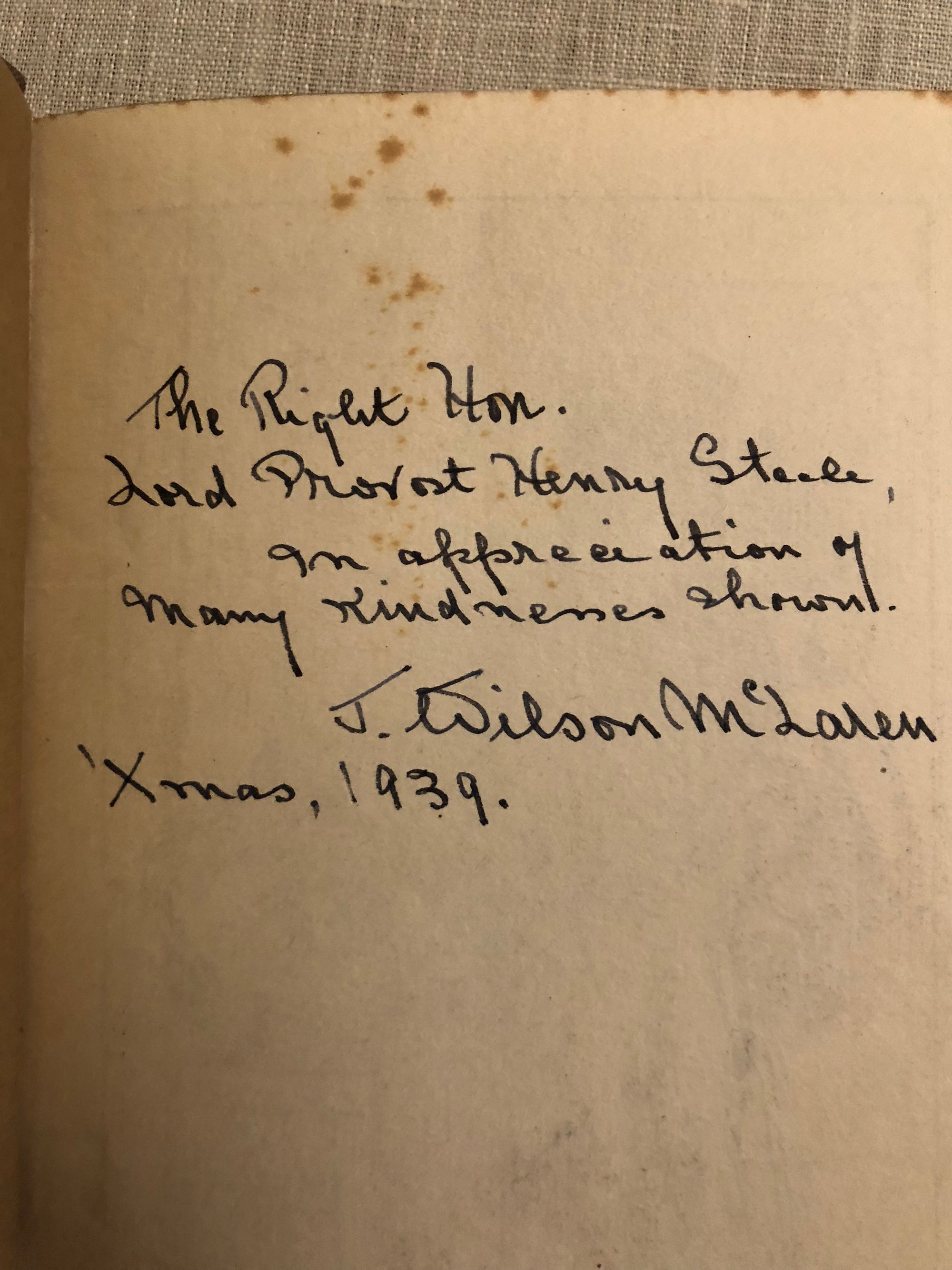 231pp + ads. Presentation copy inscribed by the author on front endpaper to The Right Hon. Lord Provost Henry Steele, who was Lord Provost of Edinburgh from 1938-1941. Foxing to edges of textblock.