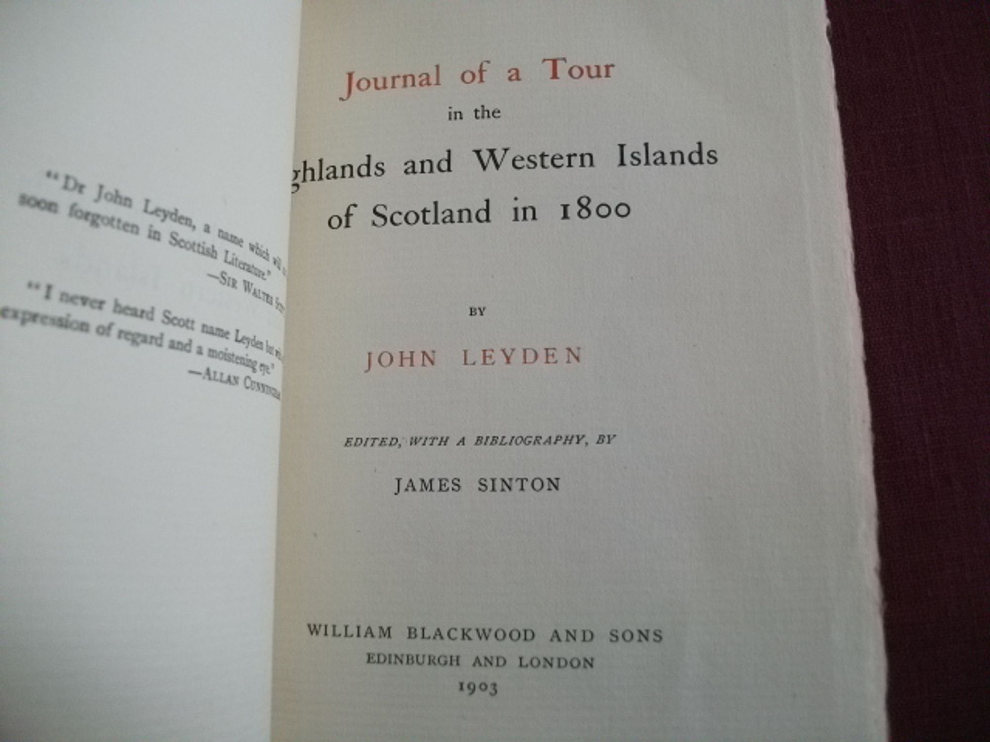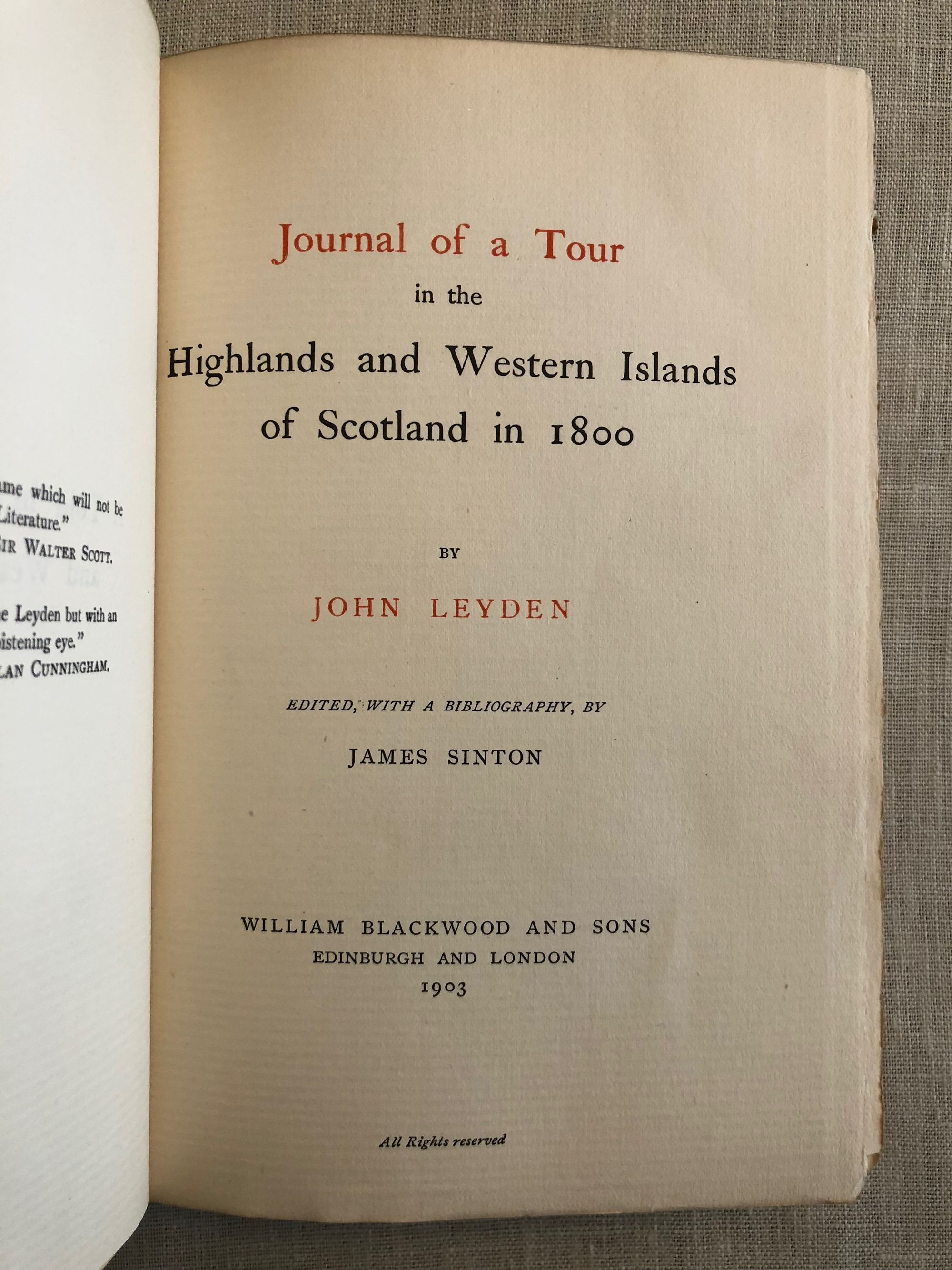 317pp. Journal and letters on a tour of Scotland's Highlands and Western Isles undertaken in 1800 by John Leyden, a Scottish orientalist who worked with Sir Walter Scott in the documentation of folk songs and ballads for Scott's Minstrelsy of the Scottish Border (1802). The editor, James Sinton, also provided a comprehensive bibliography of the works of John Leyden at the back of this book, which was published after the author's death. Sinton inscribed and signed the book of the front free endpaper. Condition: In remarkably fresh condition, with some browning to the endpapers.