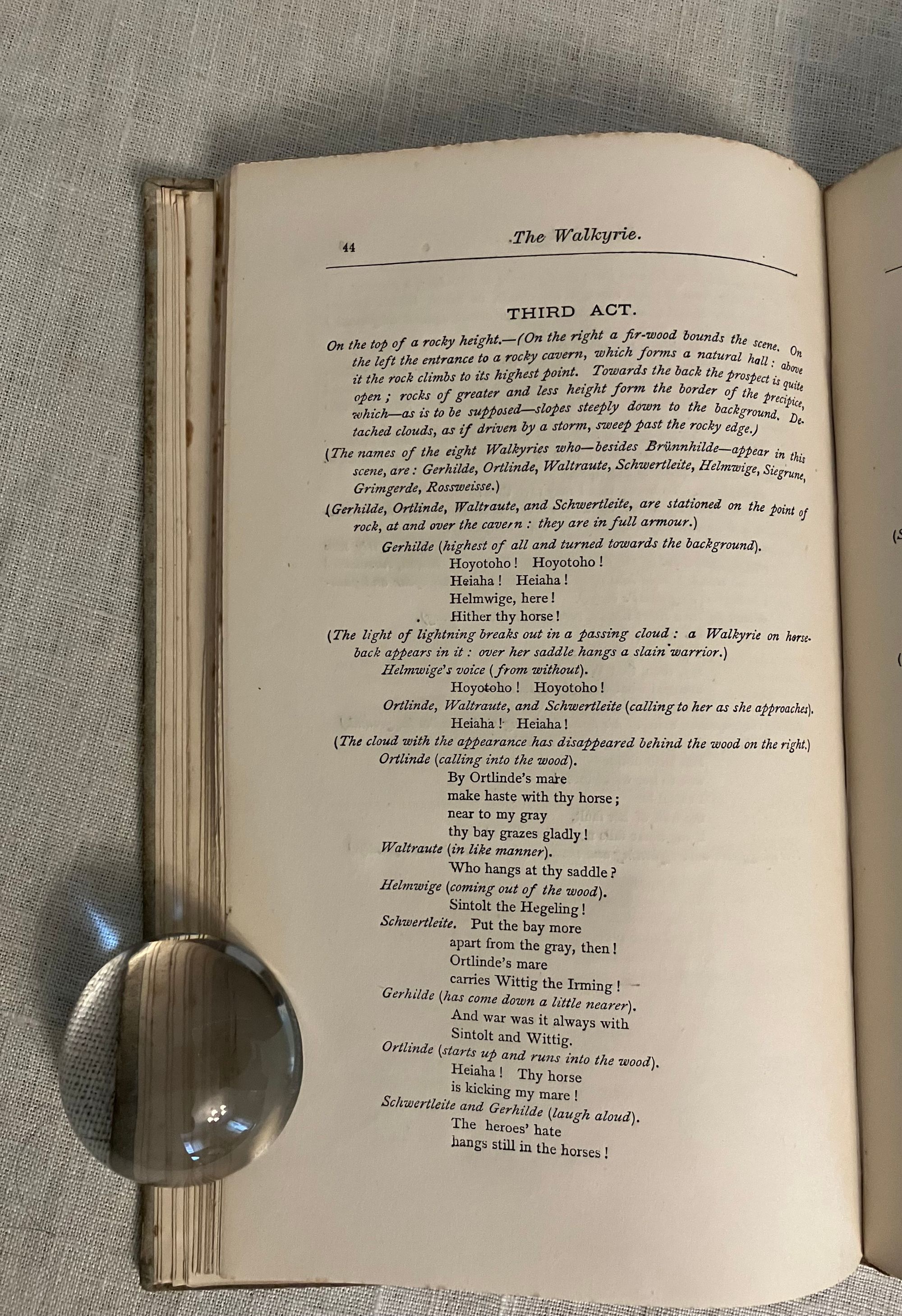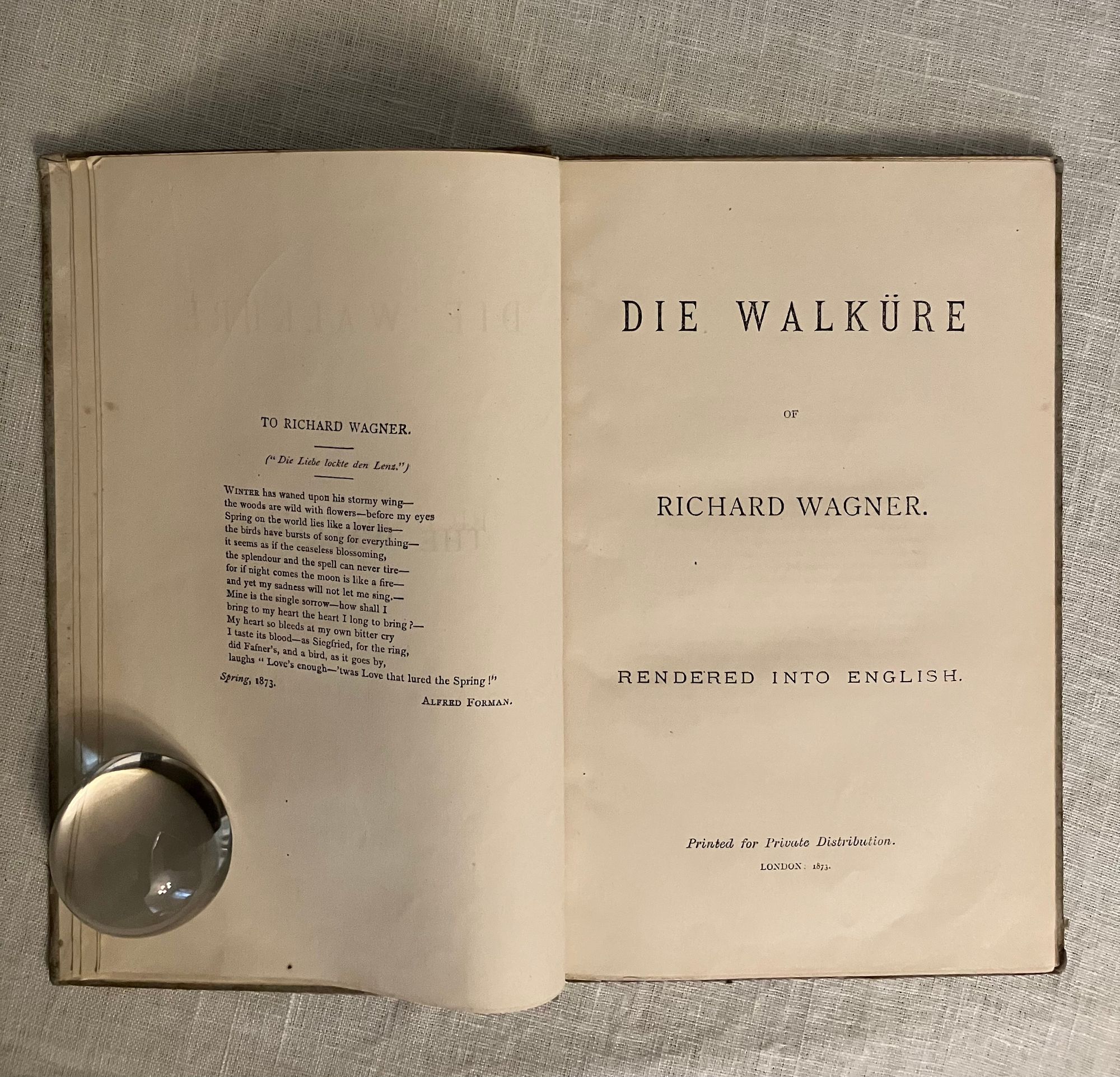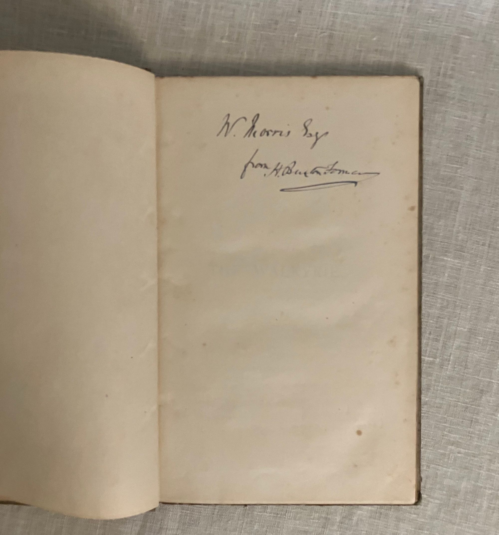 Hard cover, 8vo ( measuring 5 1/2 x 8 3/5 inches), in quarter tan cloth over blue paper-covered boards, re-inforced at the joints, possibly, with a vellum strip, the spine with a printed paper title label, plain cream endpapers. [Alternative title spelling given in page headers.] Collation: [6] 1-61, [3]pp. First edition in English.**CONDITION: Very Good. Exterior of boards show moderate soiling and edge wear. Hinges in order. End papers browned. Very light foxing to prelims at margins, and along all outer edges of text block. Pages are moderately age toned, generally clean. Presentation inscription: " William Morris, Esq. /from H. Buxton Forman" (undated) in old ink to prelim. page.**Morris wrote to Forman thanking him for the book (Collected Letters of William Morris, Vol 1, No. 216). Kelvin records his actual thank you letter for the book in 1873 (as No. 216 in Collected Letters of William Morris, Vol. I) which reads in part: "nor am I much interested in anything Wagner does - his theories on musical matters seem to me as an artist and non-musical man perfectly abhominable (sic): besides I look upon it as nothing short of desecration to bring such a tremendous and world-wide subject under the gaslights of the opera: a most rococo and degraded of all forms of art. I wish to see Wagner uprooted" ( Letters, Vol. I, p. 205) ** HENRY BUXTON FORMAN (1842-1917) , brother of this book's translator, was one-half of the most notorious British book forging partnerships in modern times, with Thomas J. Wise. The relationship between Harry Buxton Forman and William Morris is a fascinating yet convoluted tale. Forman was in initially a bureaucrat at the Royal Mail, then "a failed poet," and an obsessive collector of books and bibliographic detail, which he parlayed into a second career as a contributor of literary criticism and editorial services to some of the big-name authors of the day, including John Keats and Percey Shelley. His articles for Tinsley's Magazine, entitled "Our Living Poets" brought him to the notice of Dante Gabriel Rossetti and others of the Pre-Raphaelite circle whom he had written about. Forman did have a legitimate working relationship with Morris, as described by biographer John Collins in his book, The Two Forgers (1992): "William Morris was clearly a specialty, as Swineburne was of Wise. Forman had been on nodding, if not intimate, terms with William Morris for some twenty-five years: he was known as a keen and punctilious collector of his works, and as a useful literary type who could safely be entrusted with a set of proofs to read. He certainly admired Morris greatly, so it was in the natural course of things that he would write the standard bibliography and forge the productions of his hero." (p. 132) It is estimated that up to ten percent of the pamphlets and other shorter works listed in The Books of William Morris, edited by H. Buxton Forman (1897) were, in fact, forged or pirated, which the book then "authenticated". OCLC 753144914. RARE--only three copies shown in libraries in the U.S and Britain.