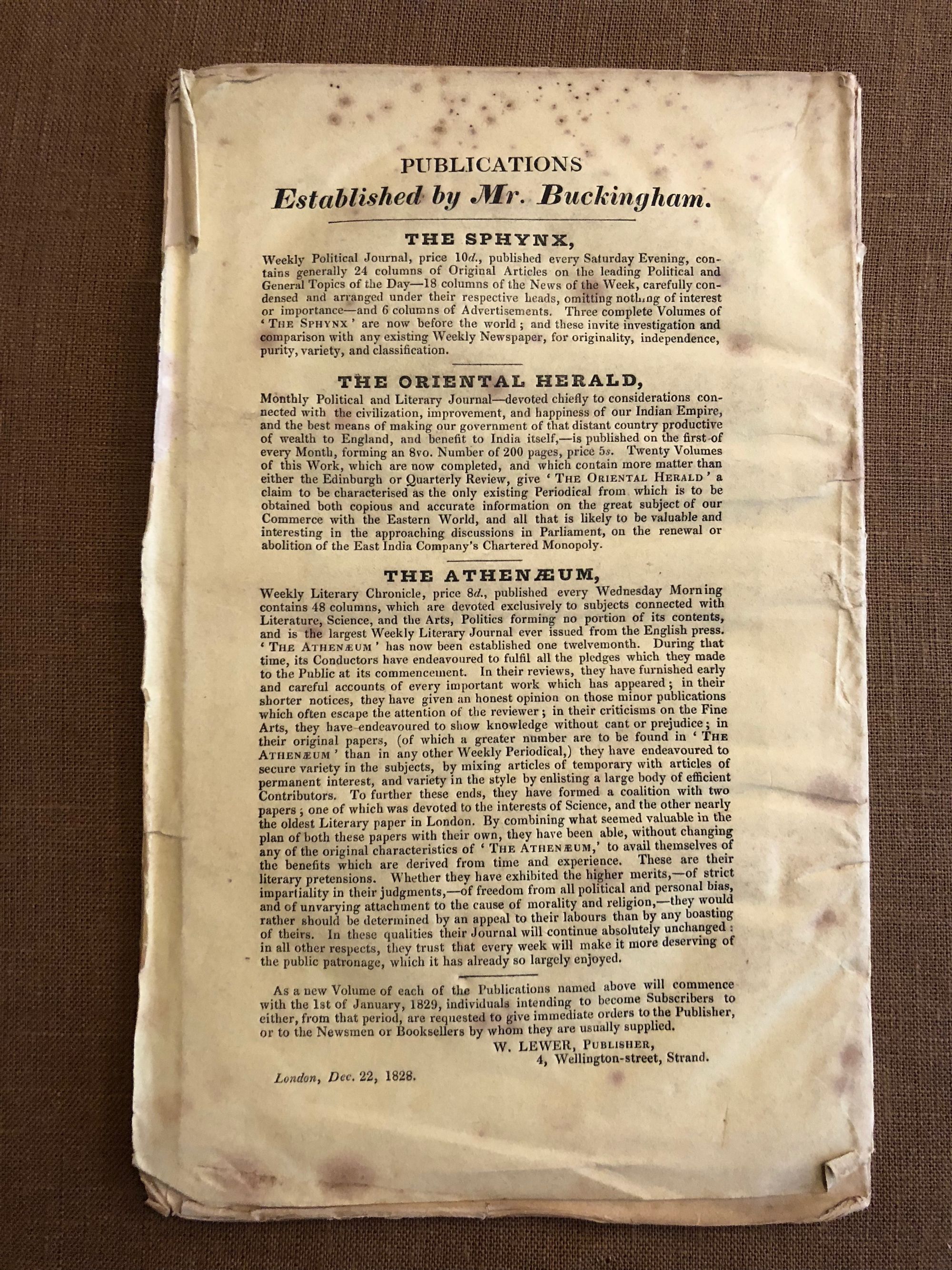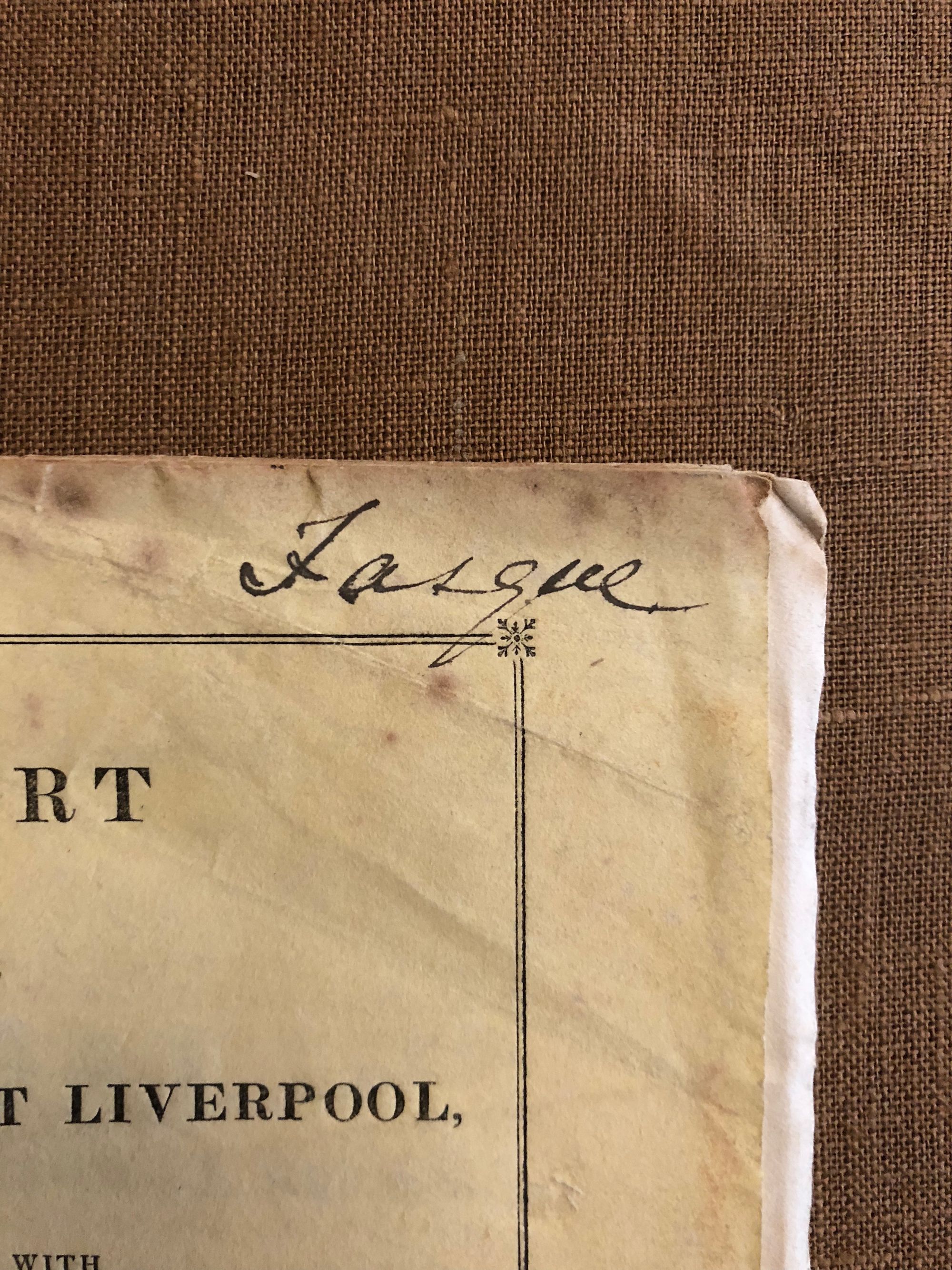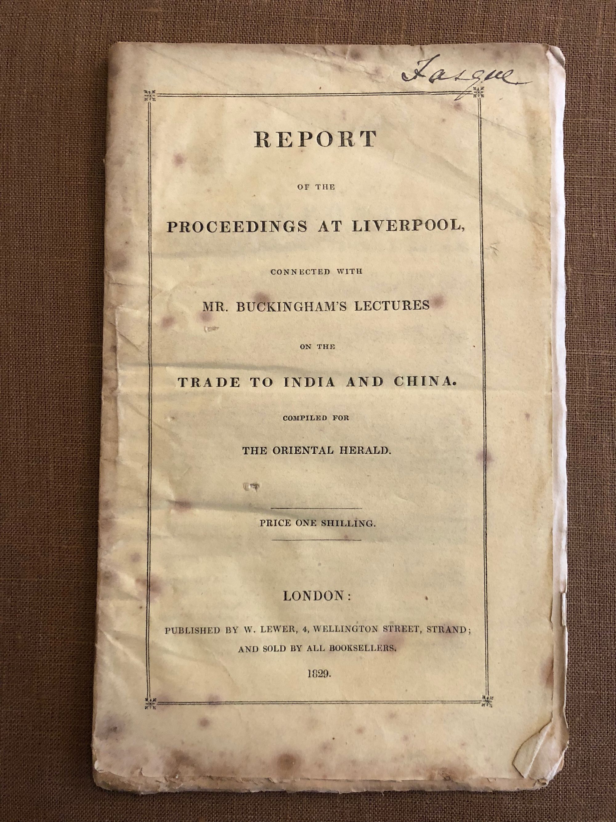 Buckingham, James Silk; Gladstone, John (owner)Report of the Proceedings at Liverpool, Connected with Mr Buckingham's Lectures on the Trade to India and China. Compiled for the Oriental Herald.Published by W.Lewer, London, 1829.Signed by Fasque (owner's signature)First Edition