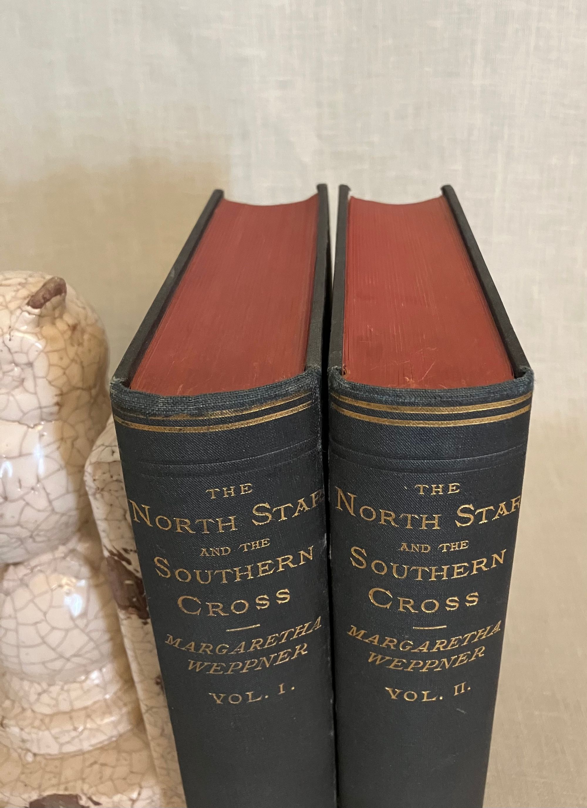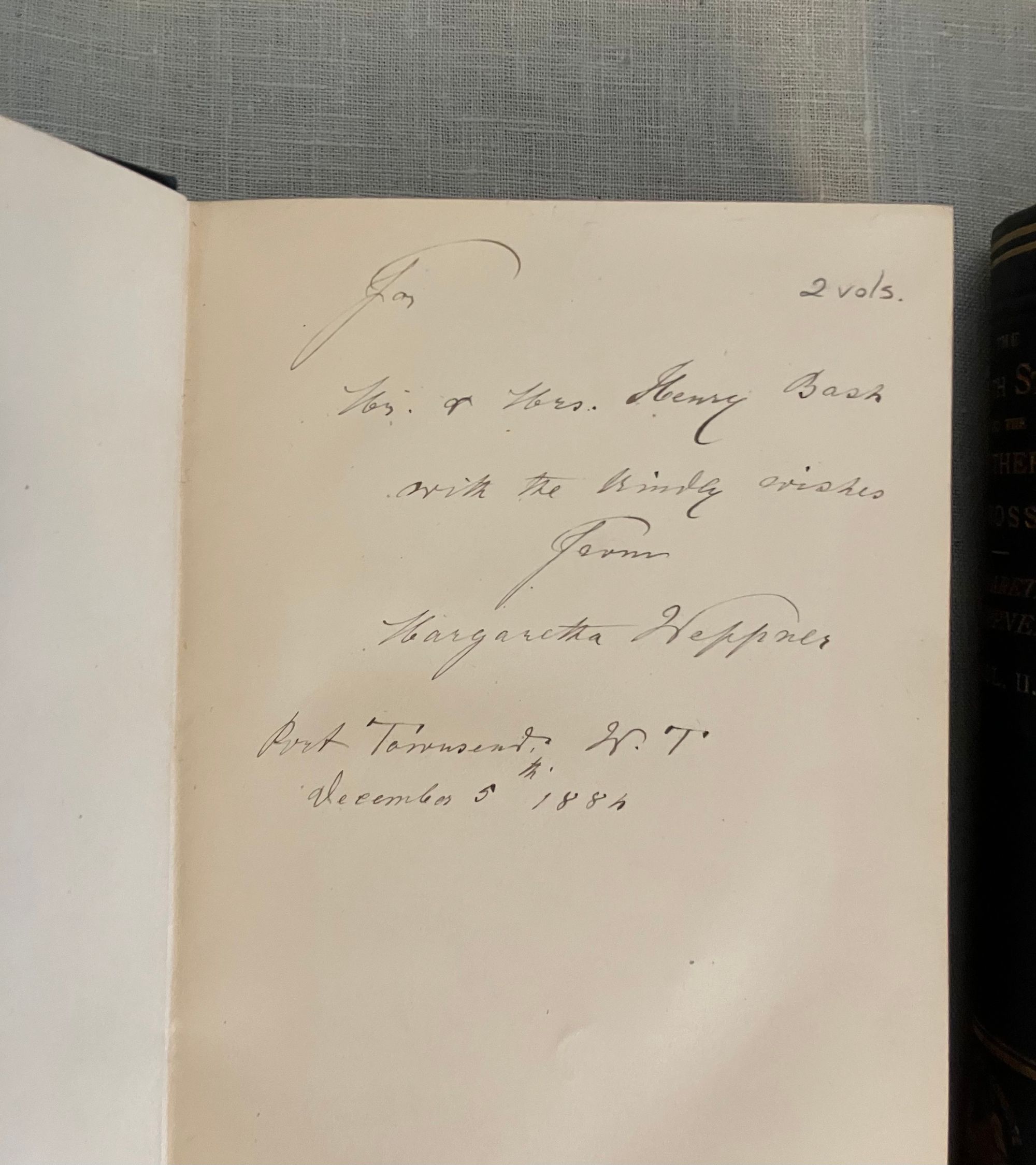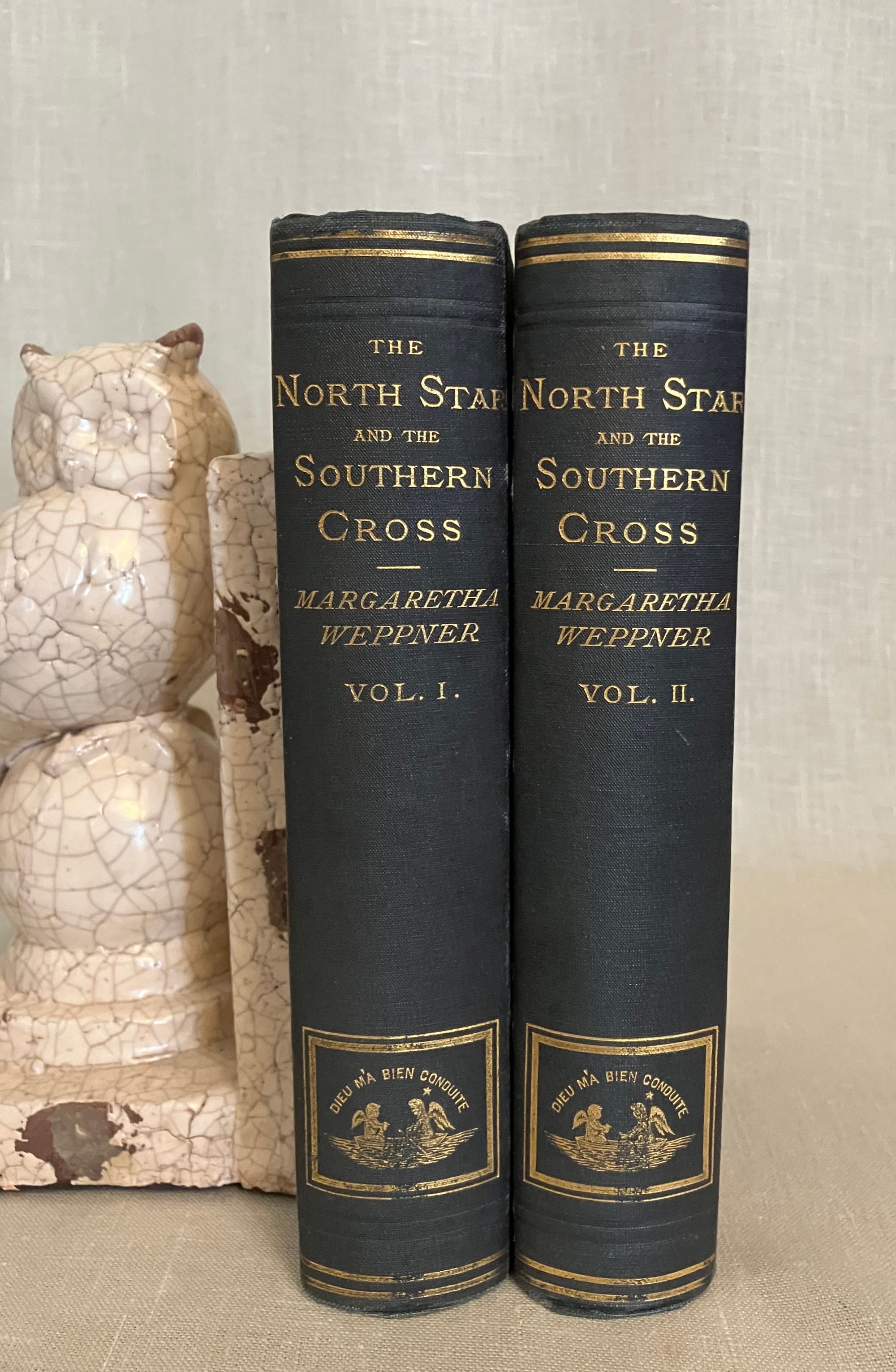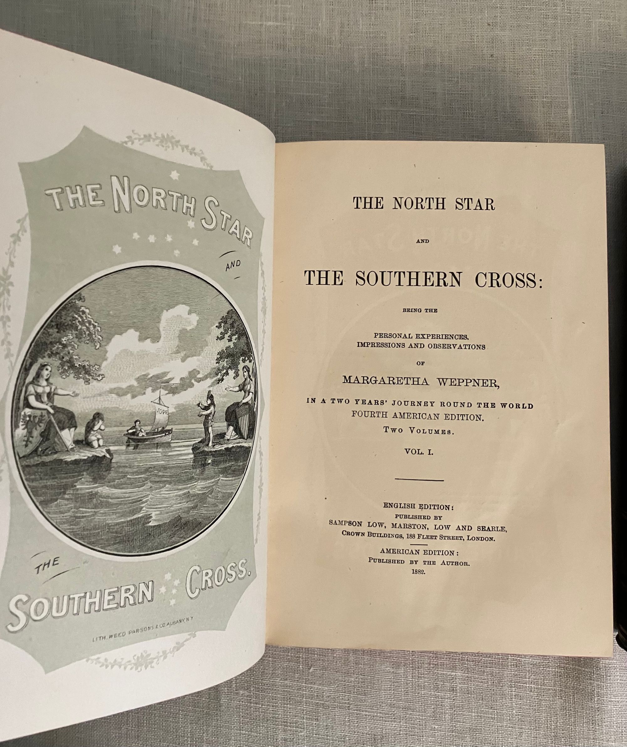 Fourth American Edition. Hard cover, in blue decorated cloth gilt, pp x + 505; vii + 504 + ads. Inscribed by Weppner to front free endpaper: "To Mr & Mrs Henry Bush, with the kindly wishes from Margaretha Weppner. Port Townsend, December 5th, 1884". Weppner was a German language teacher who sailed from France to the US in 1869, thence to Japan, China, Saigon, Singapore, Java and Batavia, then back to Singapore, Calcutta, Delhi, Bombay, Suez, Cairo, Alexandria and finally back to Munich, Germany. Henry Bush, to whom the book is inscribed, was the United States Shipping Commissioner at Port Townsend. Condition: almost Fine, with light shelfwear to the covers, and light rubbing to the spine gilt.