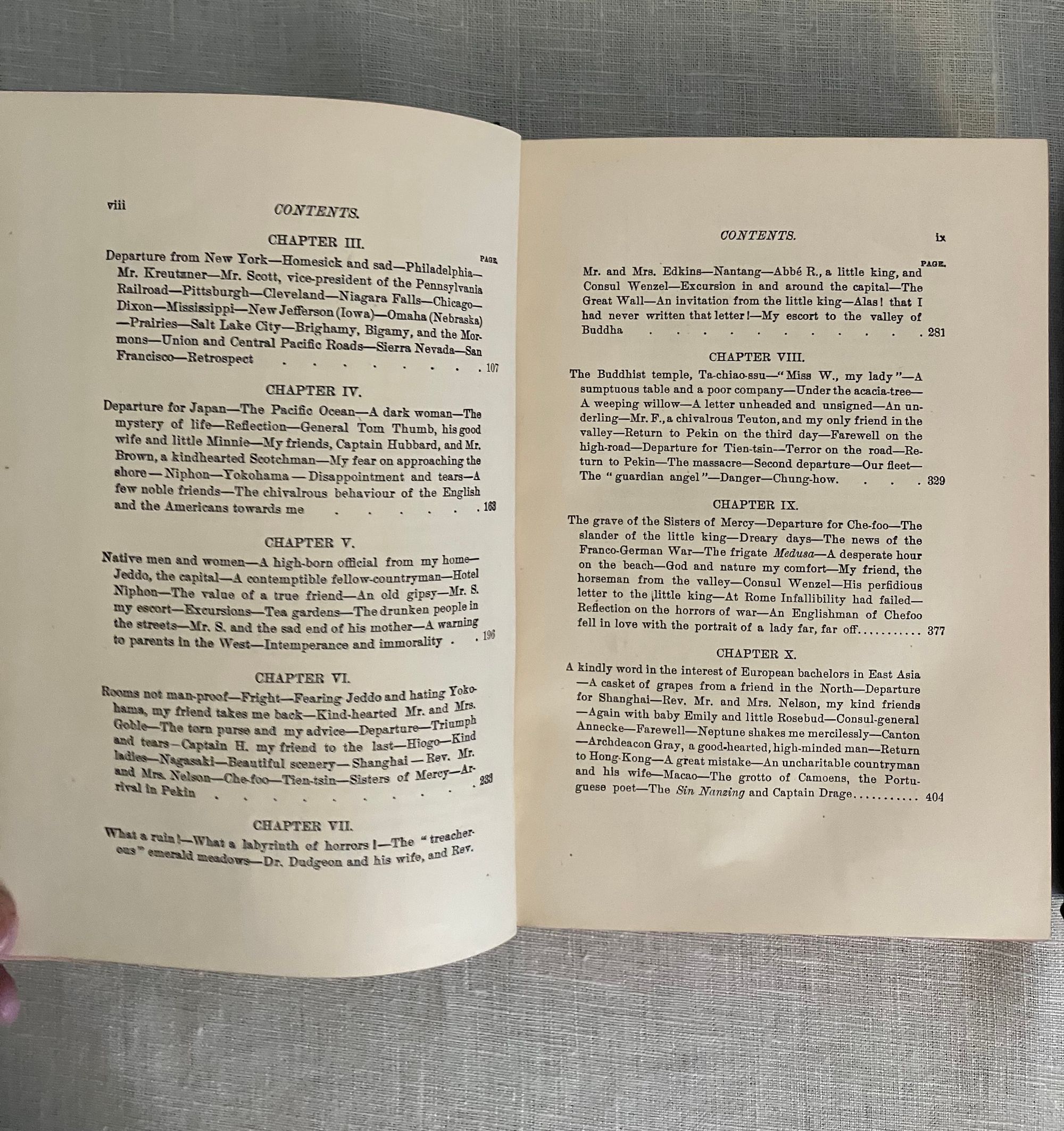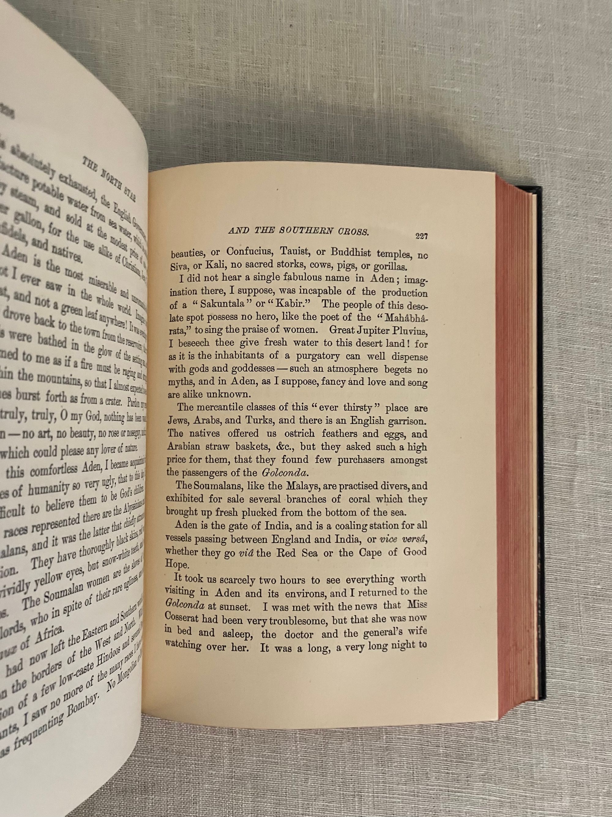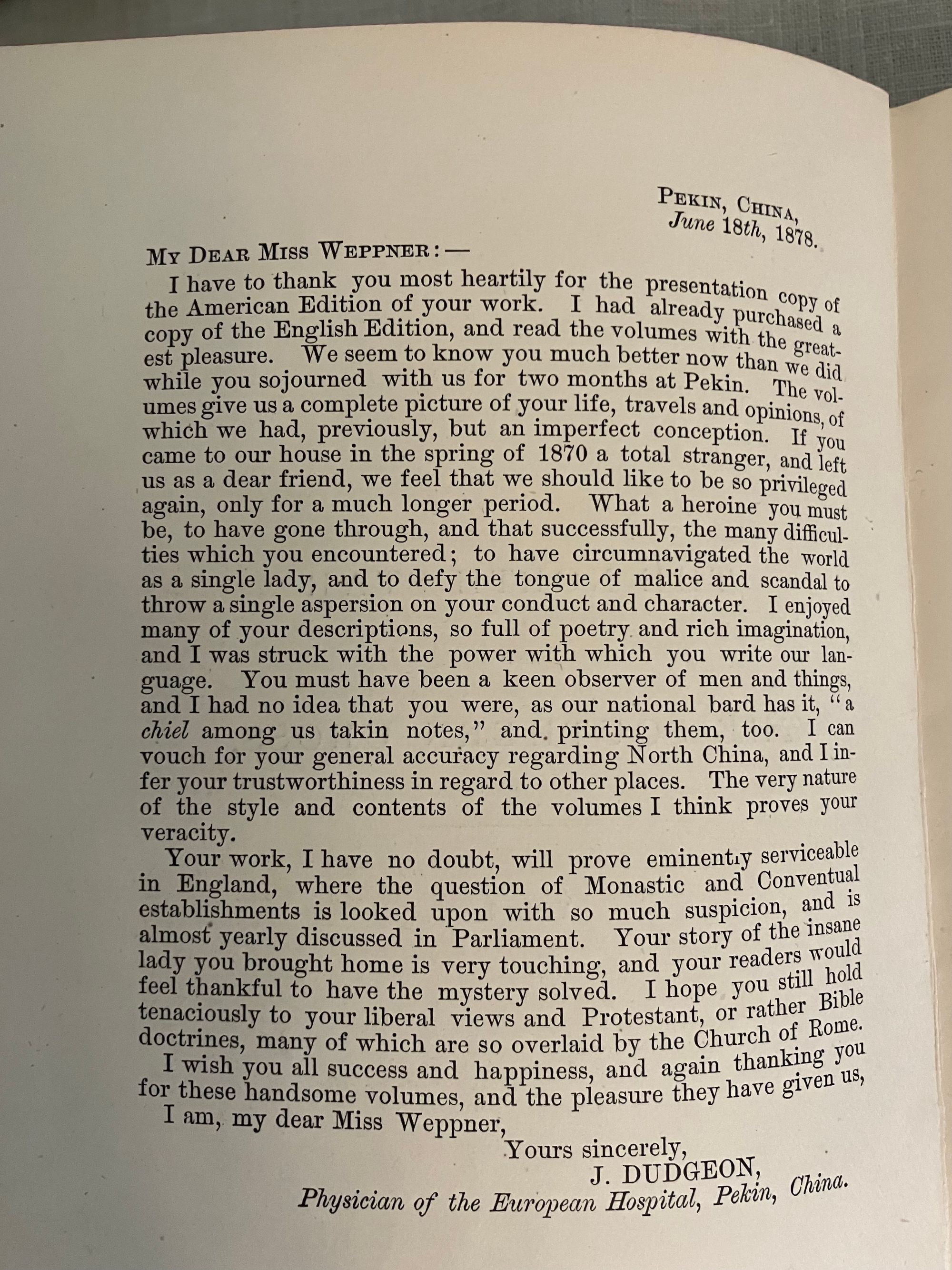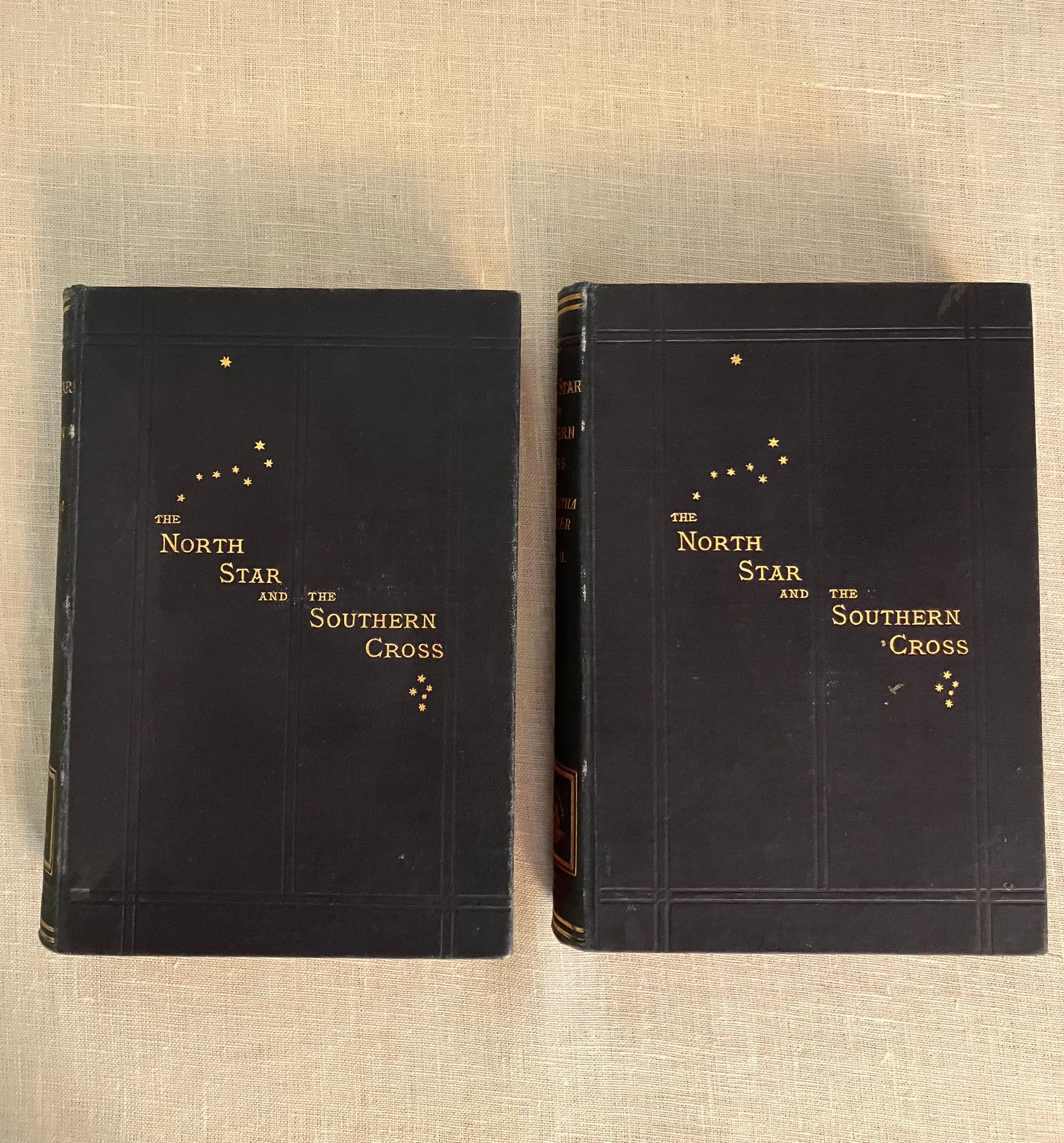 Fourth American Edition. Hard cover, in blue decorated cloth gilt, pp x + 505; vii + 504 + ads. Inscribed by Weppner to front free endpaper: "To Mr & Mrs Henry Bush, with the kindly wishes from Margaretha Weppner. Port Townsend, December 5th, 1884". Weppner was a German language teacher who sailed from France to the US in 1869, thence to Japan, China, Saigon, Singapore, Java and Batavia, then back to Singapore, Calcutta, Delhi, Bombay, Suez, Cairo, Alexandria and finally back to Munich, Germany. Henry Bush, to whom the book is inscribed, was the United States Shipping Commissioner at Port Townsend. Condition: almost Fine, with light shelfwear to the covers, and light rubbing to the spine gilt.