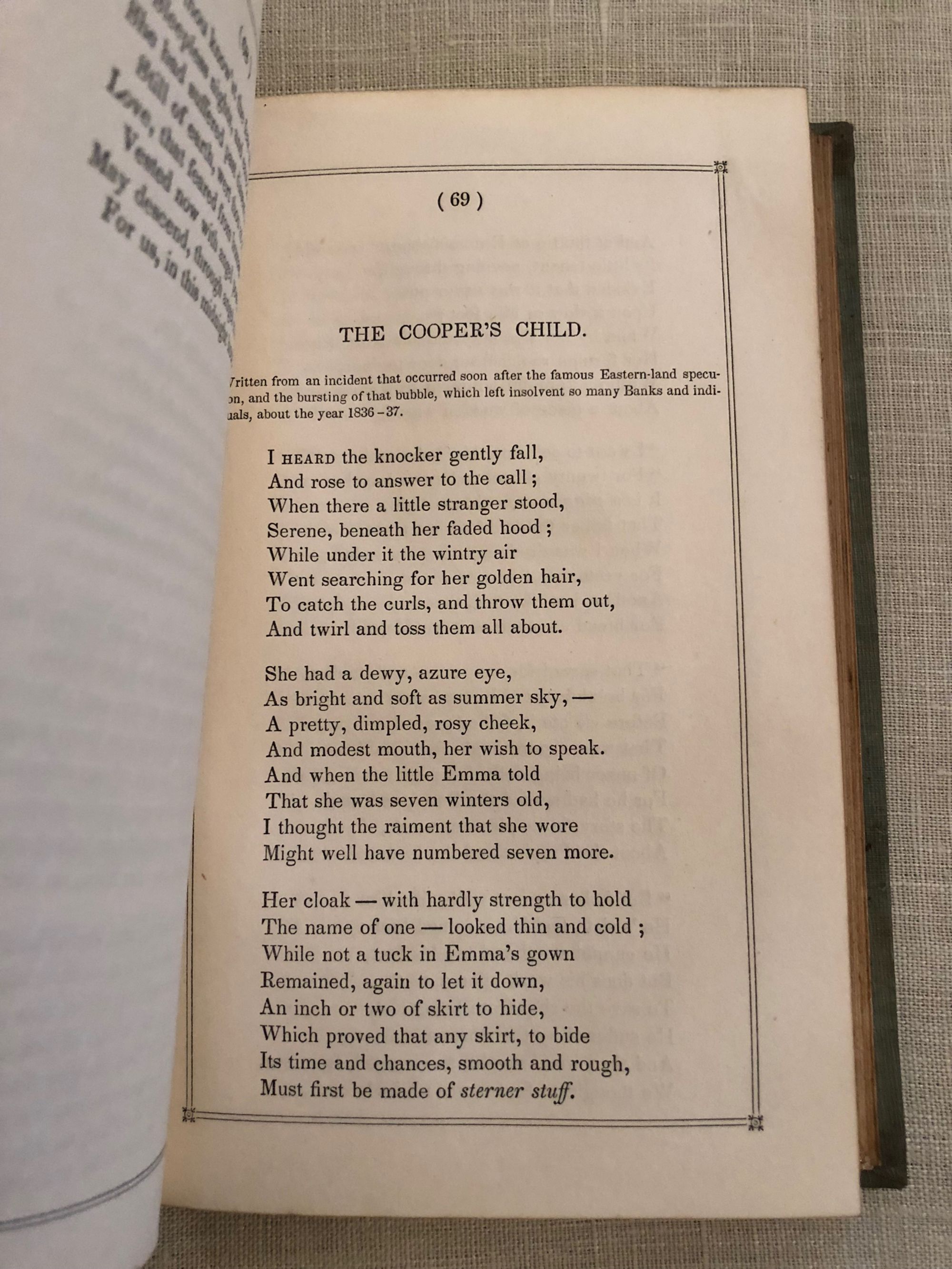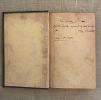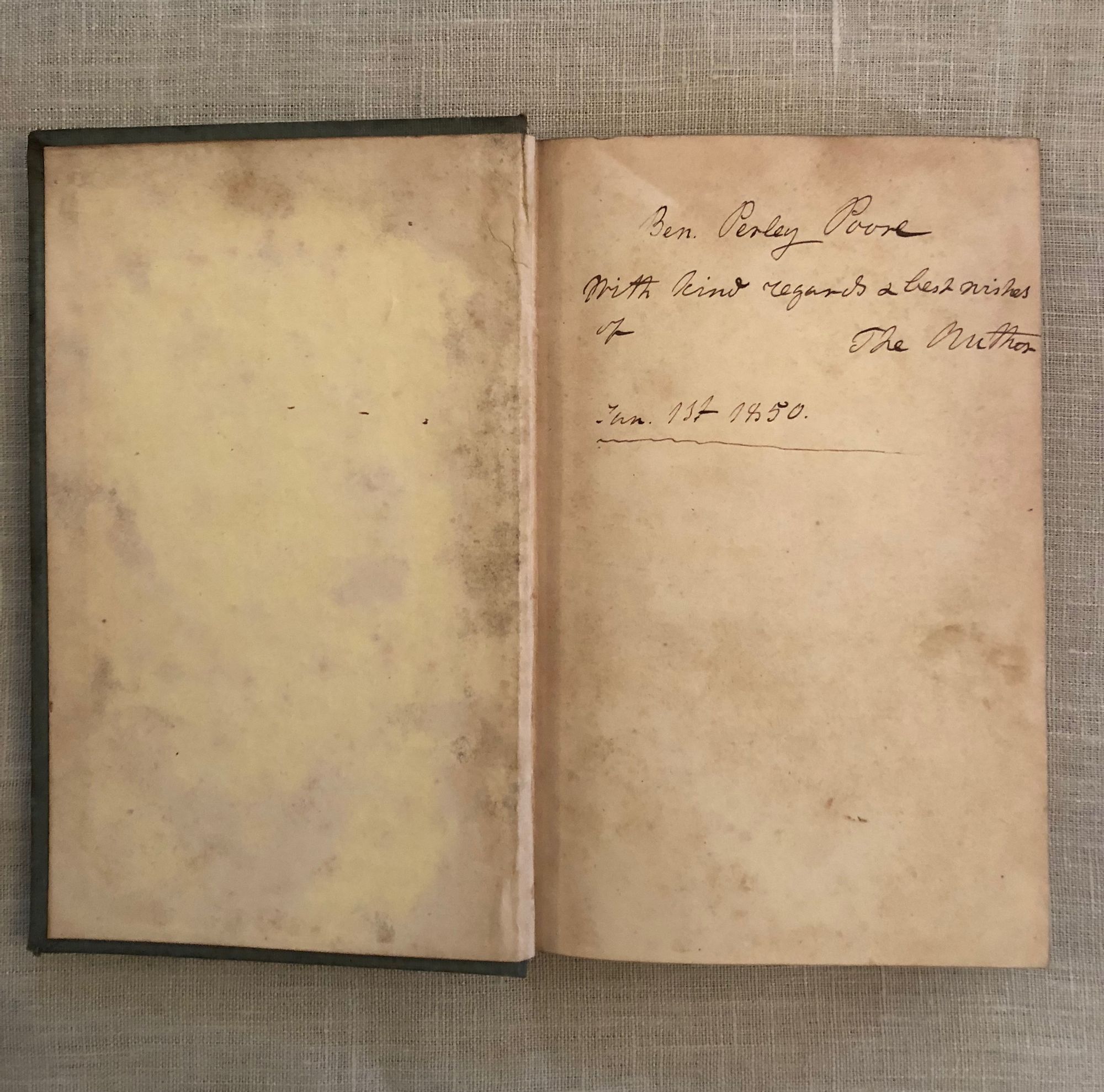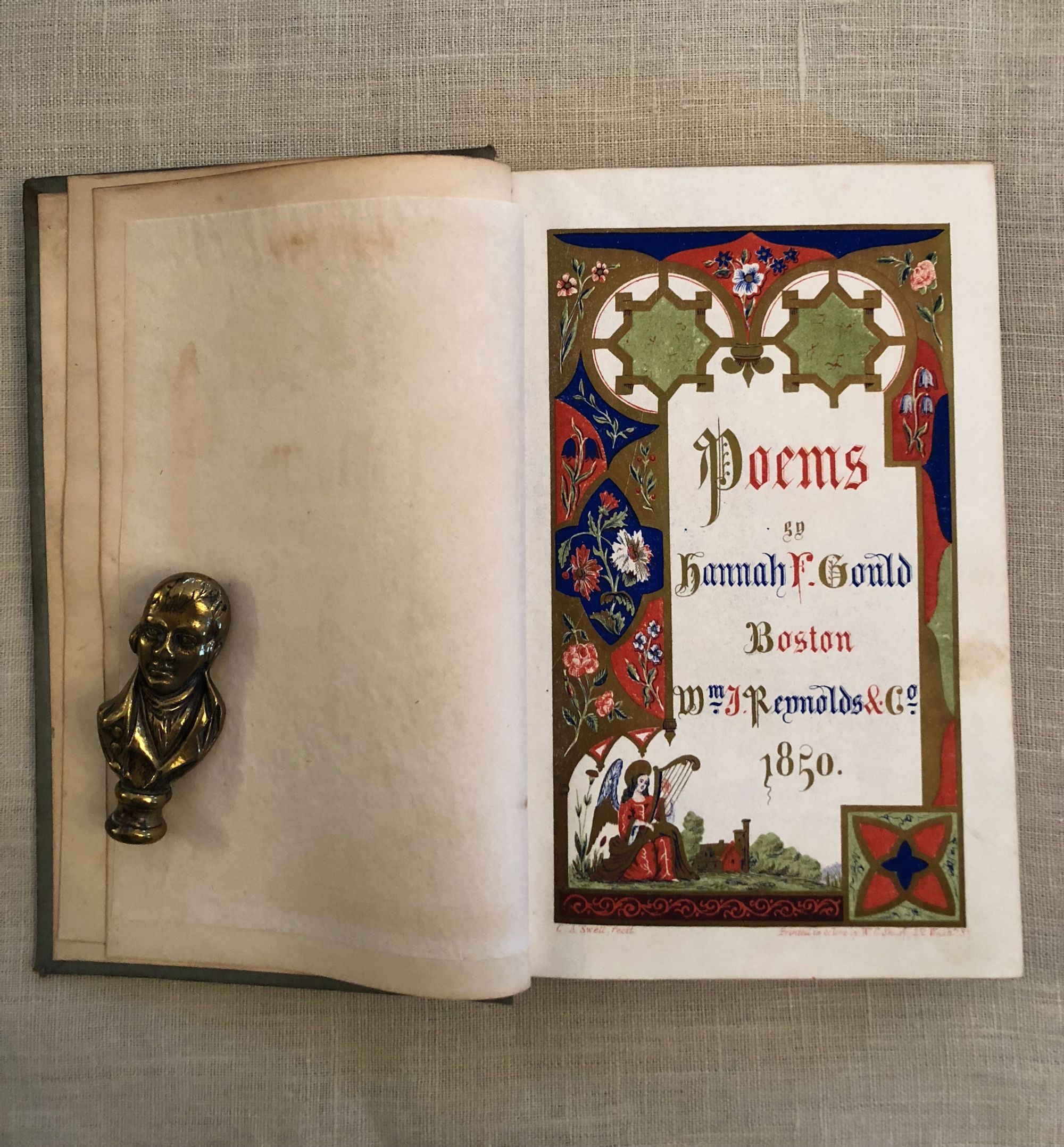 Hard cover, 8vo., (4 3/4 inches x 7 1/4 inches) in green cloth with ornate gilt floral design blocked to both boards, 287pp., Presentation Copy, with pen inscription to ffep.: "Ben: Perley Poore with kind regards and best wishes of the Author, Jan. 13th, 1850." Chromolithographed title page. Condition: overall about Good, but with significant damage to surface of spine. Otherwise, boards are dust soiled, with light wear to corners. Lightly age-toned interior, with text block tight. Occasional soiling, and top edge staining to a few interior pages. Splendidly bright four-color title page illuminated in gold, with original tissue guard. *** HANNAH FLAGG GOULD (1789-1865) was a popular poet in her time, residing in Newburyport for more than fifty years at 23 Charter Street, a three story brick Georgian home located only a couple of blocks away from this bookseller. She published eleven volumes of poetry, ranging in topic from verses on childhood and domestic topics, but also on political and patriotic themes. She spent her adulthood caring for her father Benjamin, a Revolutionary War veteran of the Battle of Lexington; a couple of the poems in this volume concern the Revolutionary War, e.g. "The Battle of Lexington," and " The Warriors's Return." She was also a contributor to Newburyport abolitionist William Lloyd Garrison's anti-slavery newspaper, The Liberator. (Garrison's birthplace was only a few blocks away from the Goulds'.) The snap of clipper ship sails and the sounds of hammering from shipyards along the Merrimack come alive in a few of Hannah Gould's poems in this volume: in particular "The Launch" and "The Last Shipwreck." Edward Monroe Bacon, in his 1902 book, Literary Pilgrimages in New England, gives a detailed exposition of the rich political and literary history of the Newburyport area, as does J.J. Currier in the standard work, Ould Newbury: Historical and Biographical Sketches (1896.) *** BENJAMIN PERLEY POORE, (who signed his name Ben: Perley Poore,) born in Newburyport, Massachusetts in 1820, was laterly a nationally-known journalist and political commentator of the mid nineteenth century. He founded and was the first president of the Grid Iron Club in Washington DC. as well as serving various quasi-political positions such as Clerk of the Senate Committee on Printing and Clerk of the Committee on Foreign Relations. In these roles he had the access to, and familiarity with, many of the notable political figures of the day: his two-volume Perley's Reminiscences of Sixty Years in the National Metropolis (1886) makes entertaining reading. John J. Currier (noted above) gives an more in-depth sketch of Poore's early years, in which one is struck the sheer variety of opportunity available to men of talent in this age. How indeed, one wonders, did a lad expelled from his prep school for bad behavior, go on such a variety of worthy endeavors: foreign attache at Brussels whilst simultaneously acting as foreign correspondent for a Boston newspaper; authorized by the Massachusetts legislature to bring home ten volumes-worth of documents from Paris pertaining to the conduct of the American Revolution; Major and Lieutenant Colonel of the Sixth Massachusetts Regiment during the Civil War. He also famously lost a bet about presidential candidate Millard Fillmore winning more votes in Massachusetts than his opponent, John Fremont. In payment of the wager he was required to push a wheelbarrow of apples from his home at Indian Hill Farm to Boston. An illustrated broadside with song entitled "The Wheelbarrow Polka" was published on the occasion. OCLC 4953785.
