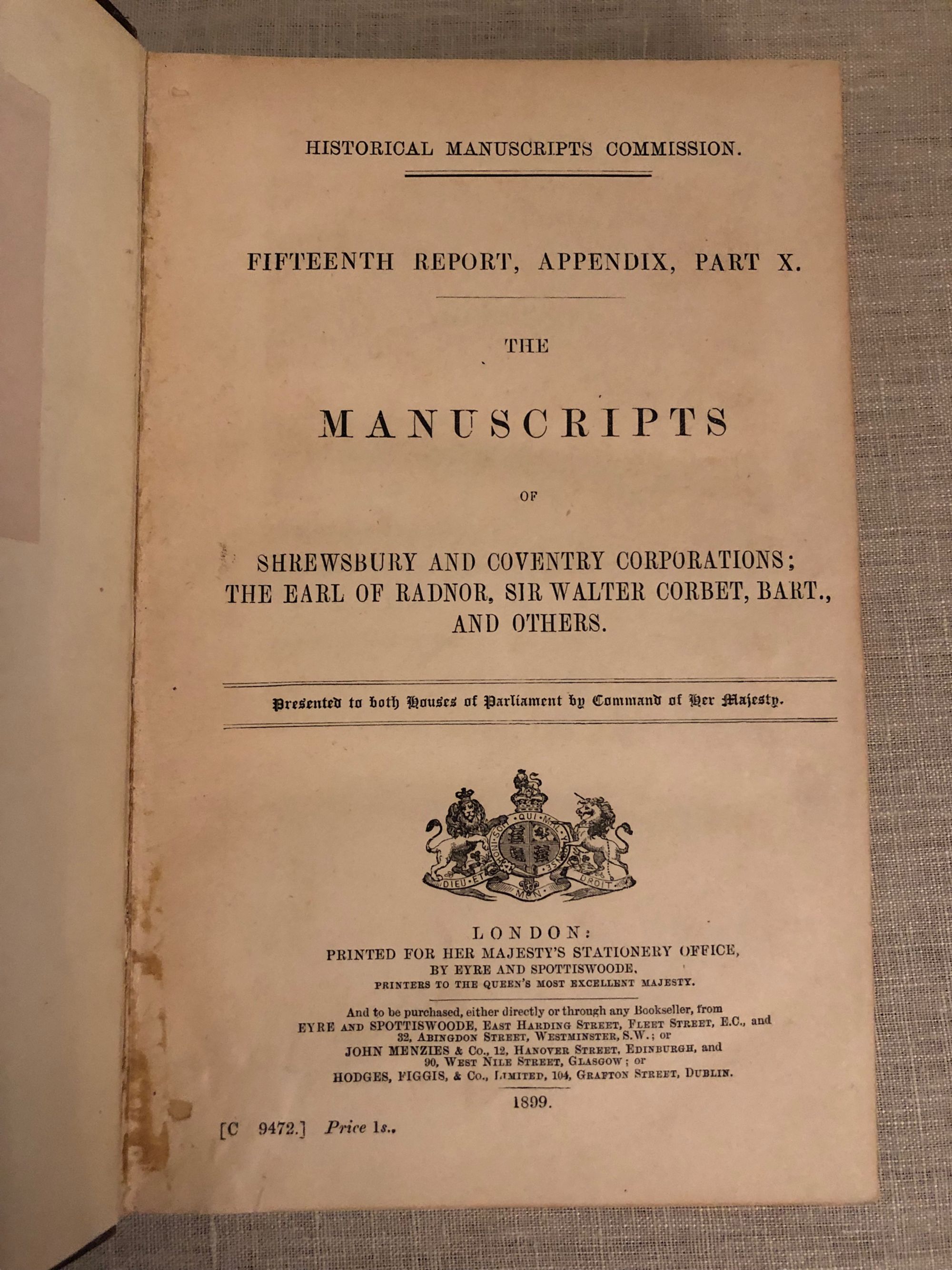 variousHistorical Manuscripts Commission. Thirteenth Report, Appendix, Part IV. The Manuscripts of Rye and Hereford Corporations. Tenth Report, Appendix, Part IV. The Manuscripts of The Earl of Westmorland. Eight Report. Fifteenth Report, Appendix, Part X. The Manuscripts of Shrewsbury and Coventry Corporations; The Earl of Radnot, Sir Walter Corbet. (4 vols)Published by HMSO, London, 1906.