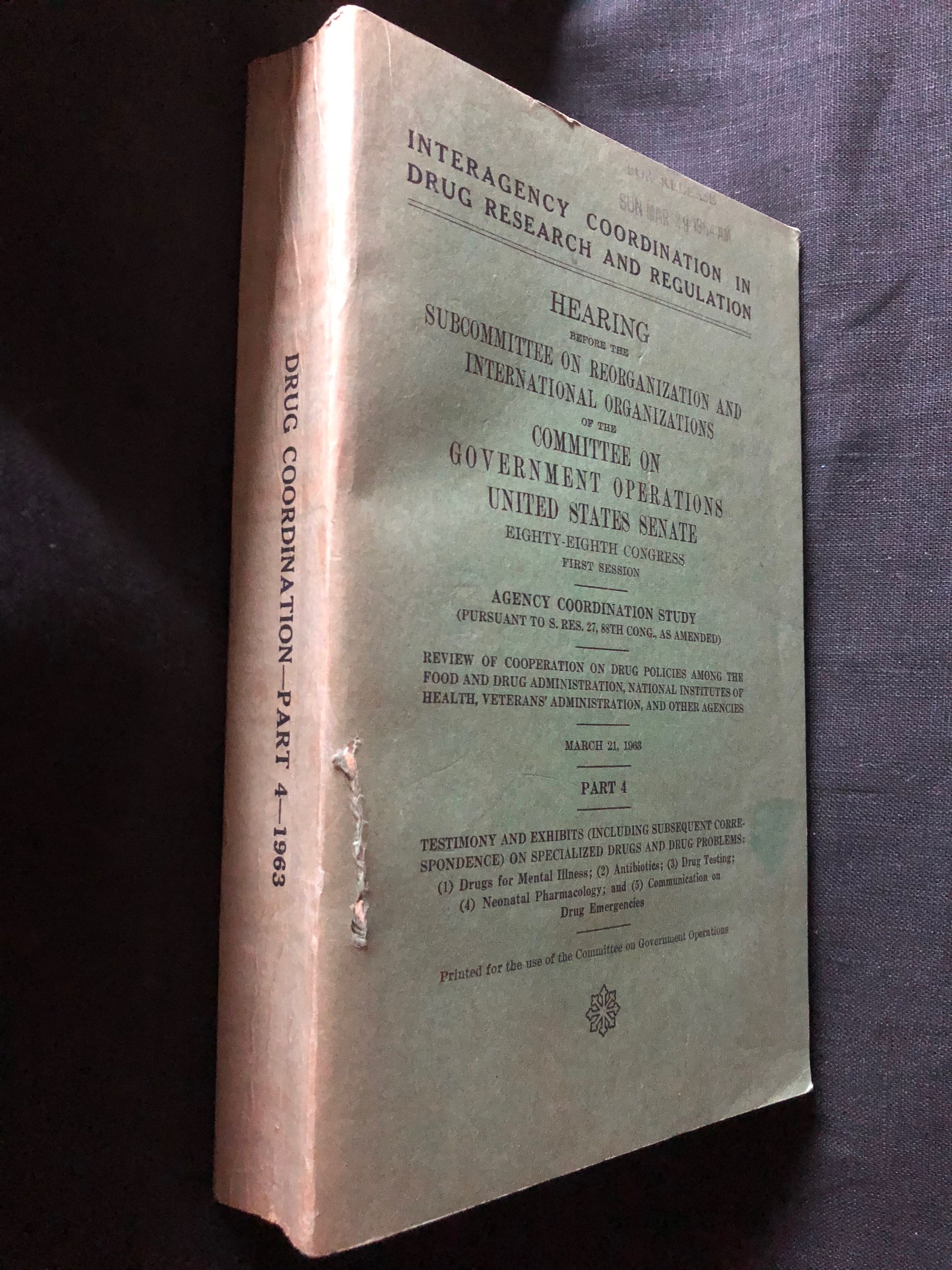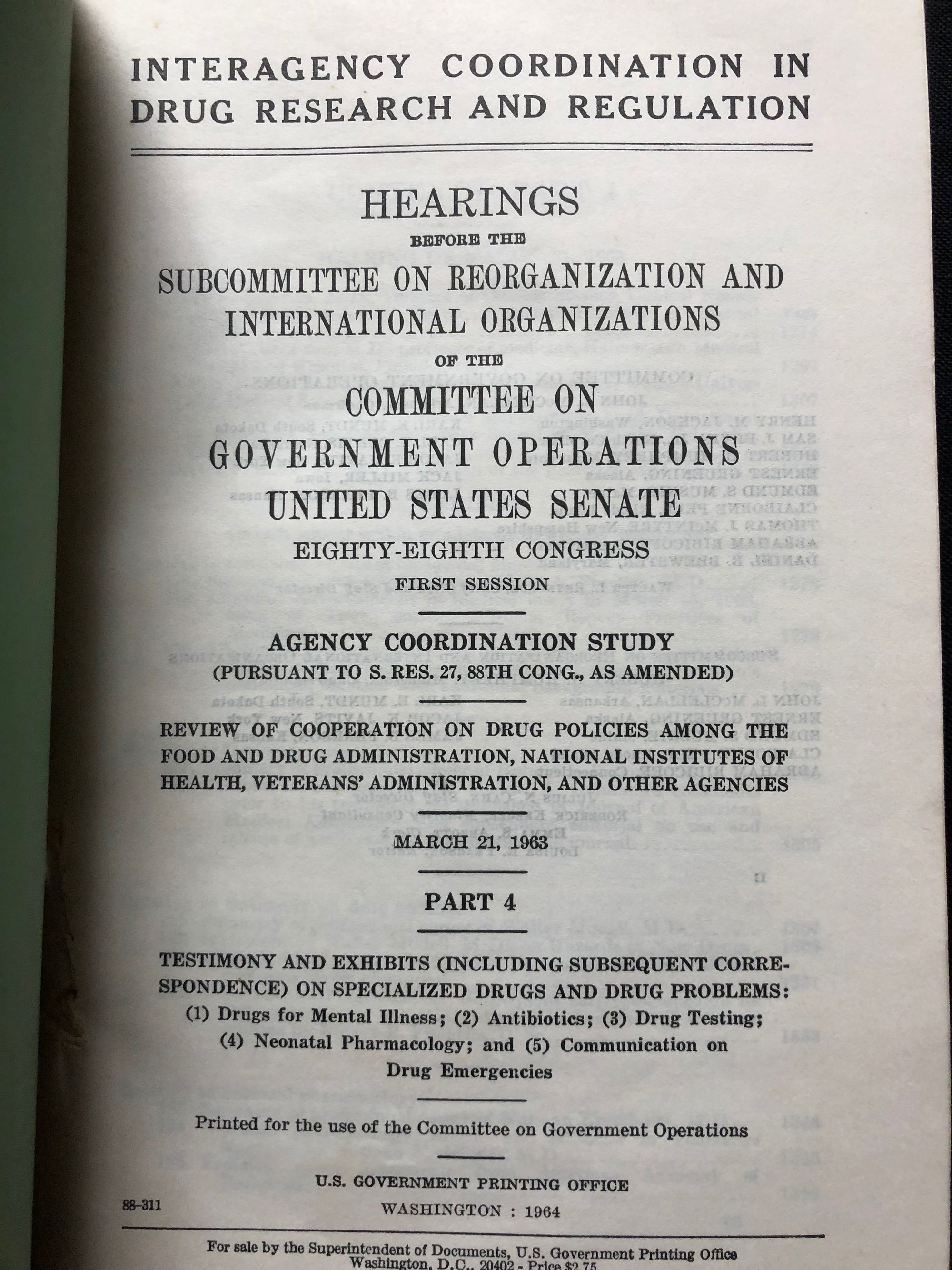 variousInteragency Coordination in Drug Research and Regulation. Hearing Before the Subcommittee on Reorganization and International Organizations of the Committee on Government Operations United States Senate. Eighty-eighth Congress. First Session.Published by US Government Printing Office, Washington DC, 1963.First Edition