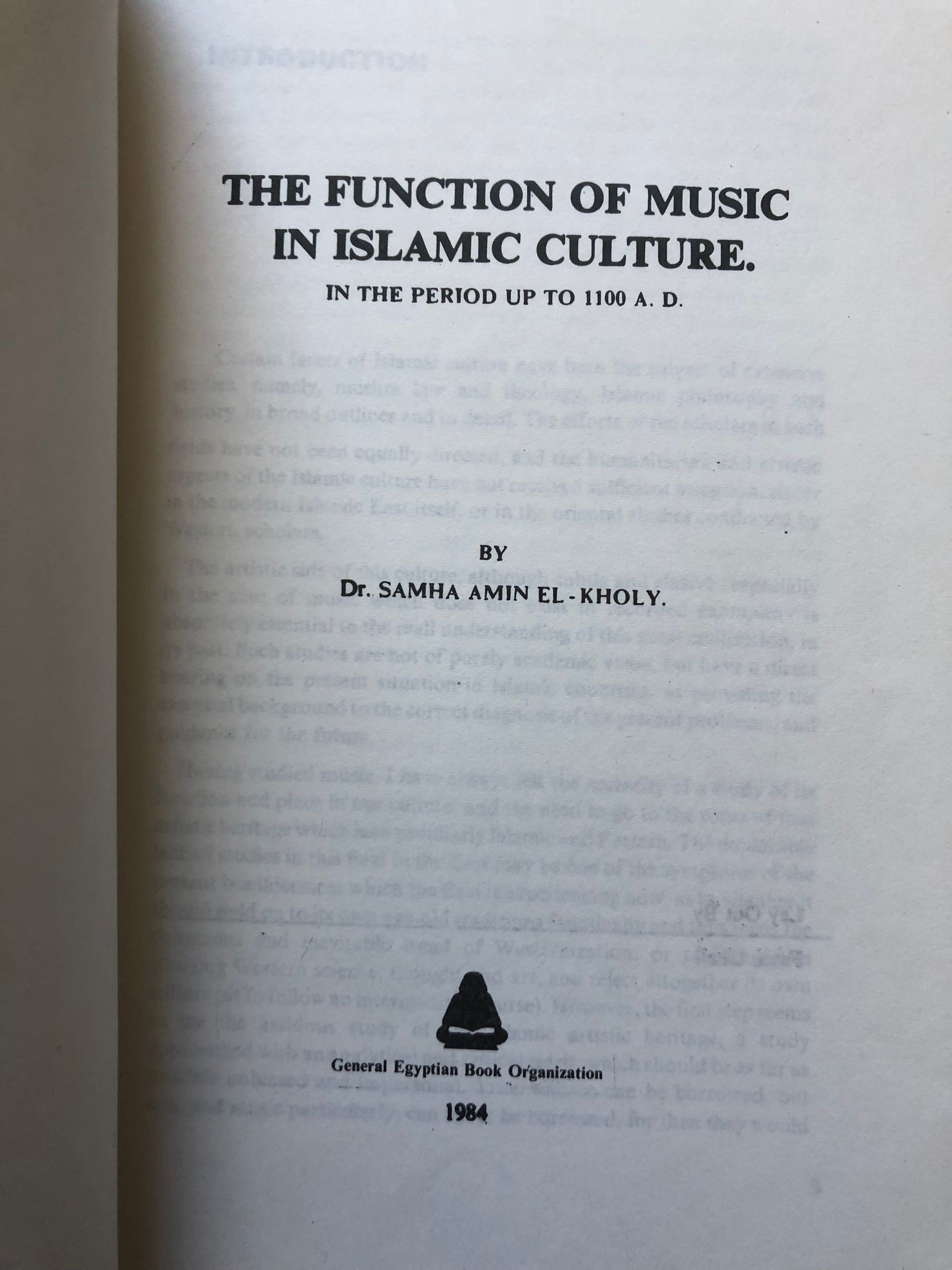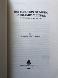 Soft cover, 8vo, 162pp. Condition: Very Good. Title of book written in pen to spine. Pen marks to back cover. ** The author, Dr Samha Amin El-Kholy (1925-2006), was a noted Egyptian musicologist who studied at the University of Edinburgh with Henry George Farmer and was married to the Egyptian composer, Gamal Abdel-Rahim. Sections on "Music and the Religious Life", "Music and Sufism", "Music and the Intellectual Life", "Music and Social Life", "Music in the Life of the Aristocracy", "Music of the People", "The Social Status of Professional Musicians". With bibliography. OCLC 21335522.