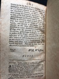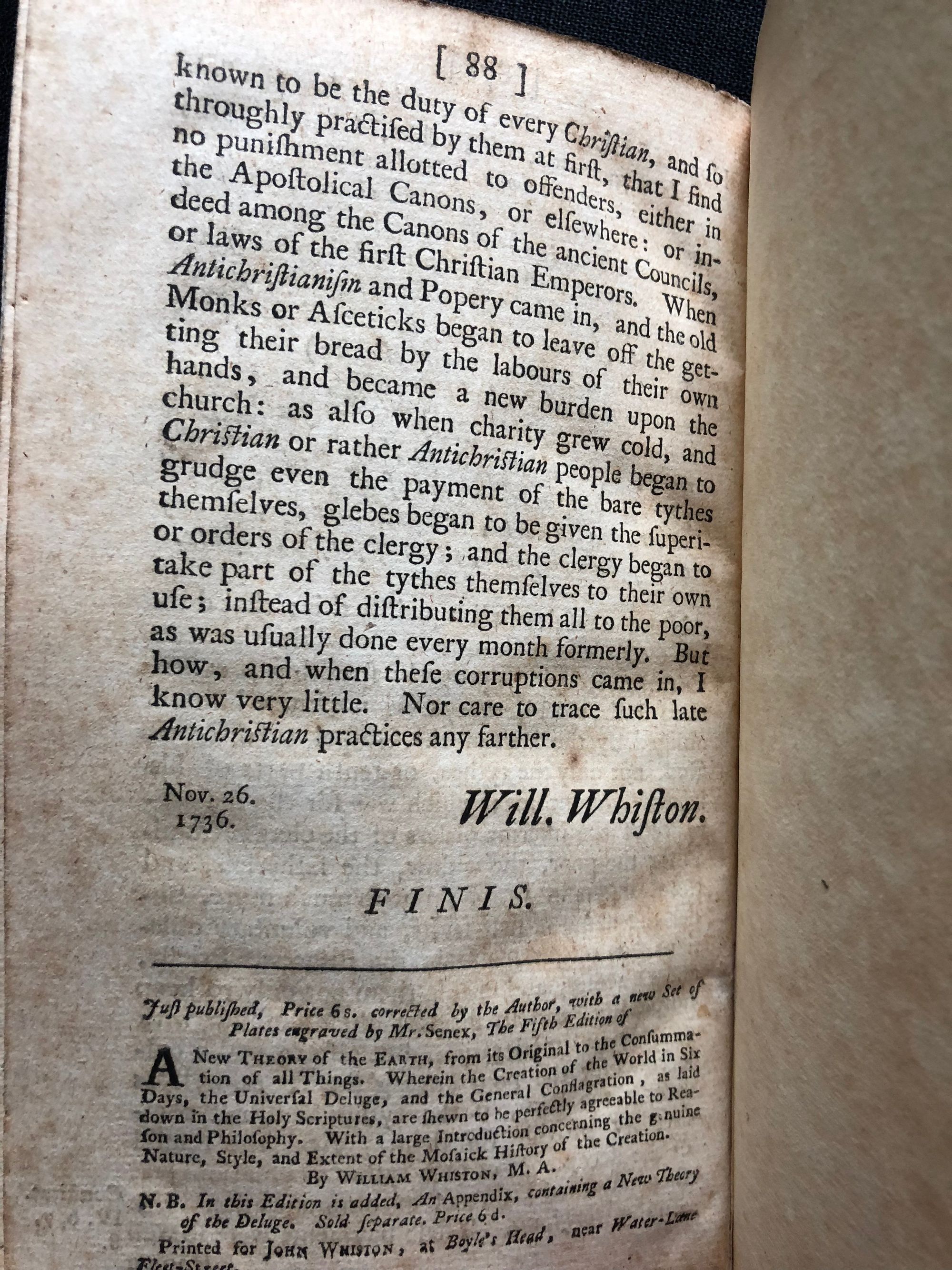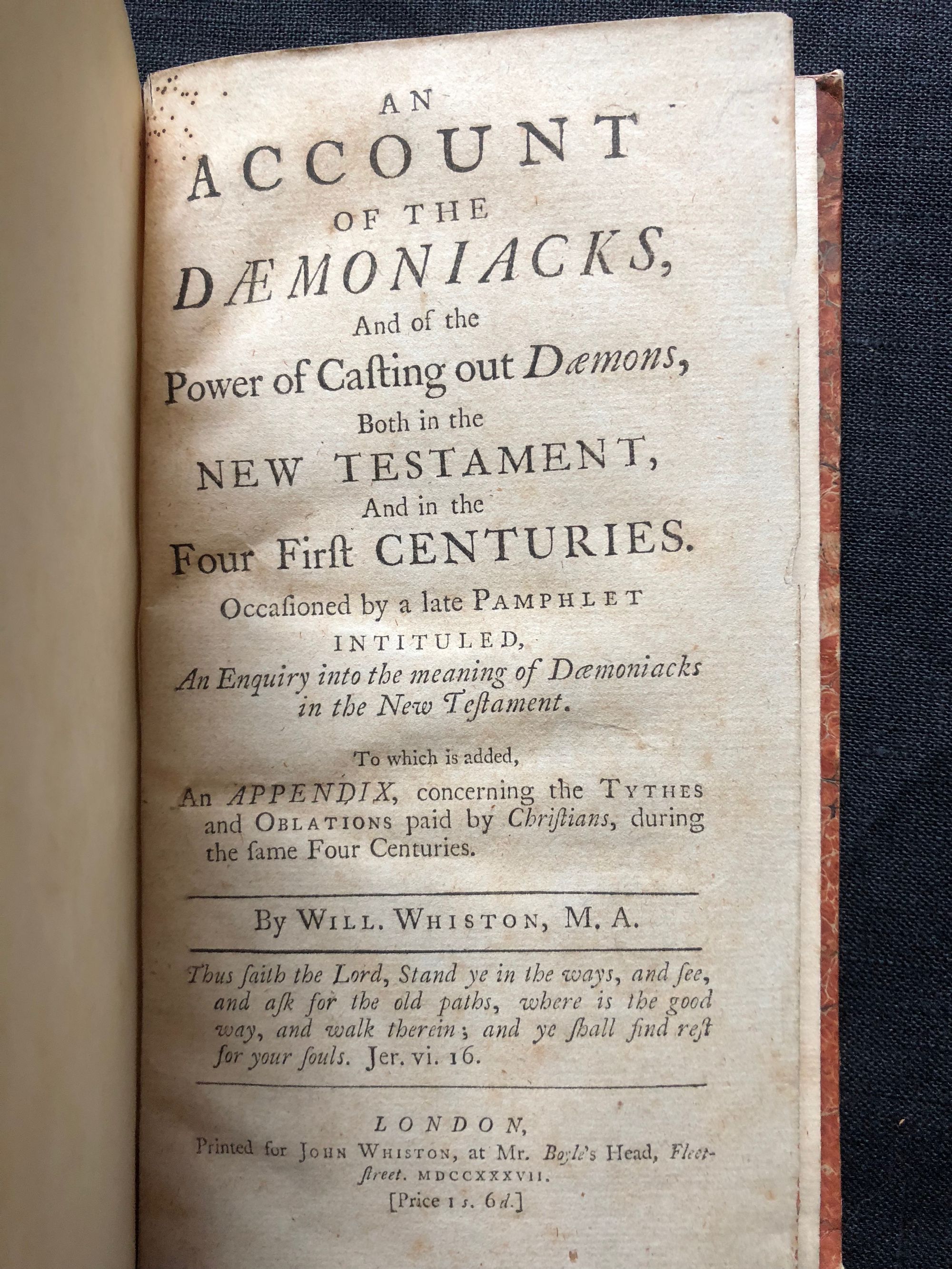 Hardcover, 12mo., pp[1-88]. Signatures: A-I4 K-L4 [D2 numbered as D3]. Quarter-bound in calf, with rubbing and small chips missing from spine. Condition: Very Good. Small closed tear to page E2, light wear to fore-edge of title page. *** William Whiston (1667 - 1752) was an English mathematician, who succeeded Sir Isaac Newton as Lucasian Professor of Mathematics at the University of Cambridge in 1702. Whiston was also an ordained minister, and was rector of Lowestoft from 1698-1699. He was a Boyle lecturer in 1707, in which position he defended the position of biblical literalism. In 1710 he was expelled from the university because of his religious views, in particular his denial of the doctrine of the Trinity, saying it had pagan origins. Scarce.