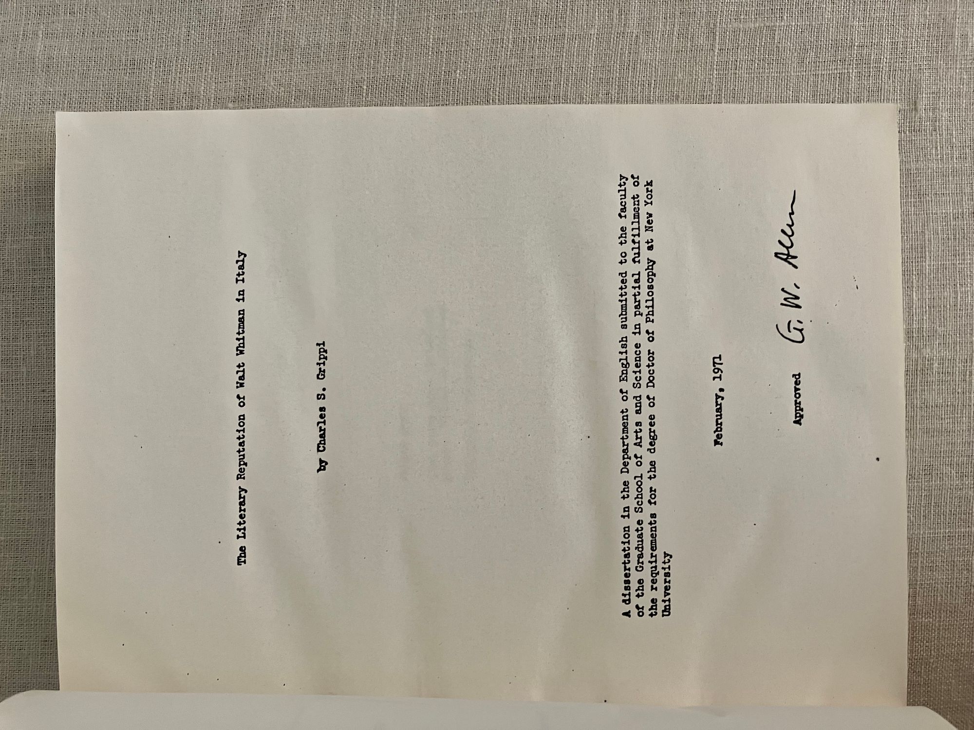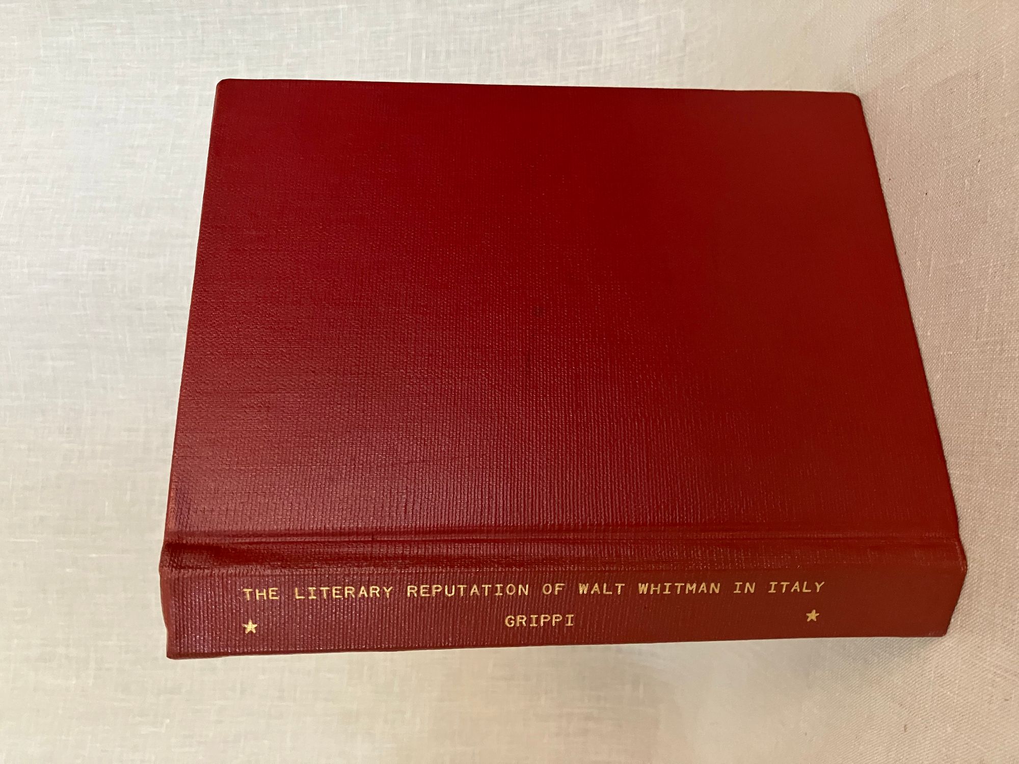 Hard Cover. 8vo. in red buckram binding, 339pp. Condition: Near Fine. ** Authorized FACSIMILE of PhD. thesis from microfilm. Presentation inscription by Author to front pastedown. A discussion of the evolution of Walt Whitman's literary reputation in Italy, and how his work would effect later Italian poets. Extensive bibliography.
