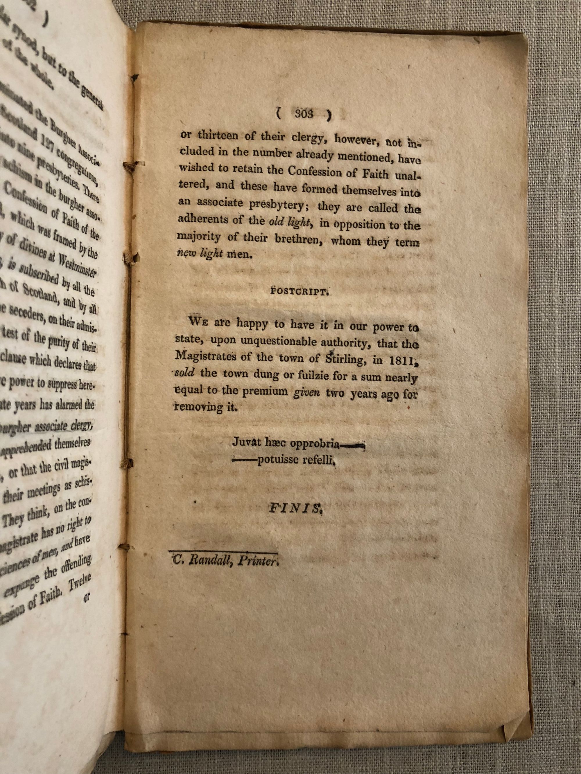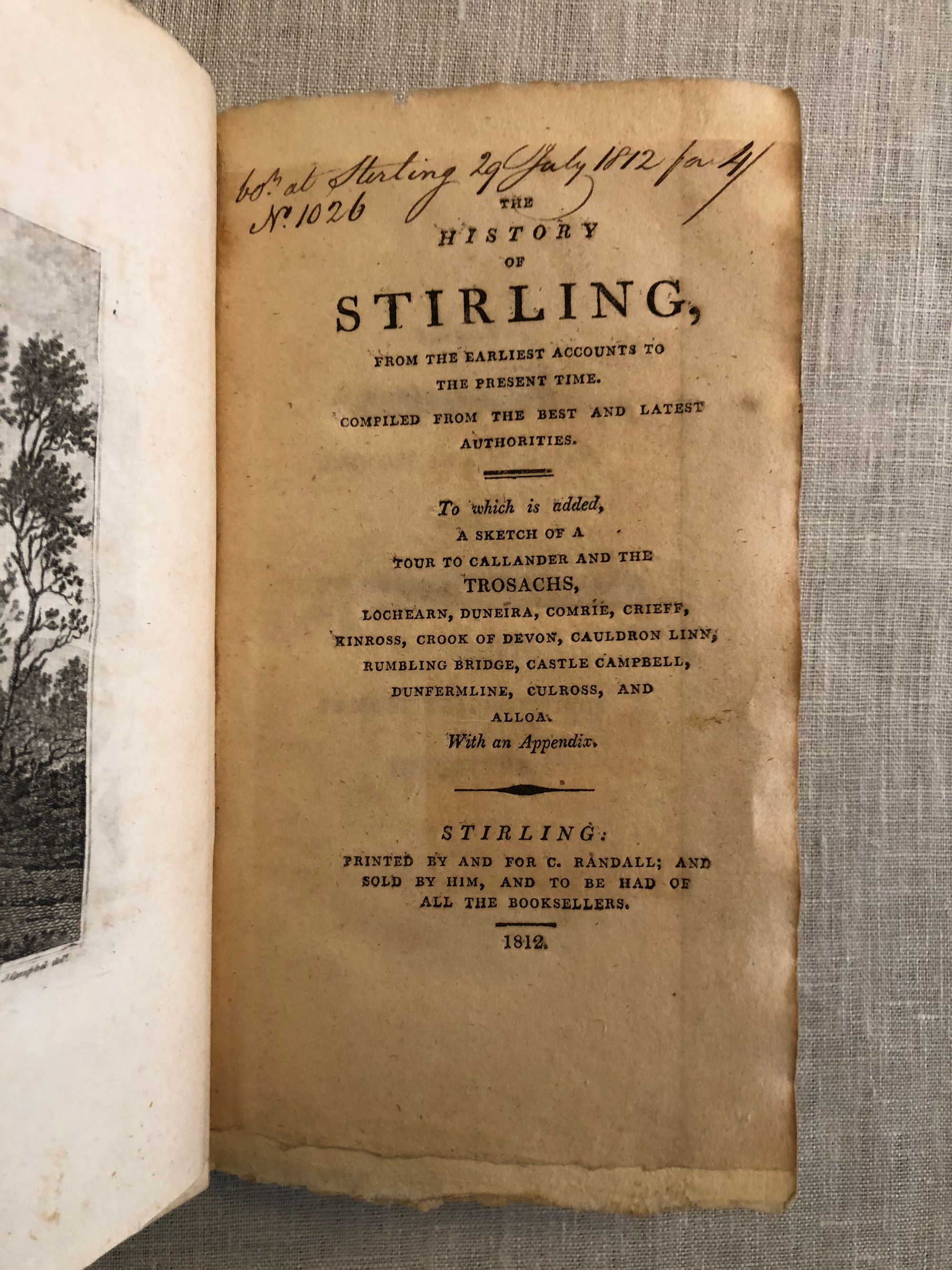 Randall, C.The History of Stirling, from the Earliest Accounts to the Present Time. Compiled from the Best and Latest Authorities. To Which is added, A Sketch of a Tour to the Trossachs, Lochearn, Duneira, Comrie, Crieff, Kinross, Crook of Devon, Cauldron Linn, Rumbling Bridge, Castle Campbell, Dunfermline, Culross and Alloa. With an Appendix.Published by C. Randall, Stirling, 1812.First Edition