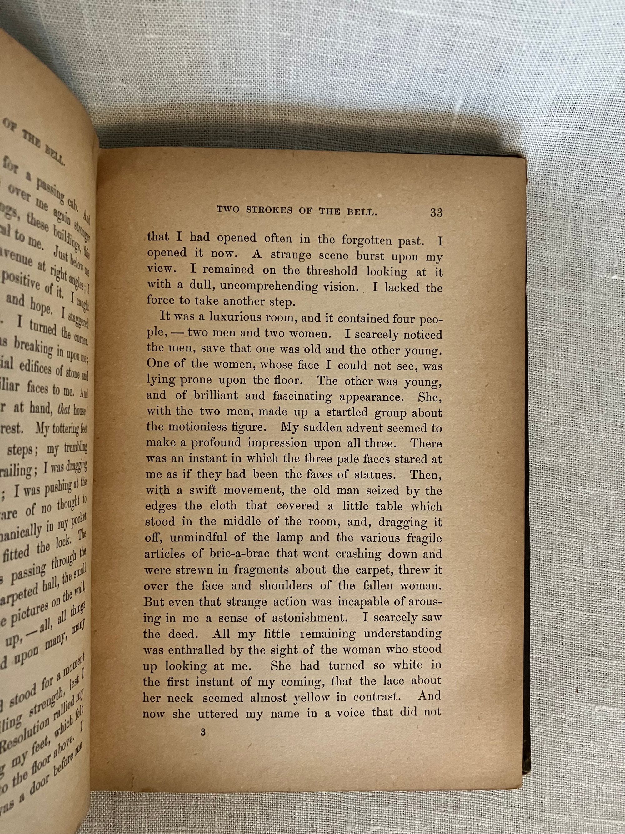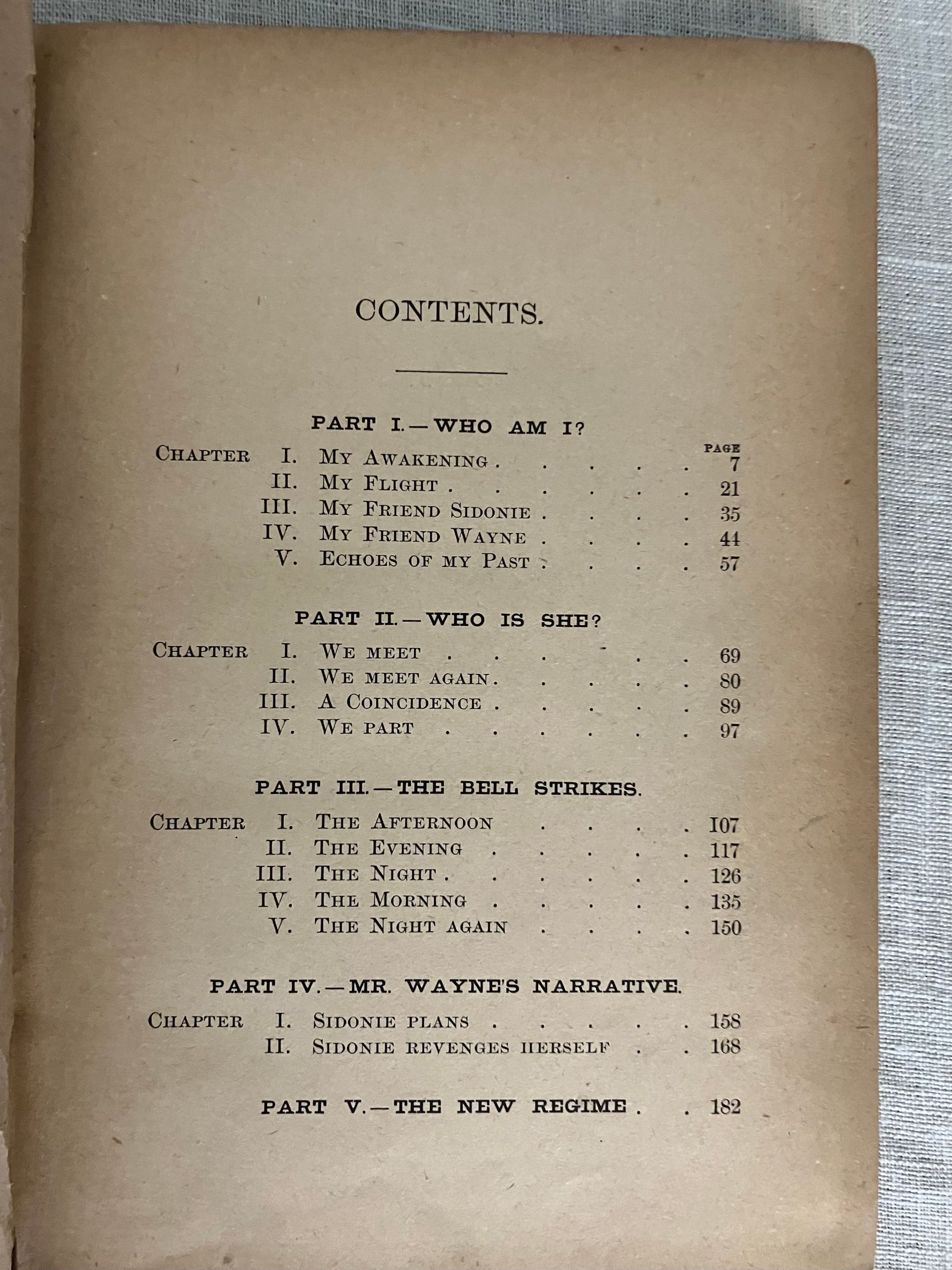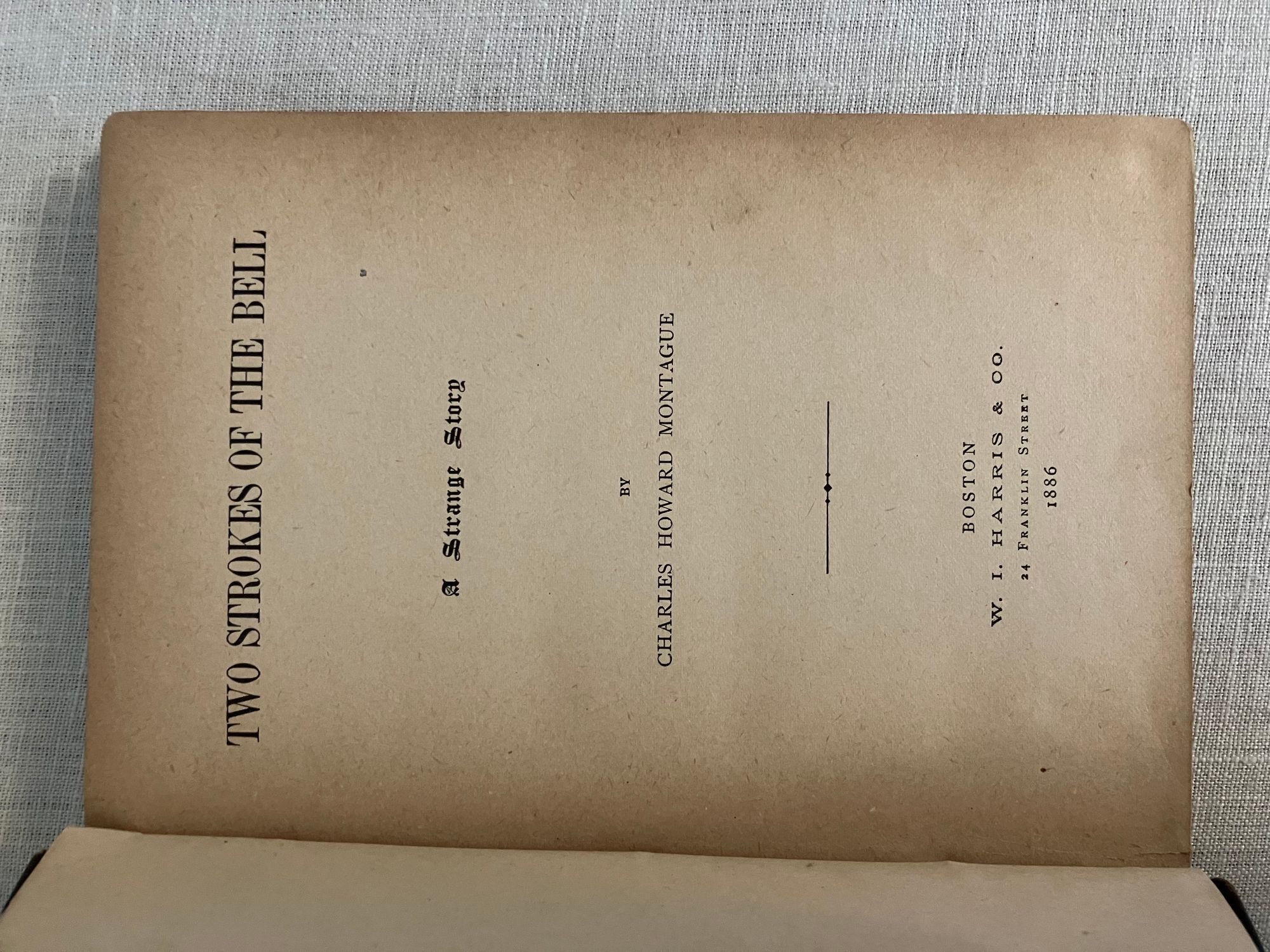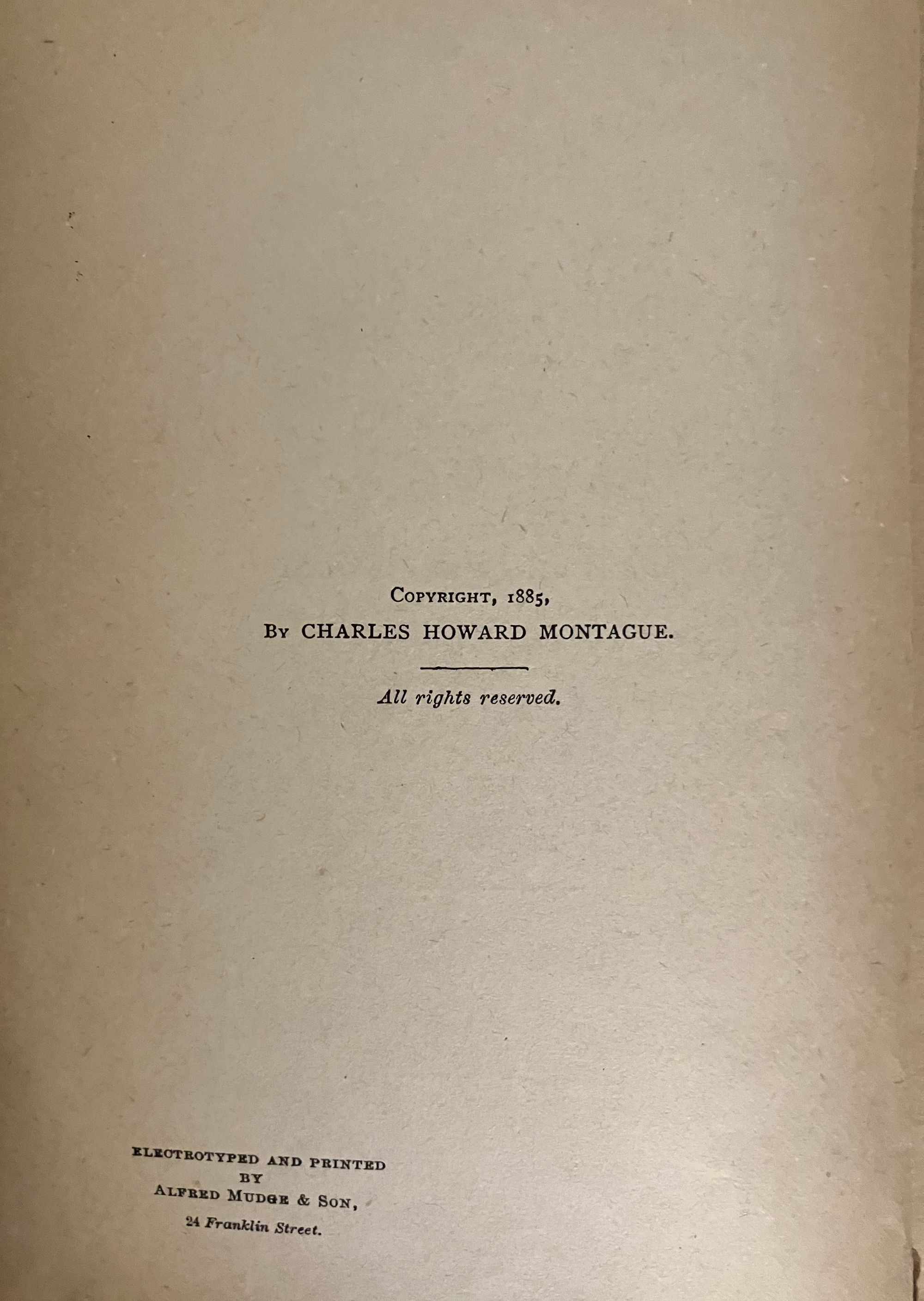 Hard cover in brown cloth, 12mo., with pattern printed endpapers, 185pp., First Edition. Charles Howard Montague (1858 - 1889) was a journalist and city editor at the Boston Globe, who also wrote a number of "speculative" novels. This volume deals with a young man who has lost his memory and struggles to make sense of intimations of disaster found among his personal effects, after arriving mysteriously in a small New York town. Supernatural elements also categorize this as science fiction. Condition: Pages very age-toned. Covers worn at edges. Owner's inscription to front free endpaper and ffep. Scarce. Wright 3797. Hubin p. 289.