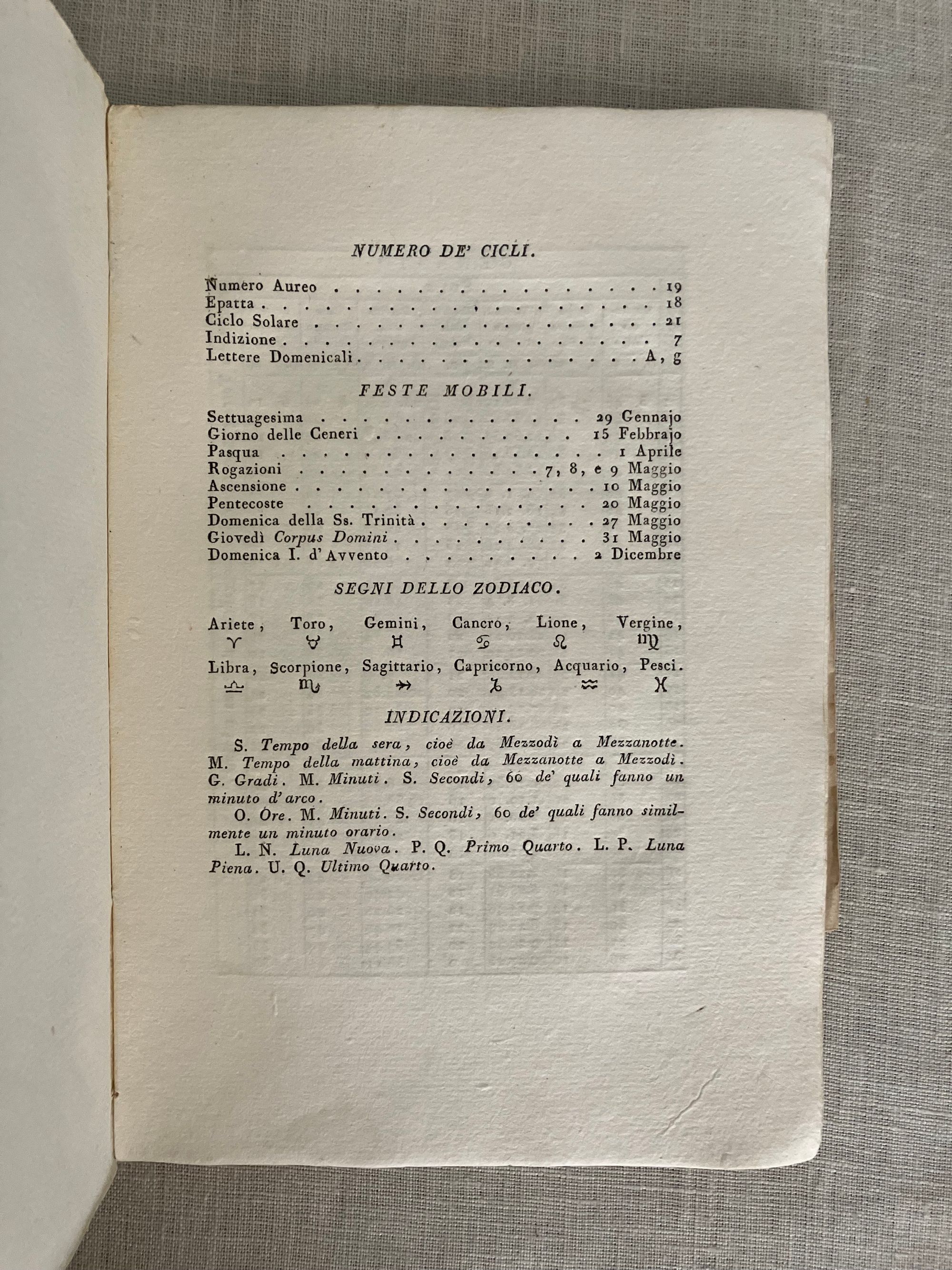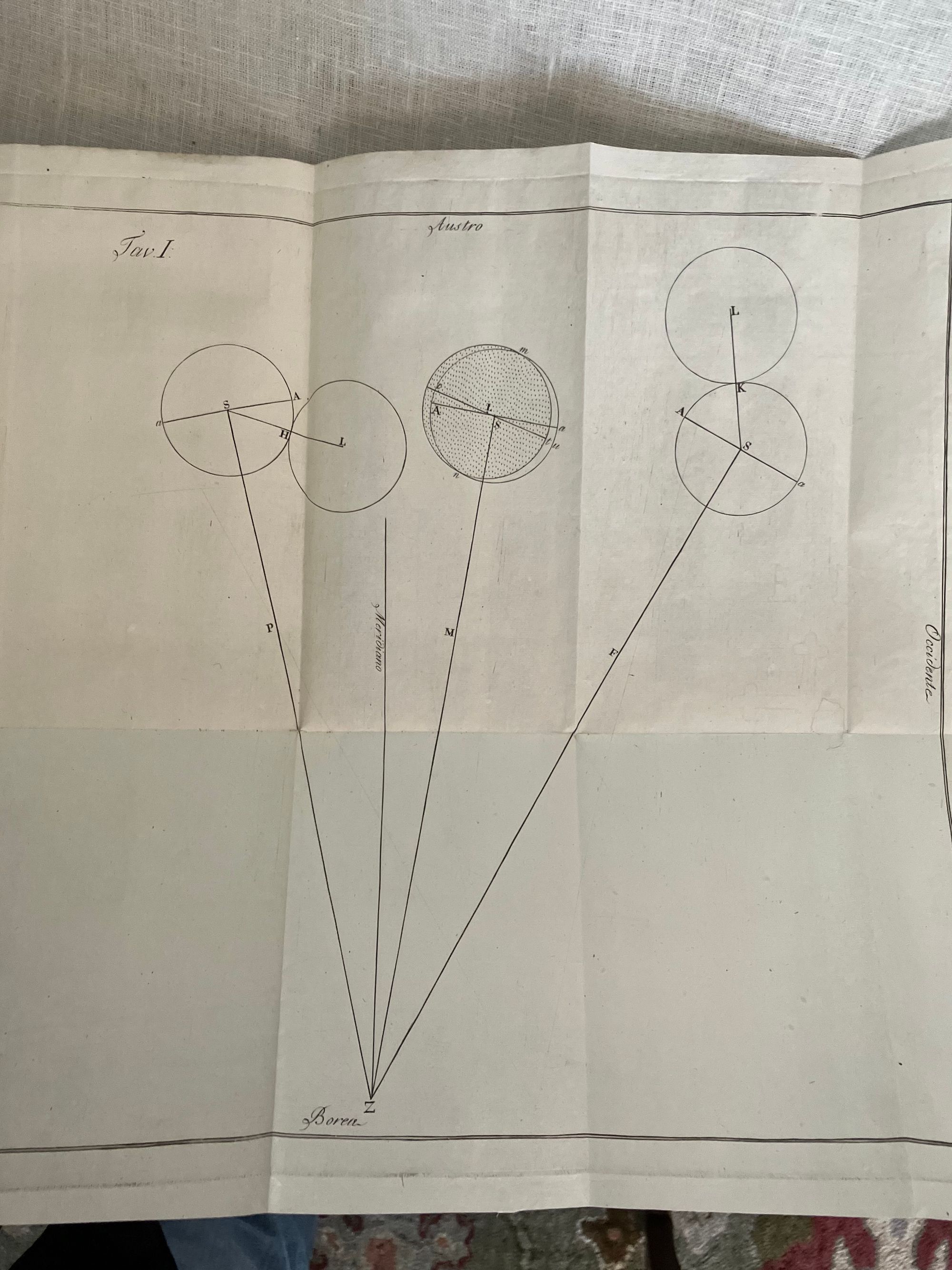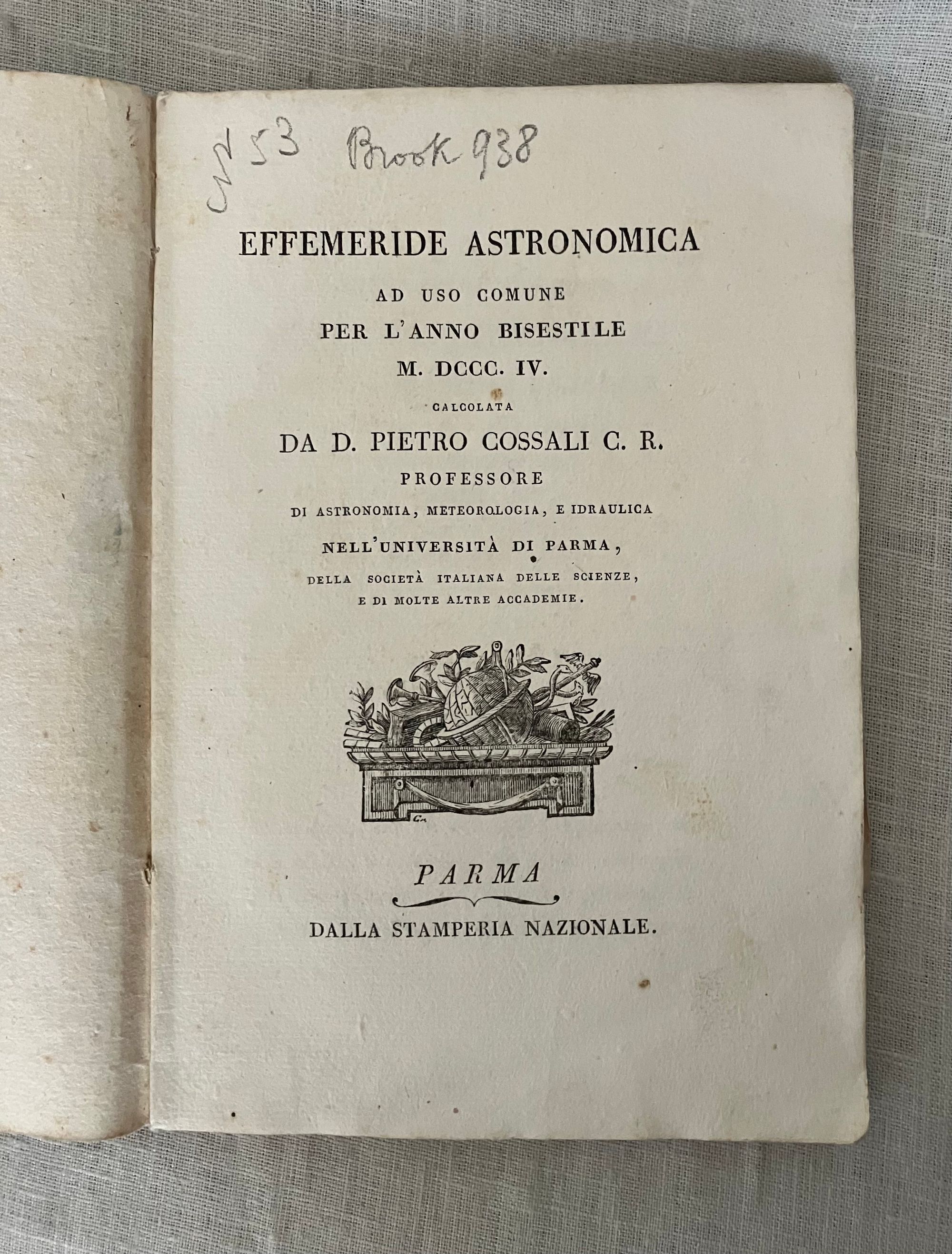 Soft cover, 12mo, in mottled-style card wraps, a hand- lettered paper label to the spine, (measuring 5 1/2 x 8 1/4 inches) 33 [1] [36] plus 2 engraved foldout plates, (the first described in terms of Austro, Occidente, Oriente and Borea time; probably referring to the trans-Alpine time meridian of the Hapsburgs.)With many tables. In Italian, First edition. CONTENTS: Dedication to the current French administator of the Parma, Piacenza, and Gustalla administrative district (then under French occupation,) Médéric Louis Élie Moreau-Saint-Méry. Discussion of the eclipse in Parma. About Table I, "Position and mode of the eclipse in the sky." About Table II, "Travel of the moon across the face of the sun." Discussions of historical eclipse of 1715. Tables showing the positions of the sun and moon by month. Planetary tables. CONDITION: Good antiquarian condition. Wraps a bit worn at the corners with two half inch chips missing from spine. The remnants of a collector's printed number glued to lower spine (repeated in pencil to top of title page). Small stain rear of wraps. Grease pencil notation to front cover, initials and mathematical notation in old ink and illegible pencil to inside front. One loss to corner of p. 9, not affecting text. Foldout plates with small split at outer fold. The text block edges, and pages within are clean. Binding cracked but holding firmly. AUTHOR Pietro D. Cossali (1748 - 1815) was an Italian cleric, mathematician, meteorologist and astronomer, and Professor of theoretical physics at the University of Parma beginning in 1787. He published a number of these "astological ephemera," as well as books on the history of algebra and the Fibanaci code. In 1778, his work turned to ballooning, and he experimented with its application to meteorlogical research. Cossalli became Professor of theoretical physics at the University of Parma in 1787, amidst a period of cultural flowering of the northern Italian city, despite successive political upheavals of the times. (The complex history of this northern Italian Duchy of Parma and Piacenza during Cossali's lifetime saw successive conquest by the Imperial Holy Roman Empire, the Bourbon alliance with the Kings of Spain and the Farnese family, and finally, annexation by the French under Napoleon.). Ugo Baldini's excellent article on Cossalli in the BDI demonstrates how skillful Cossali was in negotiating the changing political realities of the times in order to pursue his mathematical and scientific passions.