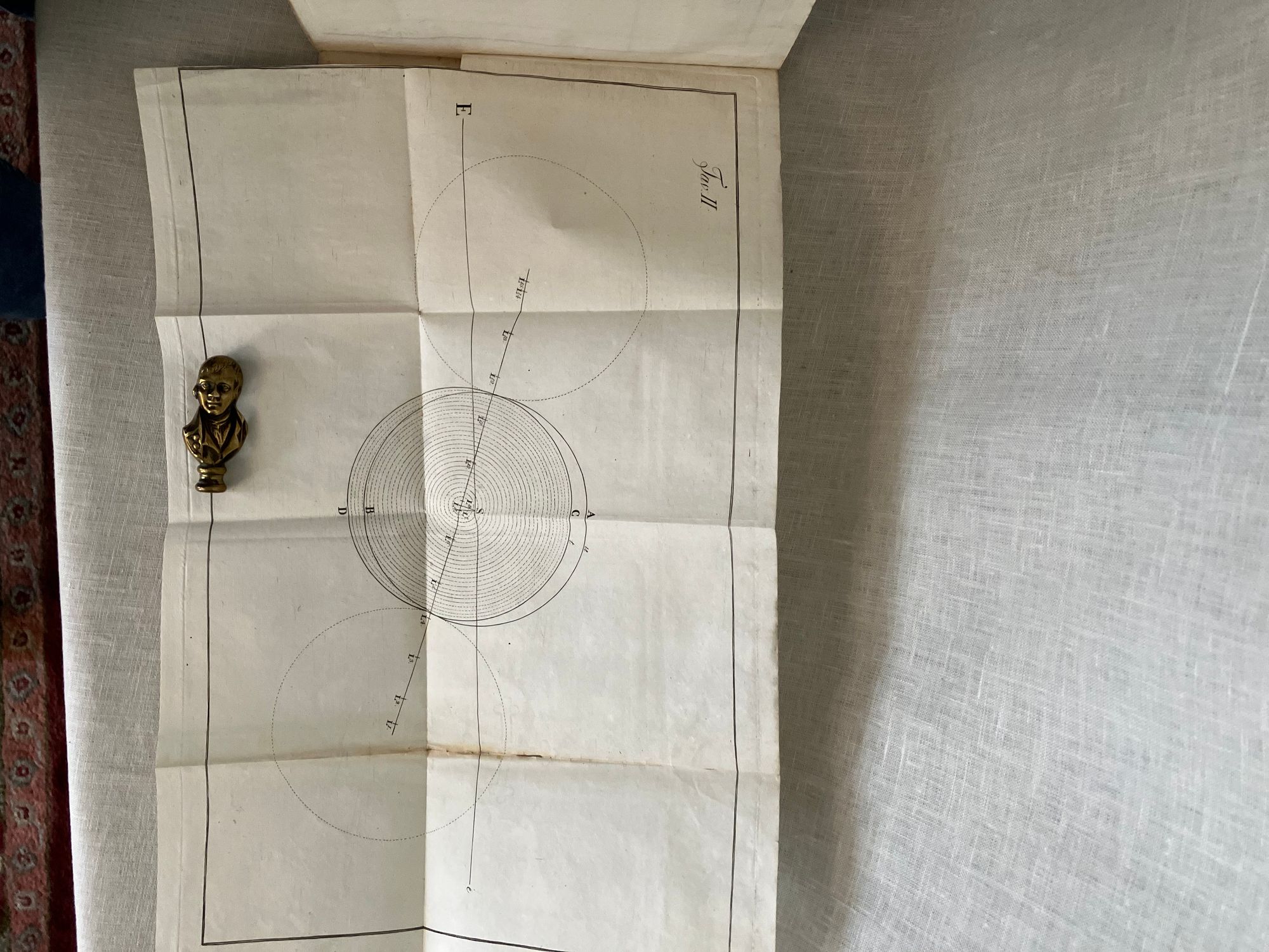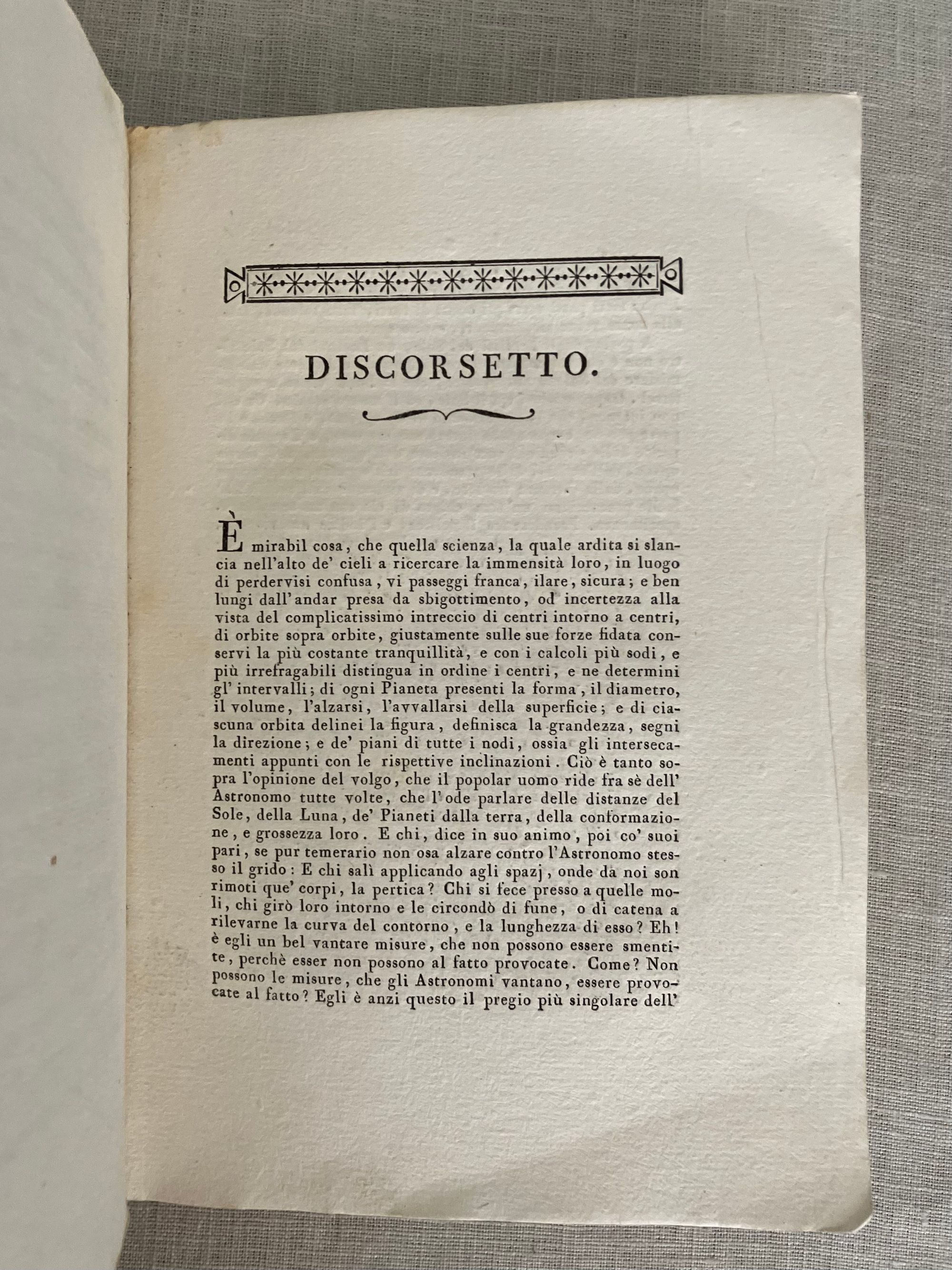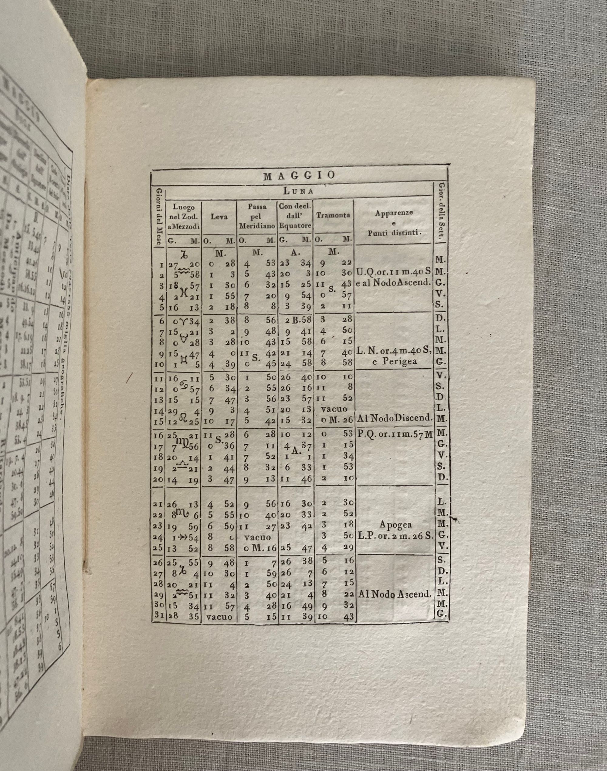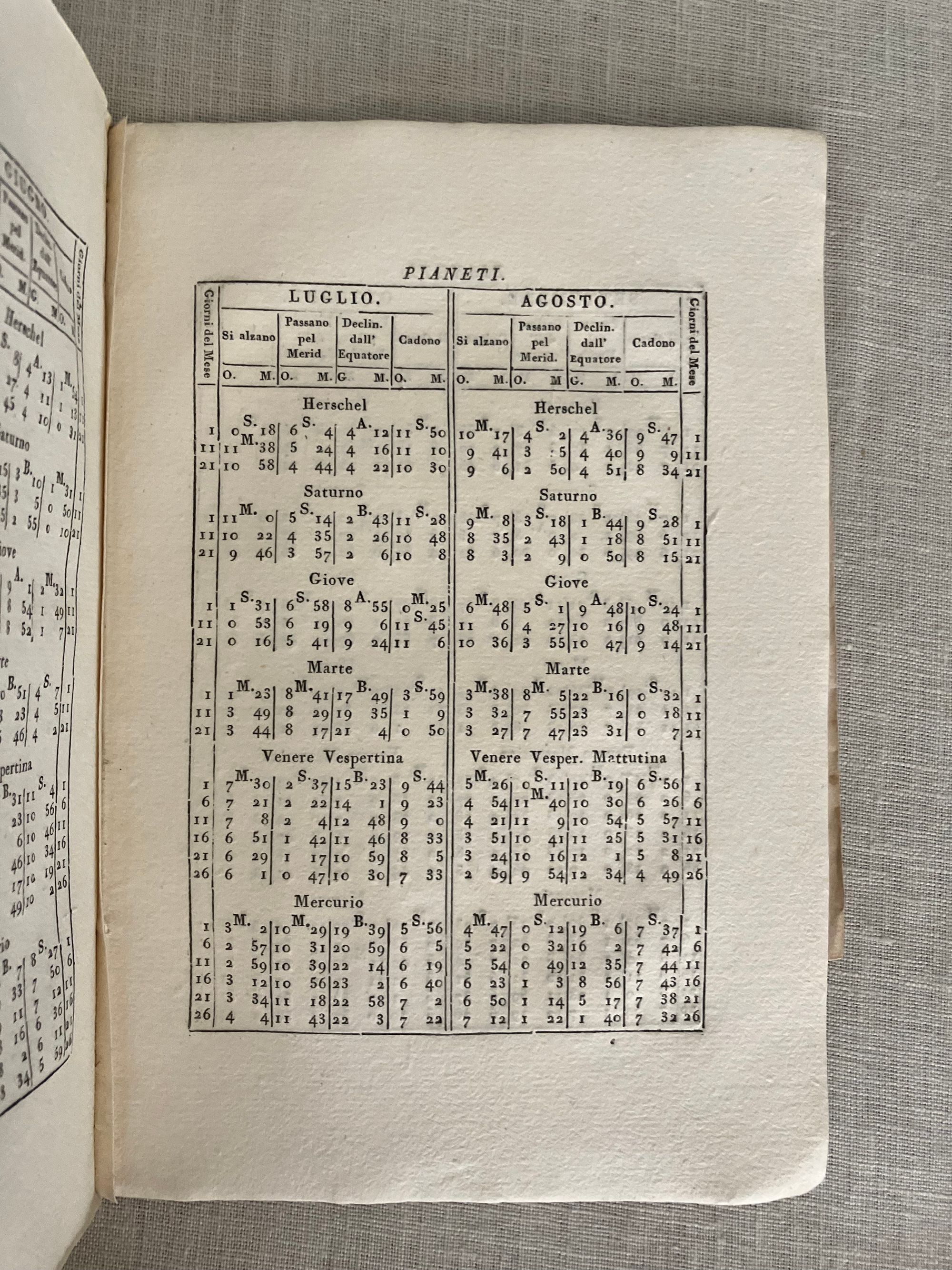 Soft cover, 12mo, in mottled-style card wraps, a hand- lettered paper label to the spine, (measuring 5 1/2 x 8 1/4 inches) 33 [1] [36] plus 2 engraved foldout plates, (the first described in terms of Austro, Occidente, Oriente and Borea time; probably referring to the trans-Alpine time meridian of the Hapsburgs.)With many tables. In Italian, First edition. CONTENTS: Dedication to the current French administator of the Parma, Piacenza, and Gustalla administrative district (then under French occupation,) Médéric Louis Élie Moreau-Saint-Méry. Discussion of the eclipse in Parma. About Table I, "Position and mode of the eclipse in the sky." About Table II, "Travel of the moon across the face of the sun." Discussions of historical eclipse of 1715. Tables showing the positions of the sun and moon by month. Planetary tables. CONDITION: Good antiquarian condition. Wraps a bit worn at the corners with two half inch chips missing from spine. The remnants of a collector's printed number glued to lower spine (repeated in pencil to top of title page). Small stain rear of wraps. Grease pencil notation to front cover, initials and mathematical notation in old ink and illegible pencil to inside front. One loss to corner of p. 9, not affecting text. Foldout plates with small split at outer fold. The text block edges, and pages within are clean. Binding cracked but holding firmly. AUTHOR Pietro D. Cossali (1748 - 1815) was an Italian cleric, mathematician, meteorologist and astronomer, and Professor of theoretical physics at the University of Parma beginning in 1787. He published a number of these "astological ephemera," as well as books on the history of algebra and the Fibanaci code. In 1778, his work turned to ballooning, and he experimented with its application to meteorlogical research. Cossalli became Professor of theoretical physics at the University of Parma in 1787, amidst a period of cultural flowering of the northern Italian city, despite successive political upheavals of the times. (The complex history of this northern Italian Duchy of Parma and Piacenza during Cossali's lifetime saw successive conquest by the Imperial Holy Roman Empire, the Bourbon alliance with the Kings of Spain and the Farnese family, and finally, annexation by the French under Napoleon.). Ugo Baldini's excellent article on Cossalli in the BDI demonstrates how skillful Cossali was in negotiating the changing political realities of the times in order to pursue his mathematical and scientific passions.