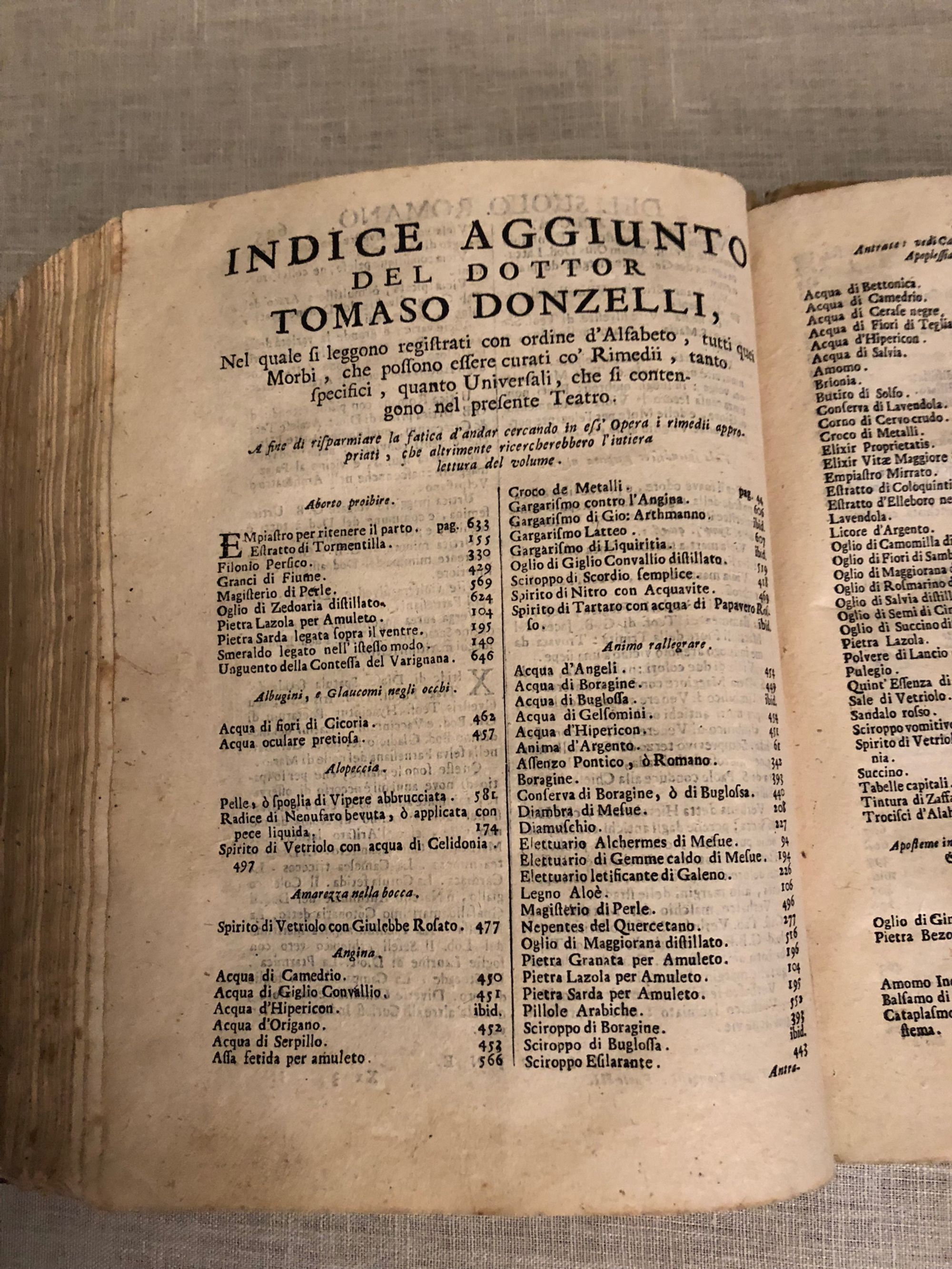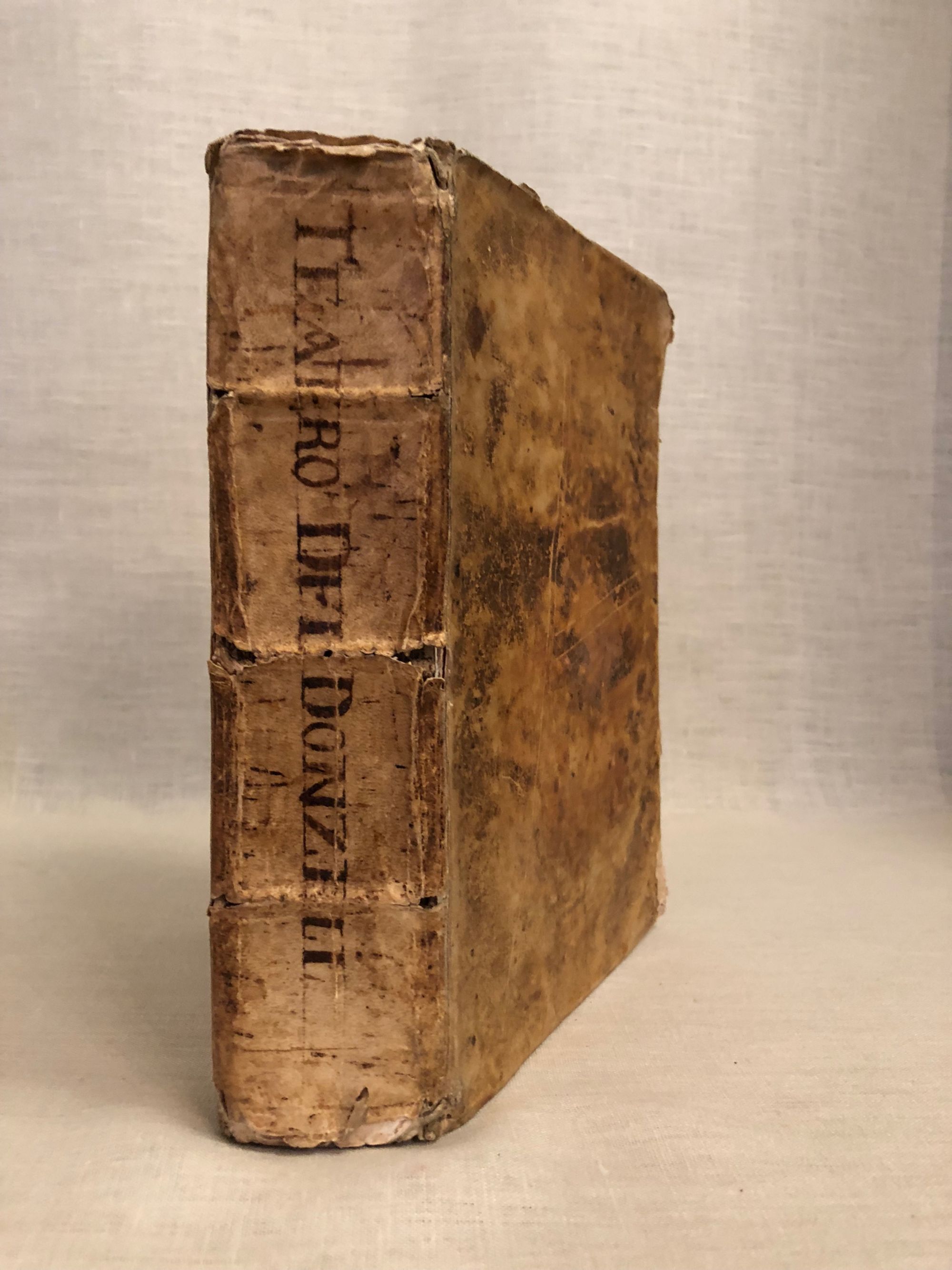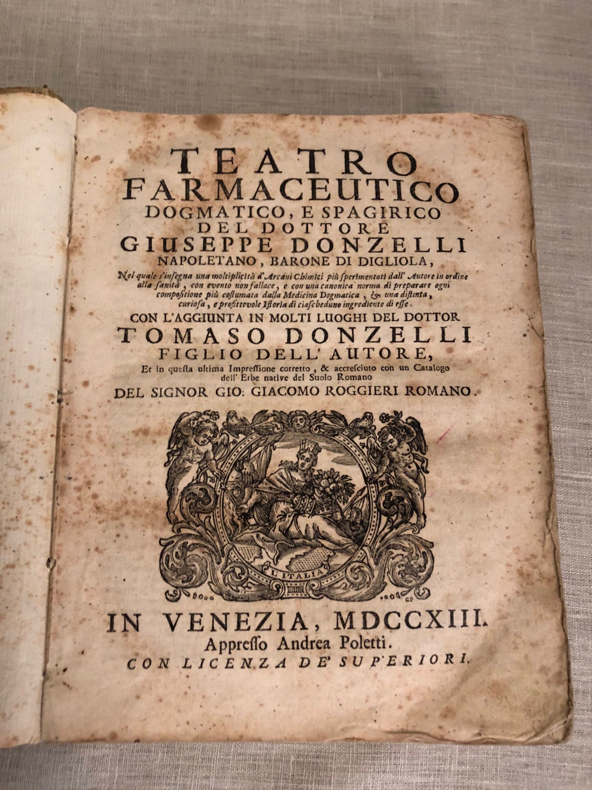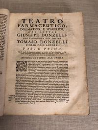 Hardcover, 8vo (measuring 7 ¼ x 9 inches,) in a contemporary laced vellum binding, with the title in old ink to spine, pp [24] 695 [73]. Collation: *4, A-I8, K-T8, V8, X-Z8, Aa-Ii8, Kk-Tt8, Vv8, Xx-Zz8, Aaa8-Bbb8. Pages misnumbered by printer from 272-291 (none missing). A relatively early imprint of a classic work in early Italian medicine, which saw over twenty editions between 1661 and 1763. The author, Giuseppe Donzelli, Baron of Dogliola, (1596-1670) was a Neapolitan revolutionary, physician and pharmacist, and the Teatro Farmaceutico is his most famous work. A proponent of iatrochemical medicine, whose methods bridged alchemical and modern medicine, he studied the writings of Paracelsus, and actively experimented in finding solutions to disease through chemistry and botany. Historian Tommasso Siciliano describes the alchemical garden at Donzelli's villa in Aranella, Sicily: "he brought rare and precious medicinal plants from their countries of origin, transplanted them to his land of Arenella and took care of their rooting and acclimatization, proud to be able to assert that he, alone in Naples, possessed them." The villa became a destination for "intellectuals and others seeking to have their ailments alleviated. A catalogue of medicinal plants and their uses is included. Donzelli also was a participant in the Masaniello Revolt of 1647, in which the Sicilians fought to oust their Hapsburg Spanish conquerors. His chronicle of these political events was as famously burned on the steps of the Naples Cathedral. He was captured and imprisoned during the contretemps, and was released thanks to the intervention of his friend, the Regent Don Giulio Galeota. *** The printer Andrea Poletti of Venice (circa 1646-1726) had a son, Orazio Poletti, who continued his father's press and bookselling business, occasionally using his father's name. (The later 19th edition published by Andrea Poletti released in 1728 may therefore be the work of the son. Condition: Good Minus antiquarian Condition. There is wear to the vellum of the spine along the raised compartments, rubbed corners, and the front hinge is split. Foxing throughout. Some wear to fore-edge of pages in first signature. Despite this, a highly attractive and readable item as the pictures show. Literature: P. Messina, "Giuseppe Donzelli E La Rivoluzione Napoletana Del 1647-1648." Studi Storici 28, no. 1 (1987): 183-202; P. Messina, Biogr. Diz. Italiano Vol. 41 (1992); T. Siciliano, "Giuseppe Donzelli e la su Villa." OCLC No. 801145375.