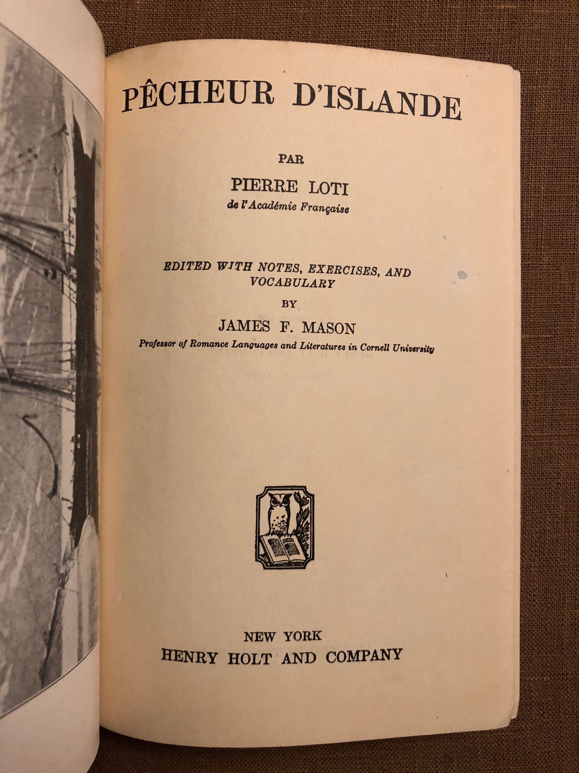 233pp. Pierre Loti (1850 - 1923) was a famous French novelist. PĂȘcheur D'Islande is a novel about the fisherfolk of Breton, and was described by Edmund Gosse as being "the most popular and finest of all his writings." Condition: Covers dust-soiled and slightly worn at corners. Light pencil annotations. One page at vocabuary section has crease.