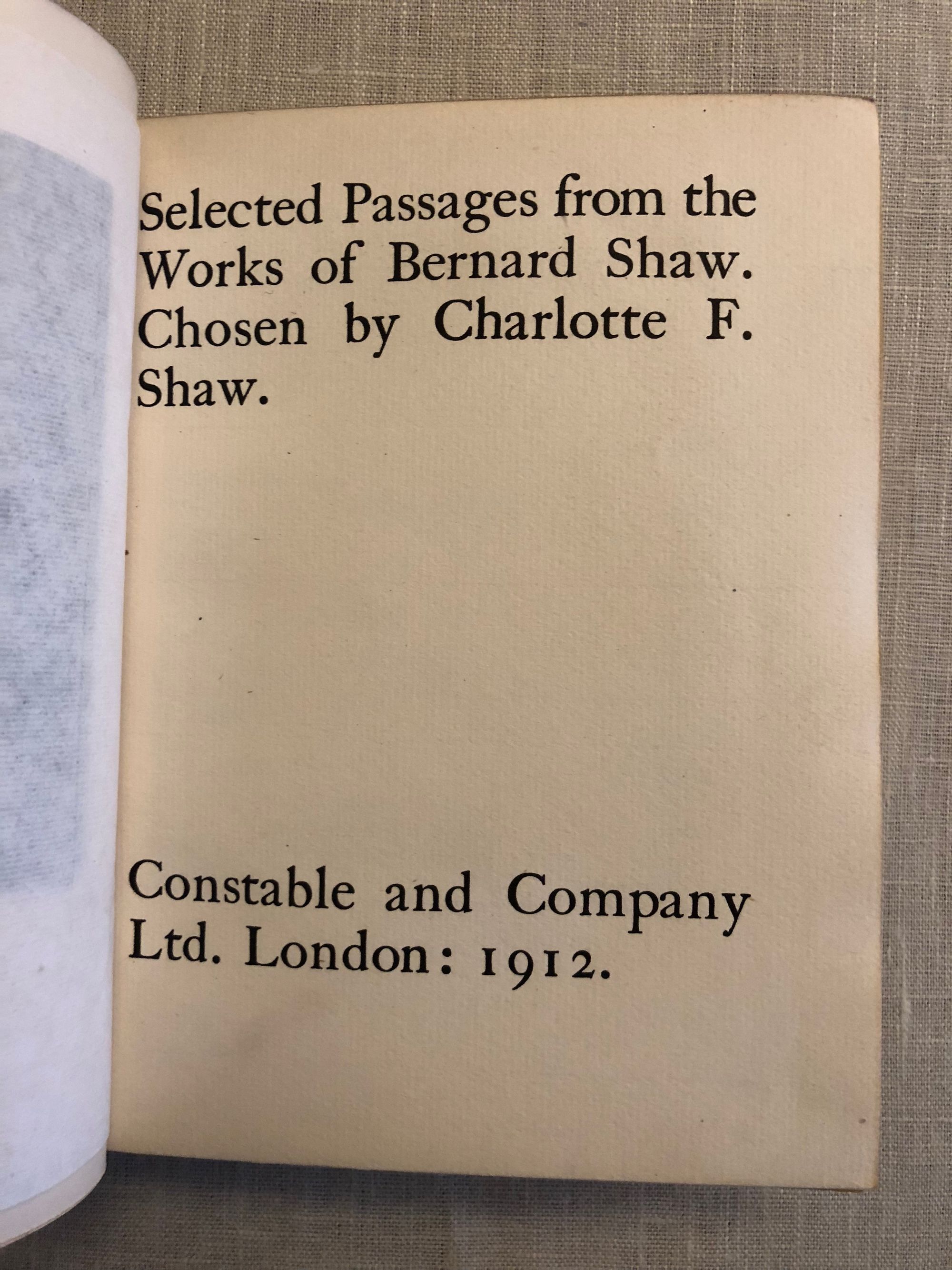 294pp. Association copy to British Royal Family. Finely bound by Hatchards, Picadilly and signed by them. Spine has five raised bands and gilt title. George Bernard Shaw (1856 - 1950) was an Irish playwright and critic. Provenance: Presentation copy inscribed to: "Constance Milnes Gaskell. From Hilda. Xmas 1913). Lady Constance Harriet Stuart Milnes Gaskell (1885 - 1964) was a Woman of the Bedchamber to Queen Mary from 1937-53 and Lady-in-Waiting to Princess Marina, Duchess of Kent from 1953-60. Condition: Near Fine, with rubbing to spine and front hinge cracked (but firm).