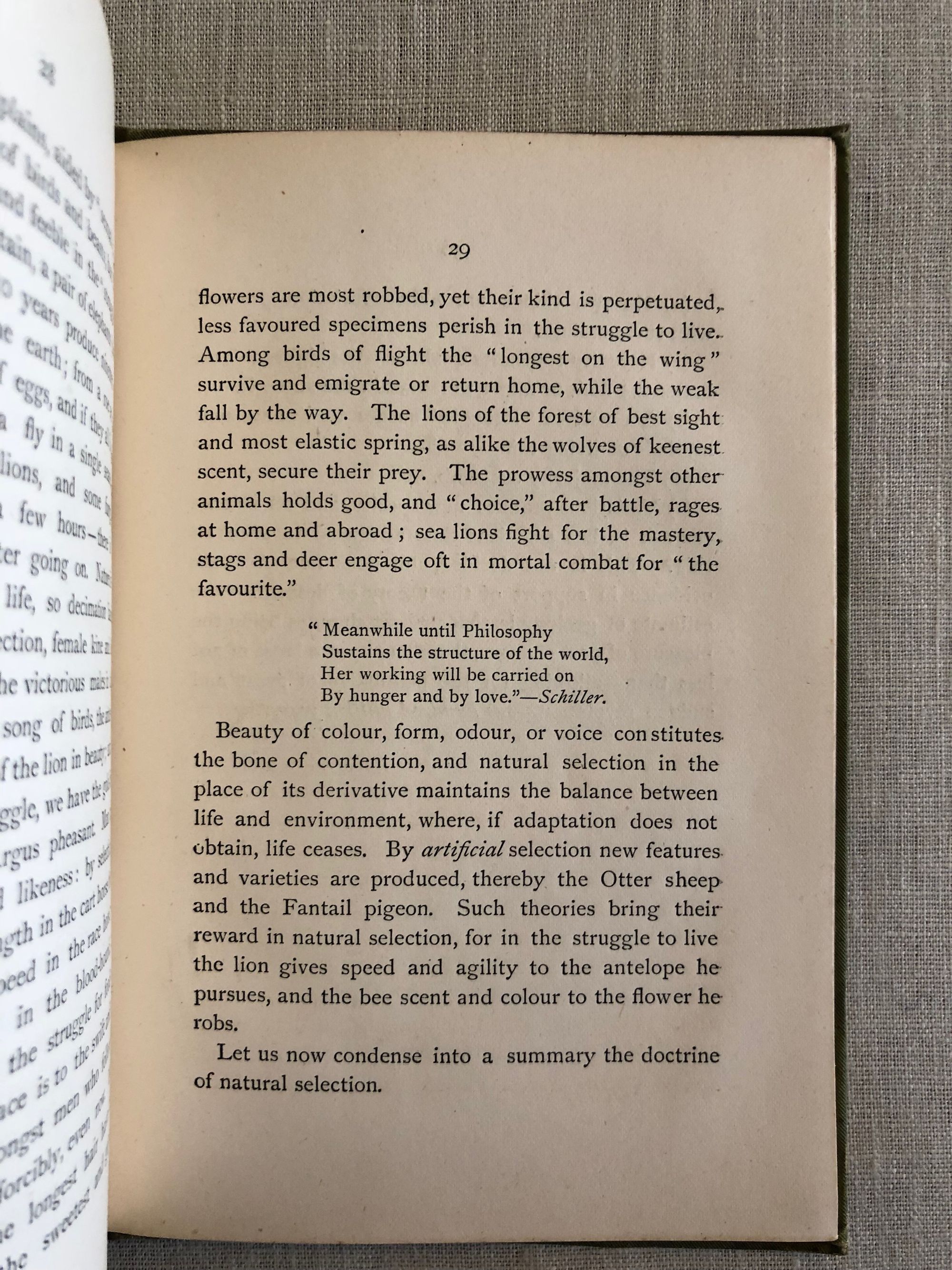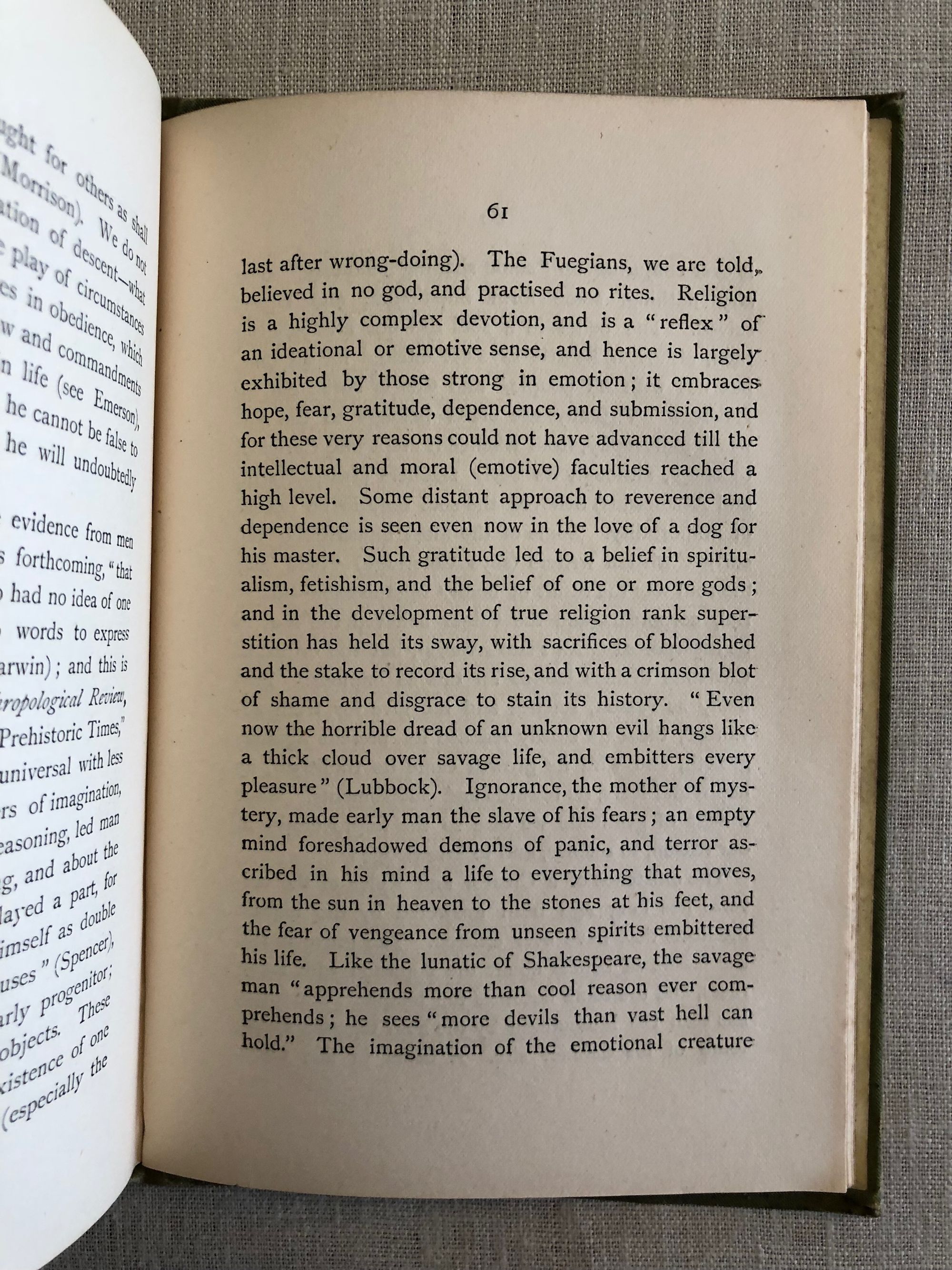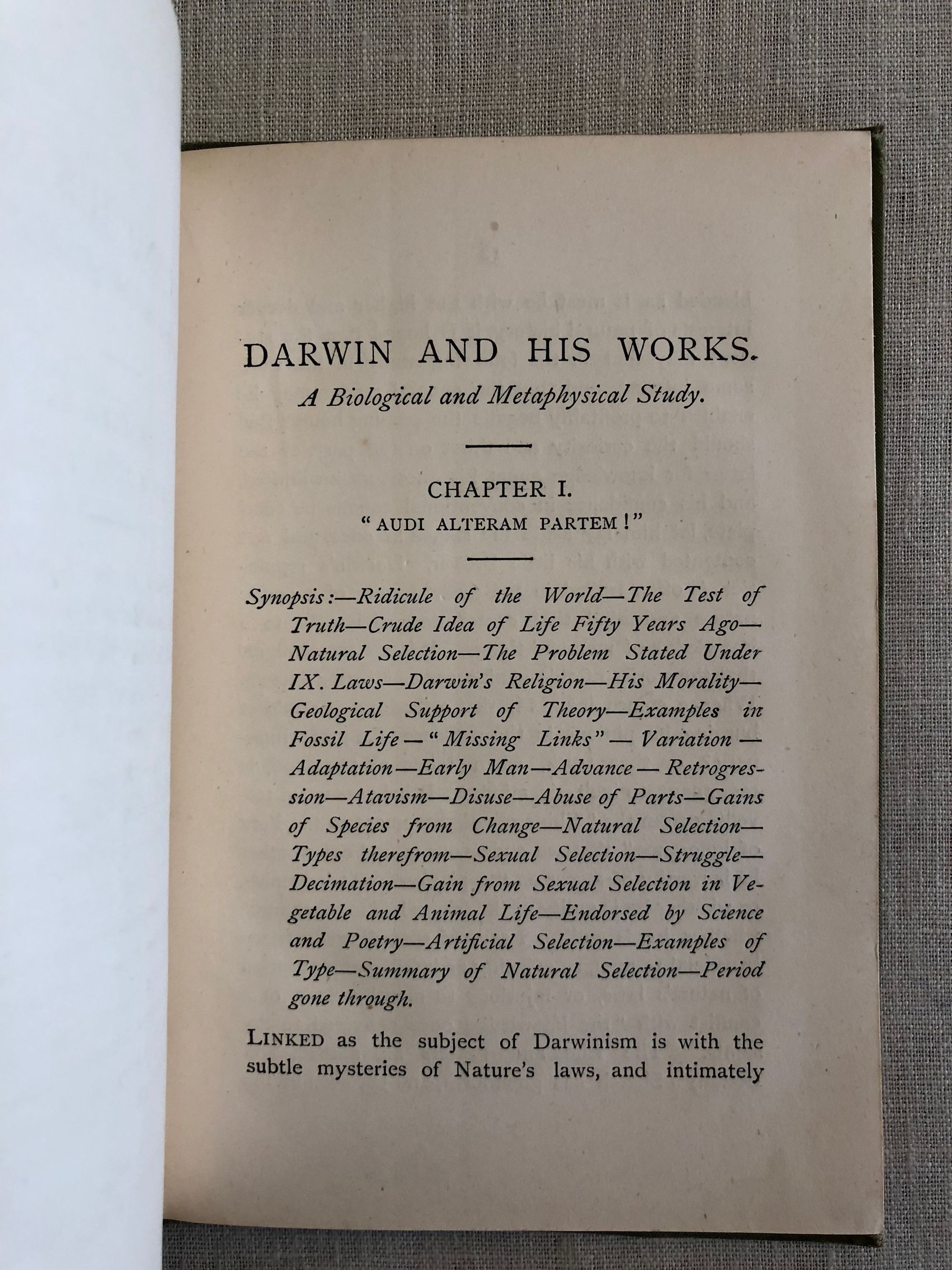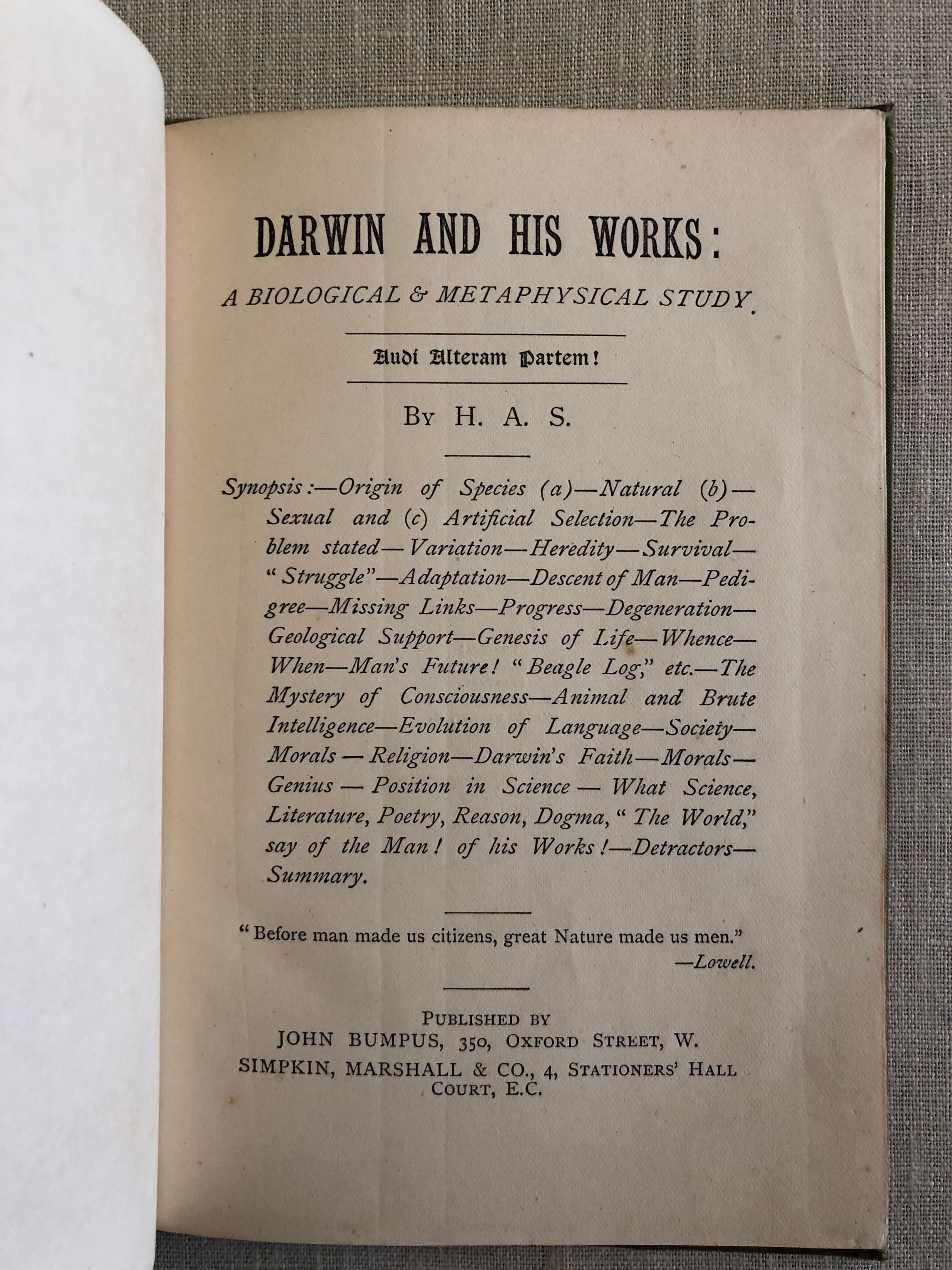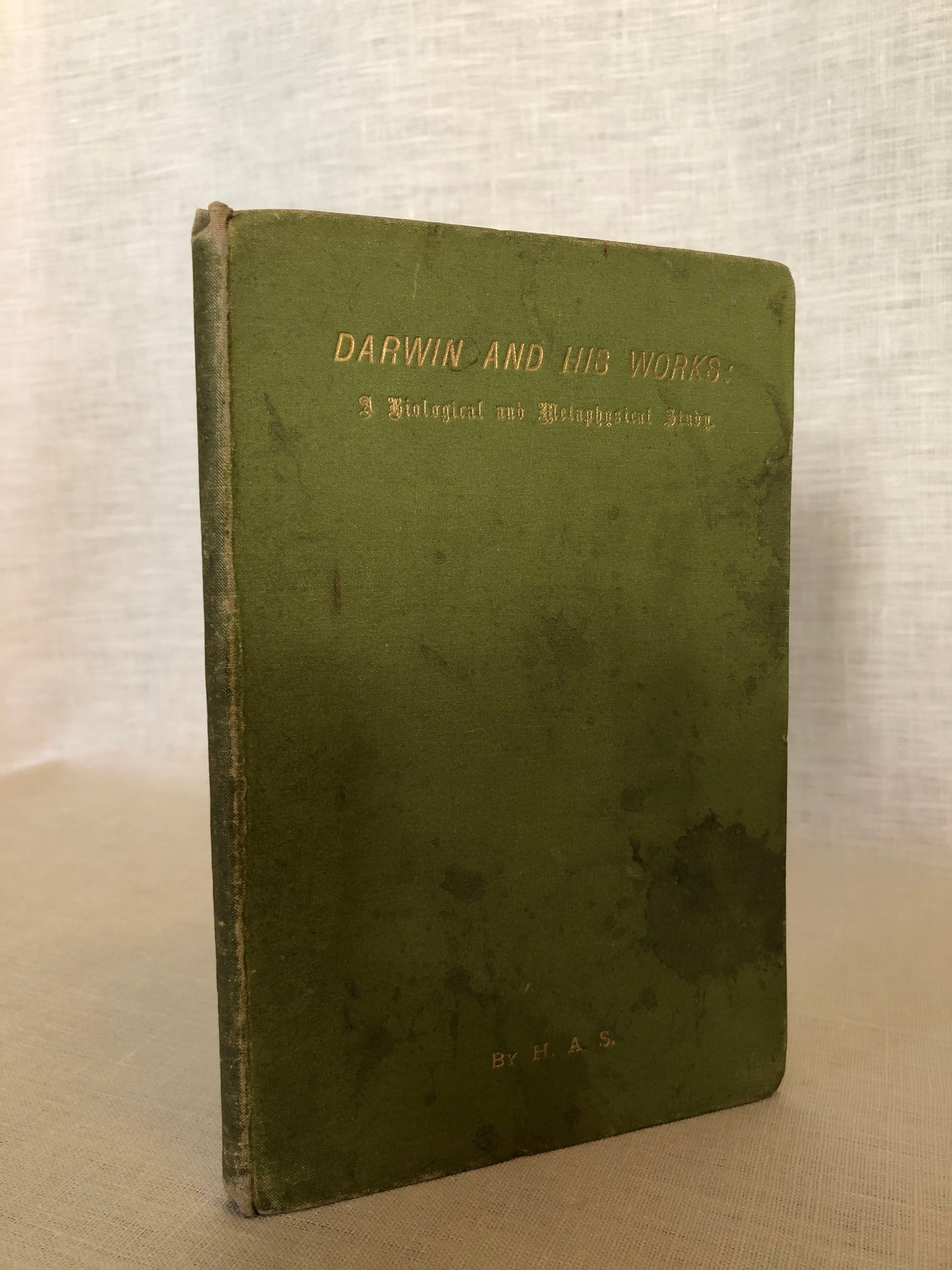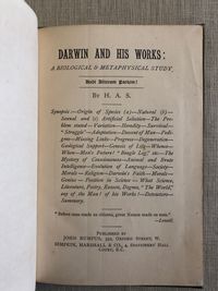 Hard cover, 12mo., 83pp. Condition: Good. Covers are badly stained, with bumped corners and lightly worn edges. ** Darwin published "On the Origin of Species" in 1859 and this scarce work is an essay in response to criticism of Darwin's theories, and a defense of reason and science. OCLC 26069287.