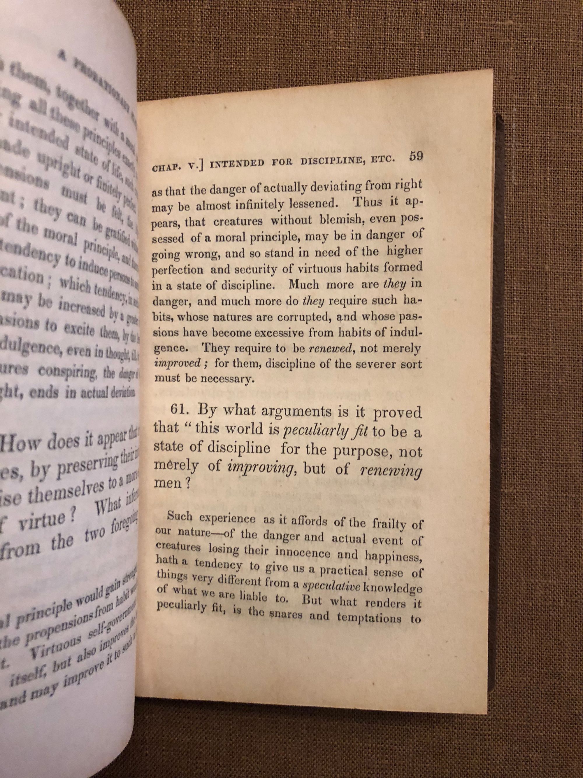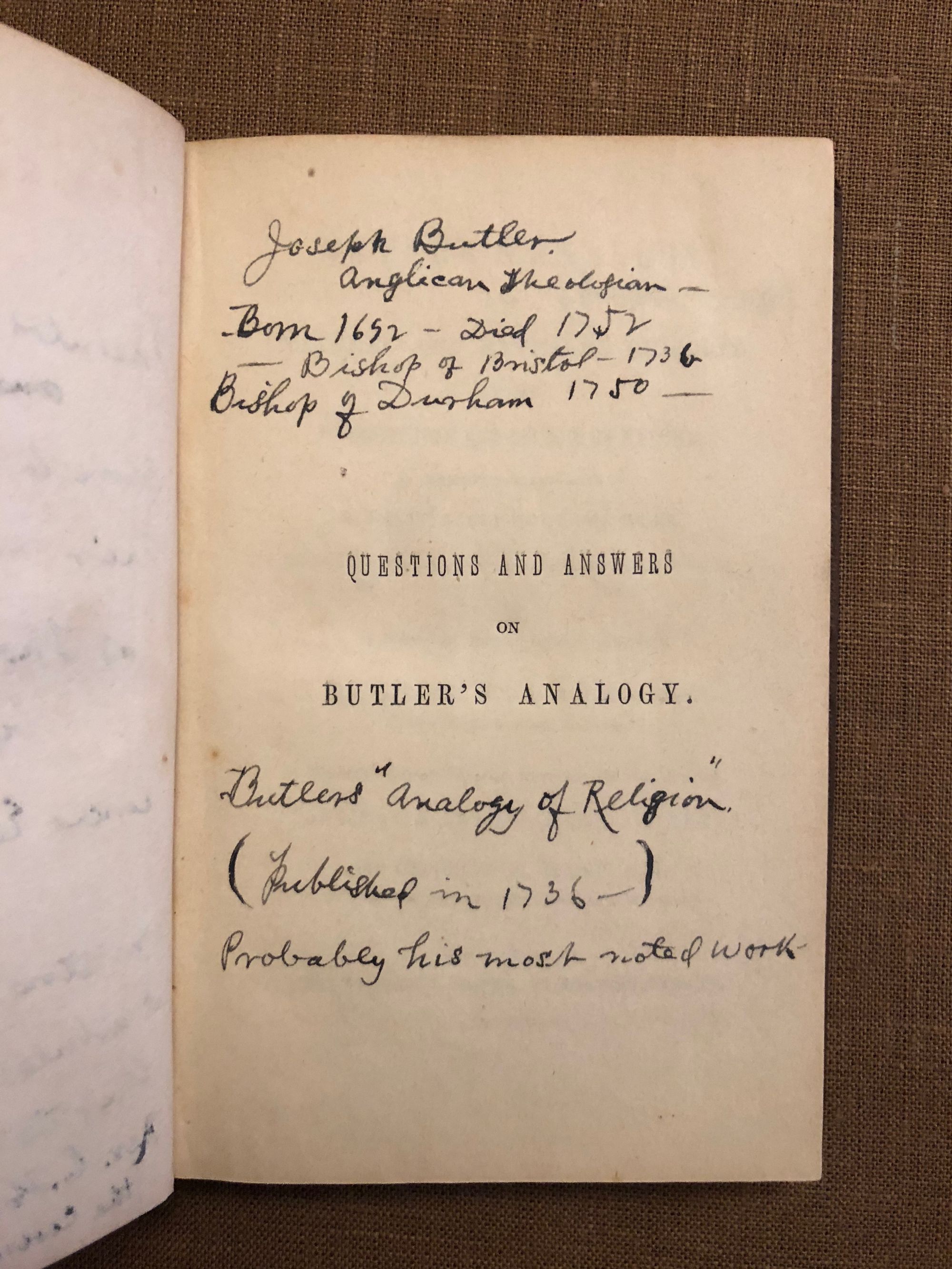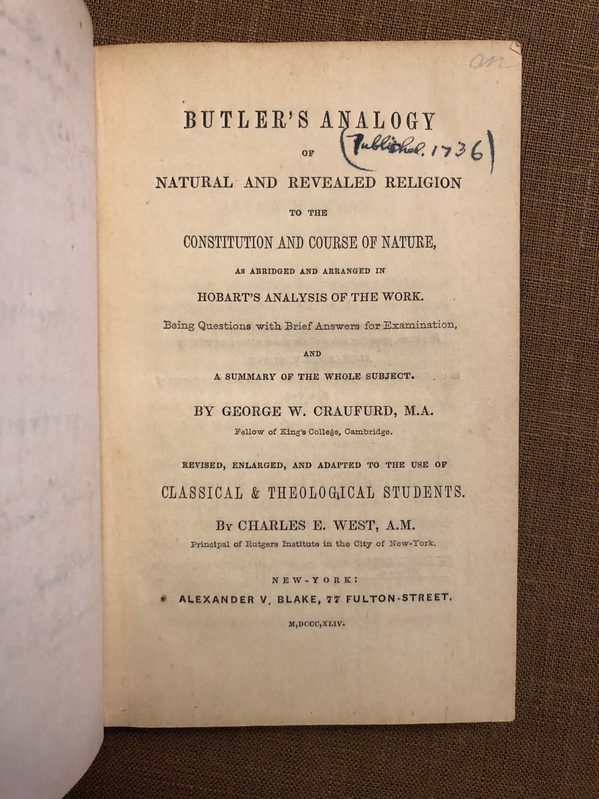 Hard cover, 12mo., pp xii 171 [1] 8. Quarter-leather binding with gilt lettering to spine. Condition: Good. Commentary on Butler's Analogy - which defended the Christian Faith against the human-centered thinking of Thomas Hobbes and others - designed to help the reader in "acquiring a thorough knowledge" of that work. Condition: Shelf-wear to covers. Annotated in old ink hand to front flyleaf, half-title and title page.