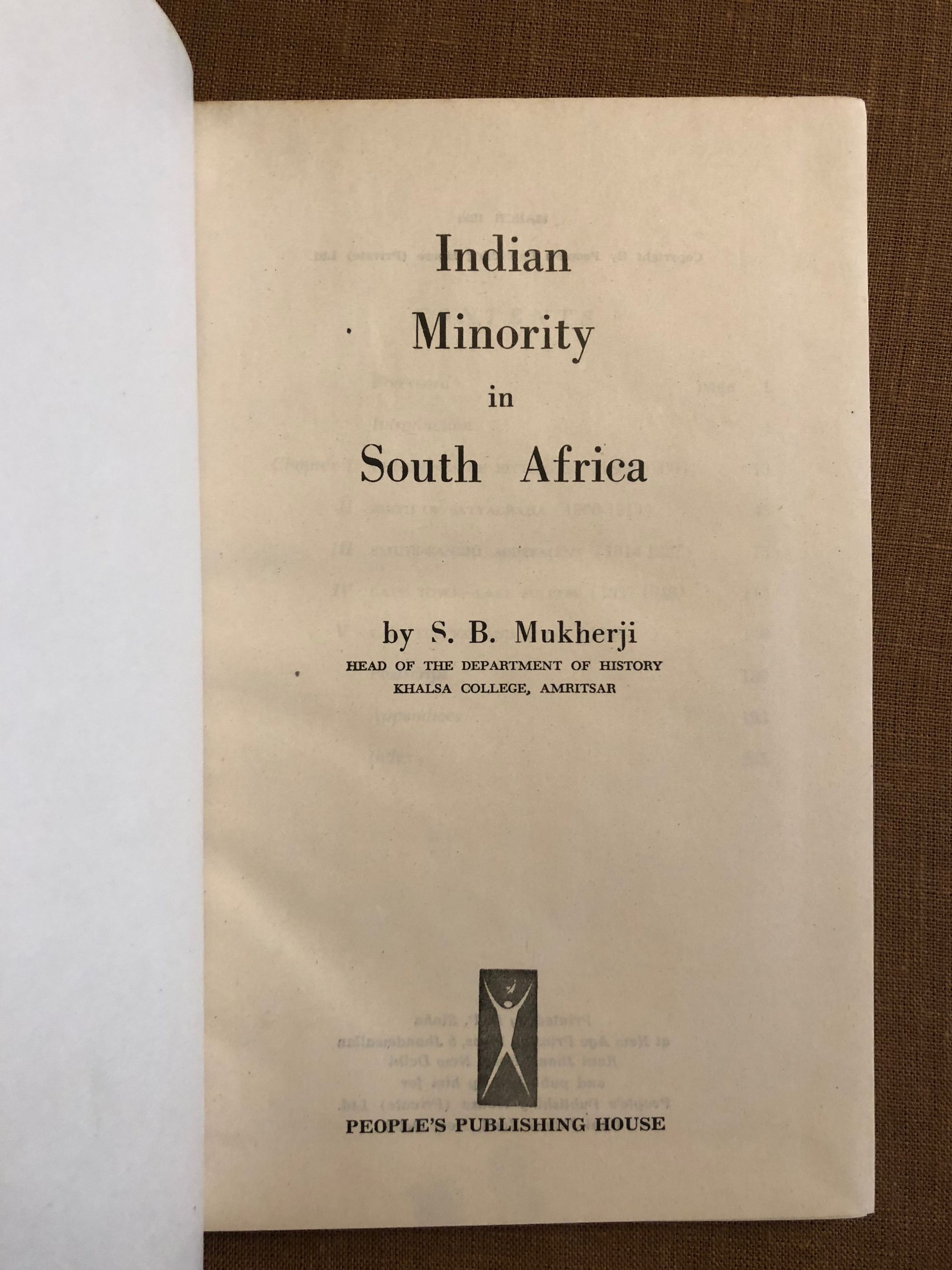 Hard cover, 8vo., 211pp. In publisher's gray cloth boards with black lettering to spine. Condition: Very Good. Ink mark to bottom of contents page. ** S.B. Mukherji was a professor at Khalsa College, Amritsar. A history of Natal, a Crown Colony before South Africa came into being, and the importation of Indian labor to work in its mines and plantations. Chapters on "Beginnings of Bitterness (1860-1900)", "Birth of Satyagraha (1900-1914)", "Smuts-Ghandi Agreement (1914-1927)", "Cape Town - Lake Success (1927-1946)", and "Lake Success and After (1946-)". OCLC 261653.