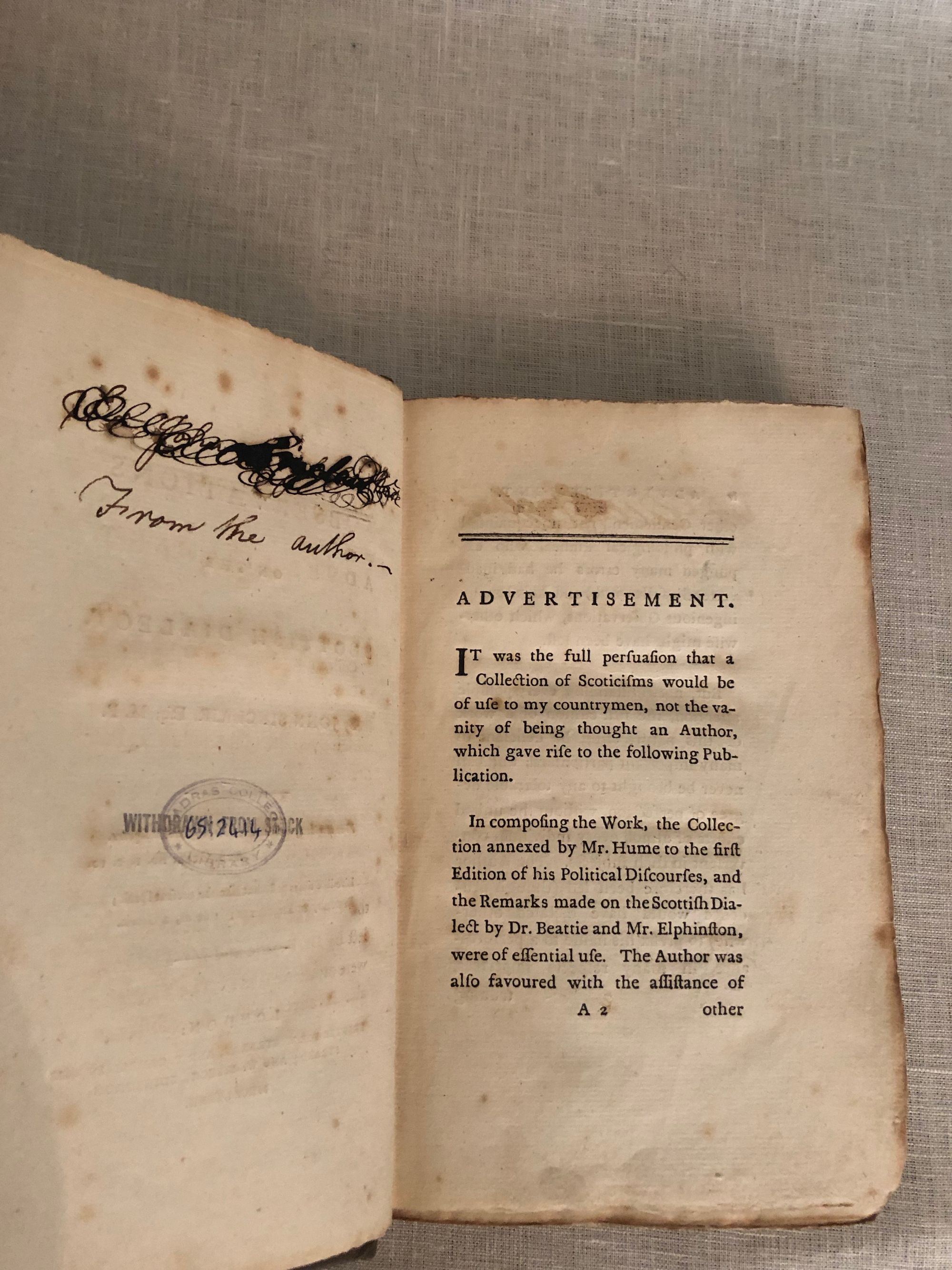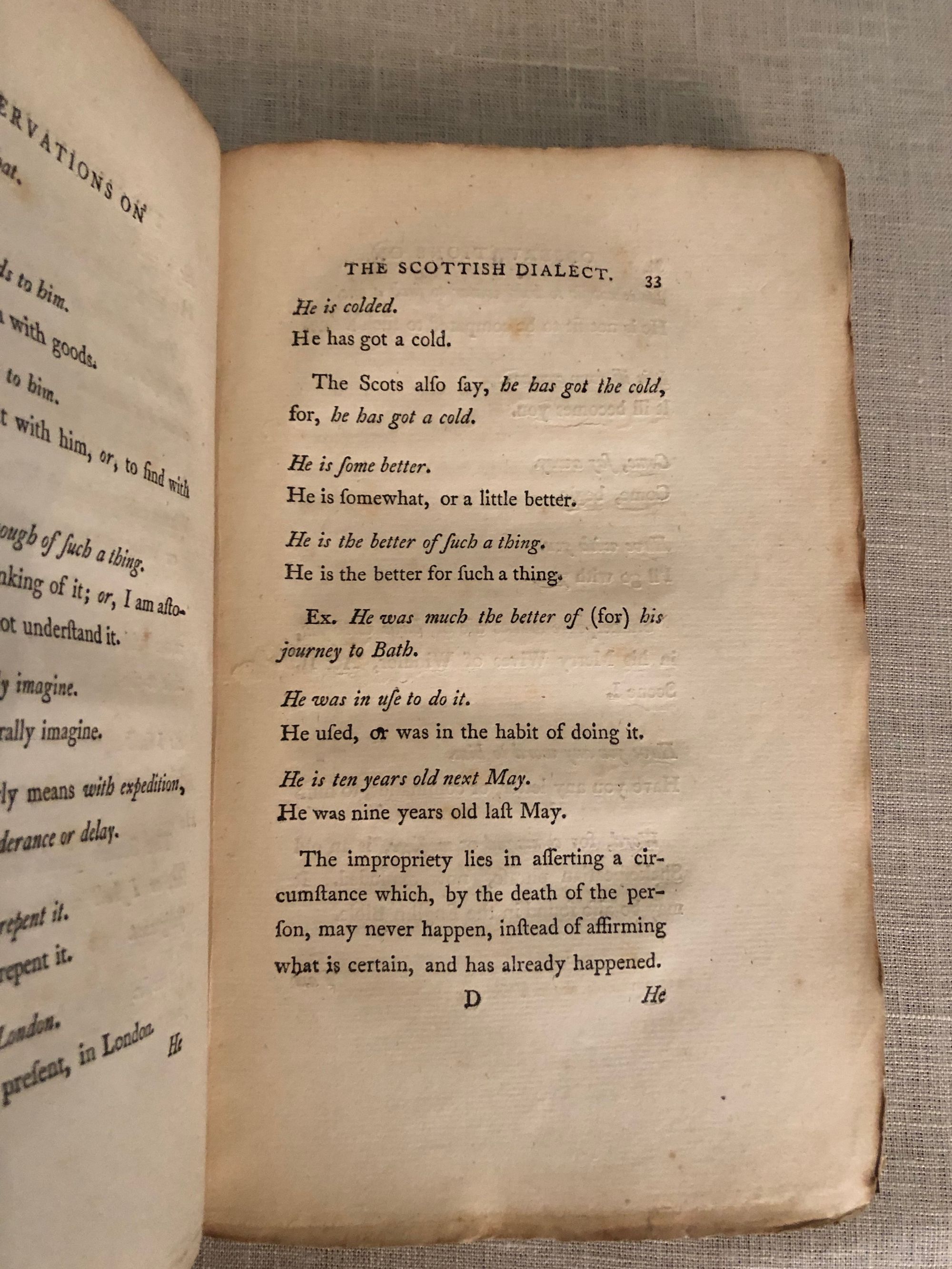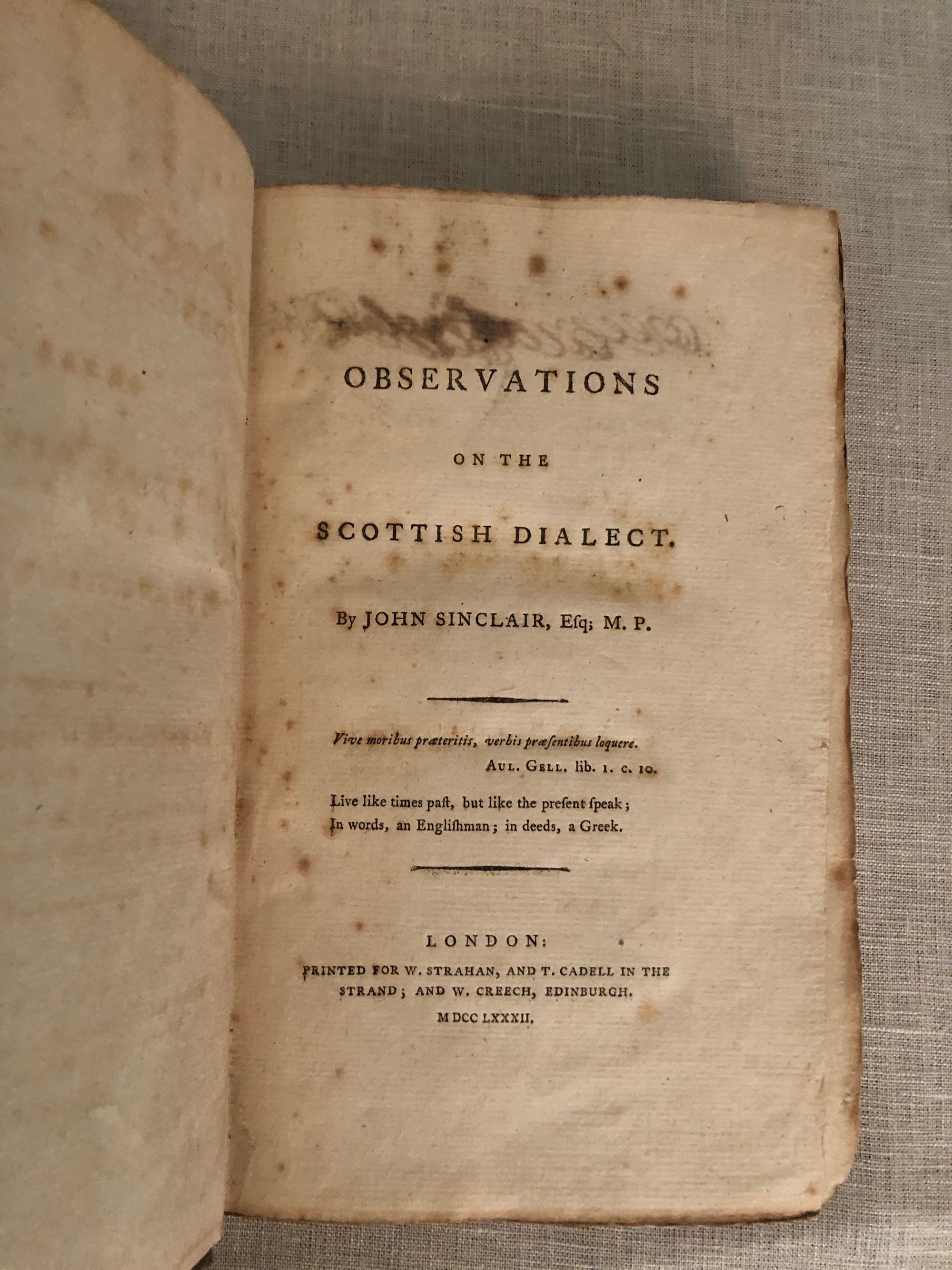 pp v [3] 232. Presentation copy by the author (inscribed "_____ From the author" on the back of the title page - the recipient's name has been covered over in old ink). Modern cloth binding with gold lettering to spine. Sir John Sinclair (1754 - 1835) was a Scottish writer, famous for his survey of Scottish life, the "Statistical Account of Scotland", published between 1791 and 1799. In this volume, Sinclair describes some of the words and phrases of the Scots language (which he calls a "dialect") and their derivations (e.g. from Latin, Belgic, Saxon etc). He also touches on language usage in London and other parts of England. Condition: Very Good modern binding with a Very Good text block. Scarce.