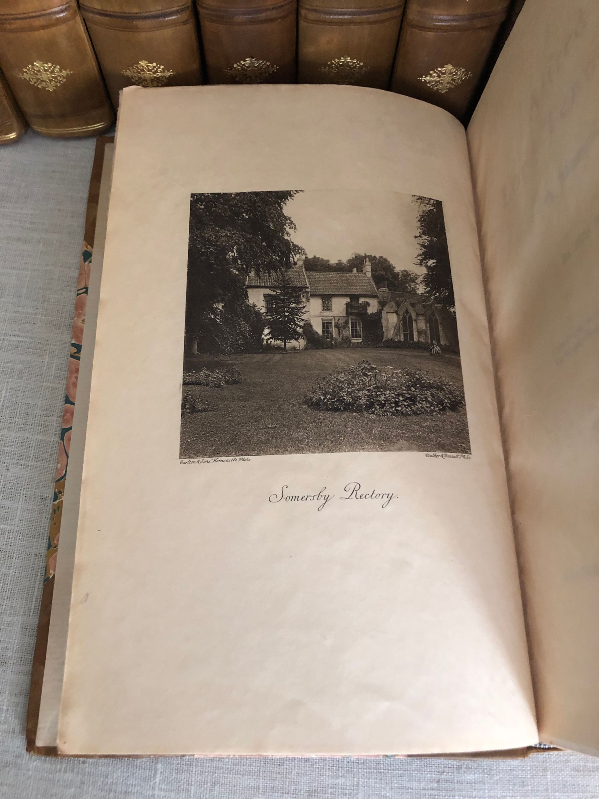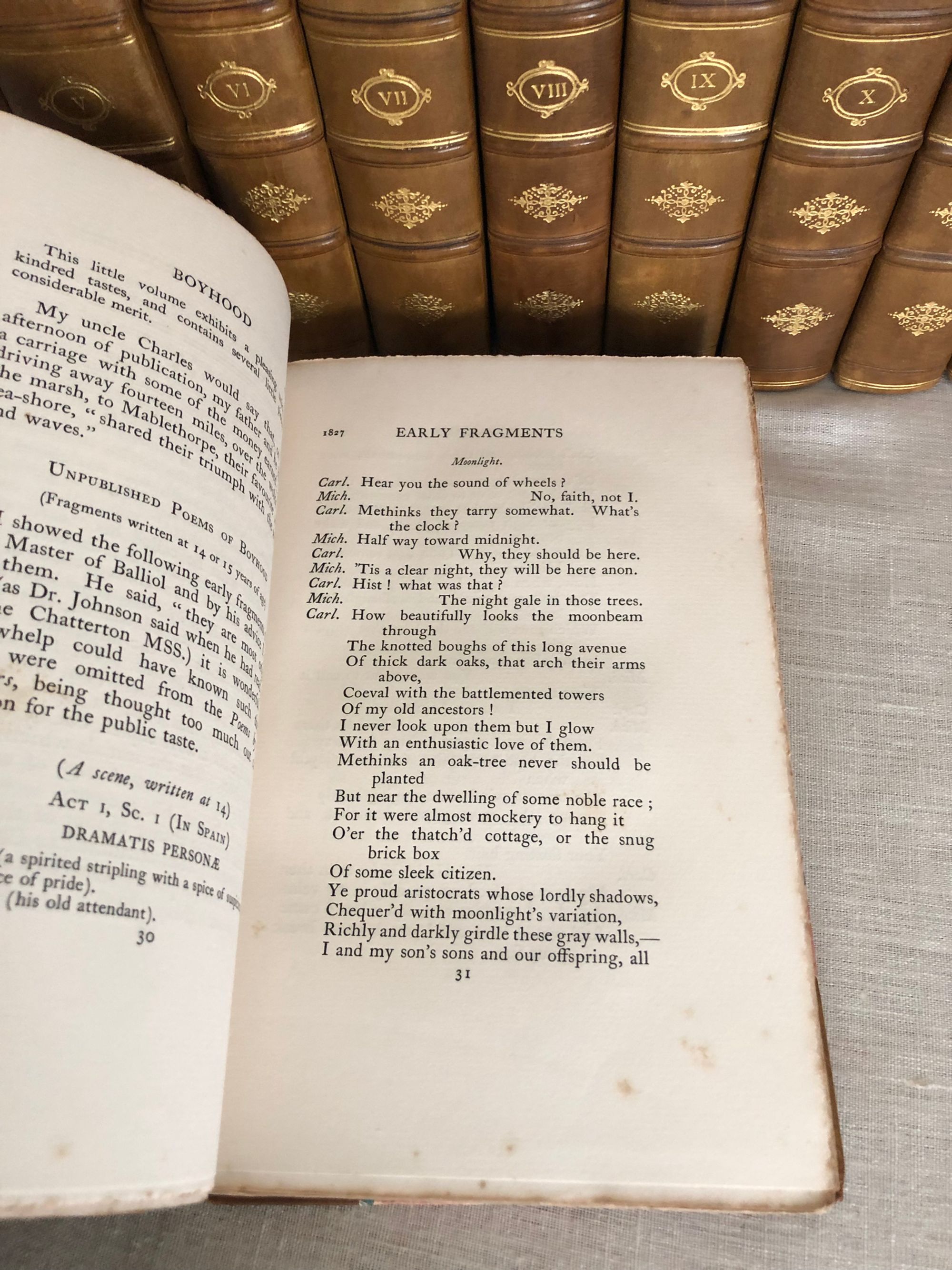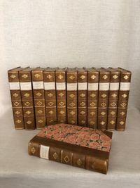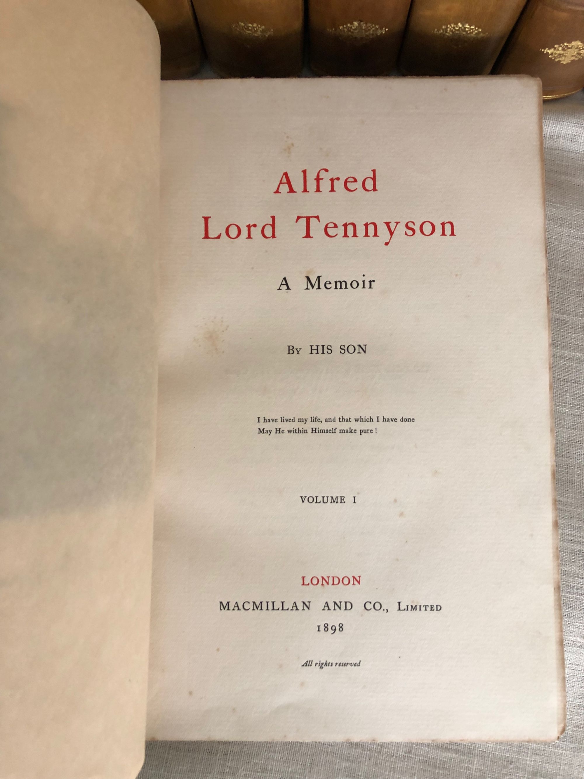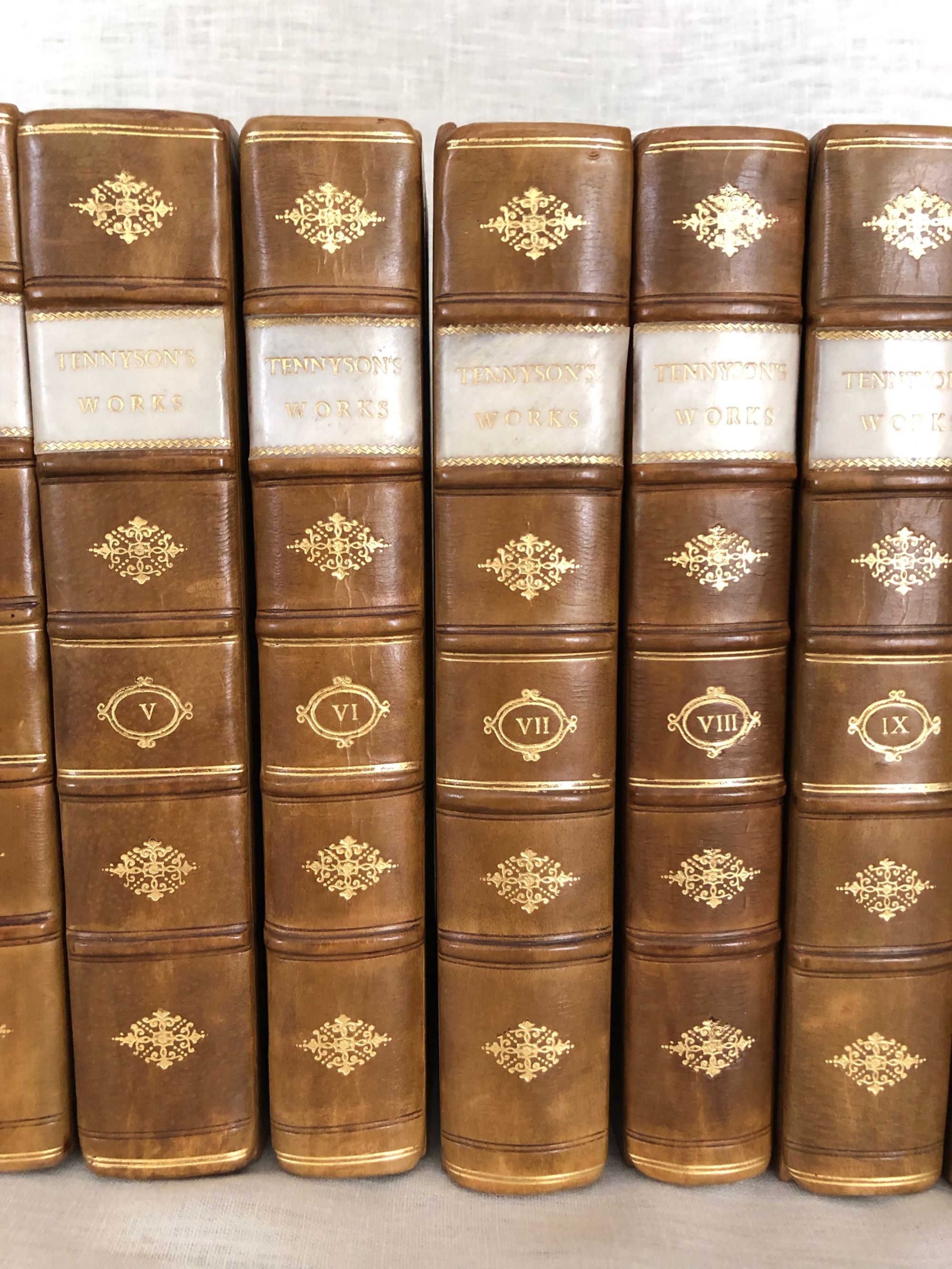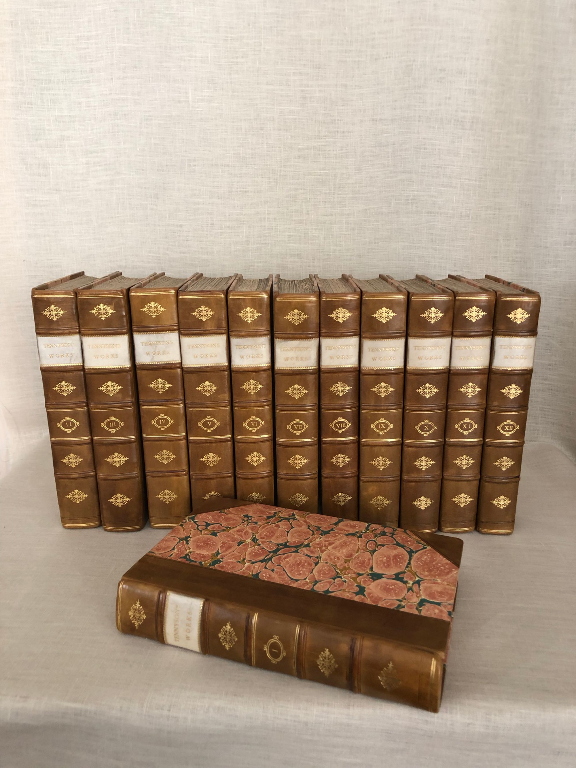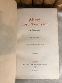 Hardcover, tall 8vo (measuring 6 x 9 3/4 inches), finely bound in three-quarter tan calf ruled in blind, over pink, teal and tan marbled paper-covered boards, with five raised bands to the spine, vellum label with gilt title, tooled decoration and volume numbers to remaining compartments, l pp xxviii 316; (6) 357; (6) 349; (8) 360; xiv 382; viii 312; viii 358; viii 295; viii 332 (2); viii 306; viii 308; viii 293pp. First Edition. Limitation statement:"1050 copies of the Edition de Luxe." **Alfred, Lord Tennyson (1809 - 1892) was British poet famous for works such as "The Charge of the Light Brigade", and "In Memoriam", as well as the blank-verse poem-cycle on the Arthurian legends, "Idylls of the King". He was particularly admired by the Pre-Raphaelites, and is one of the most quoted writers in English. His son, Hallam Tennyson (1852 - 1928) wrote a biography of his father which comprises the first four volumes of this set. Condition: Very Good Plus. (Externally the set is about Near Fine.) There is light scattered foxing throughout, mostly at prelims, and volume III has some old damp-staining to one corner of the pages. Some pages are unopened. A scarce edition (seen only in The British Library.) OCLC 504700921. (22.7 lbs.)