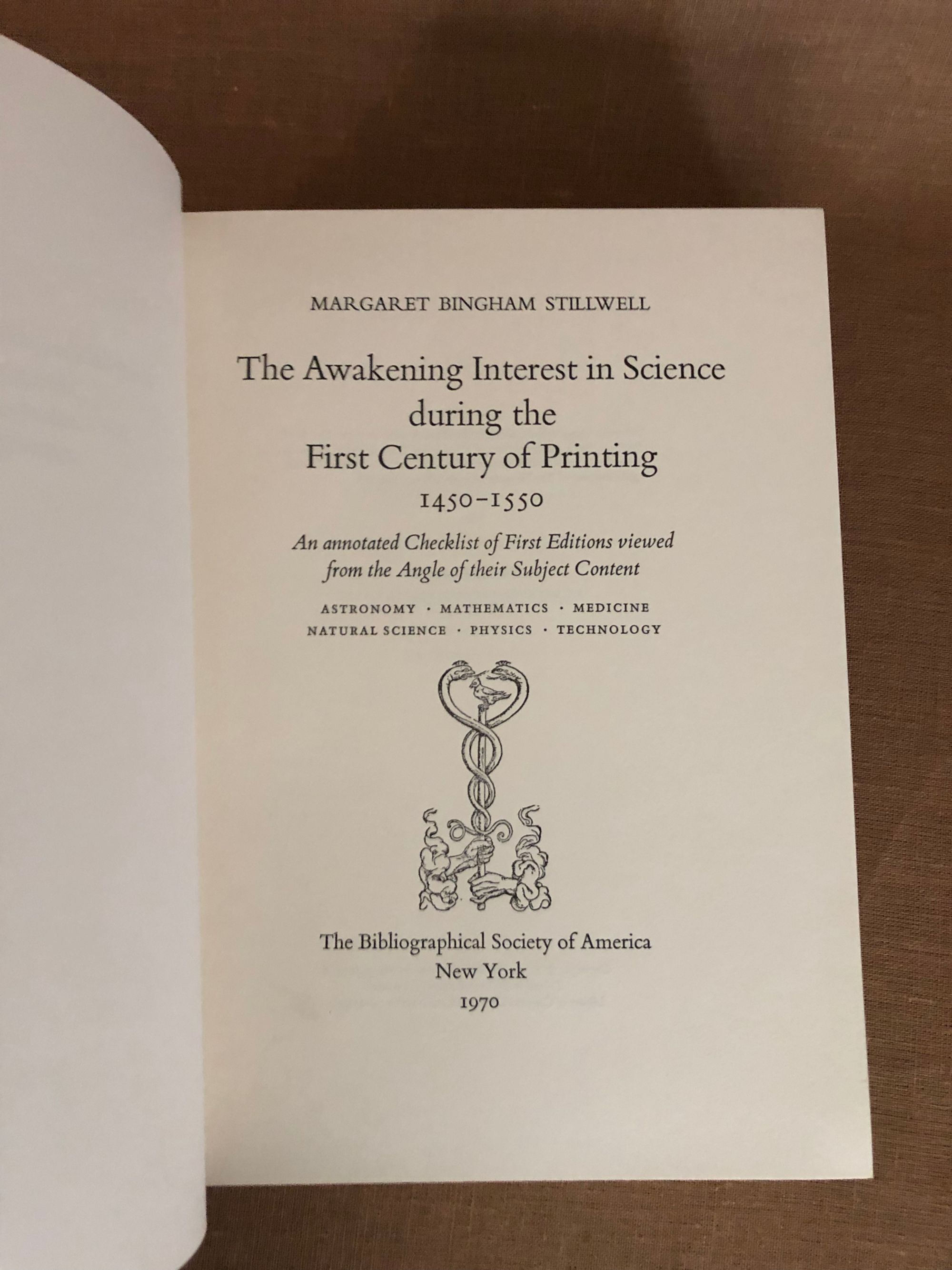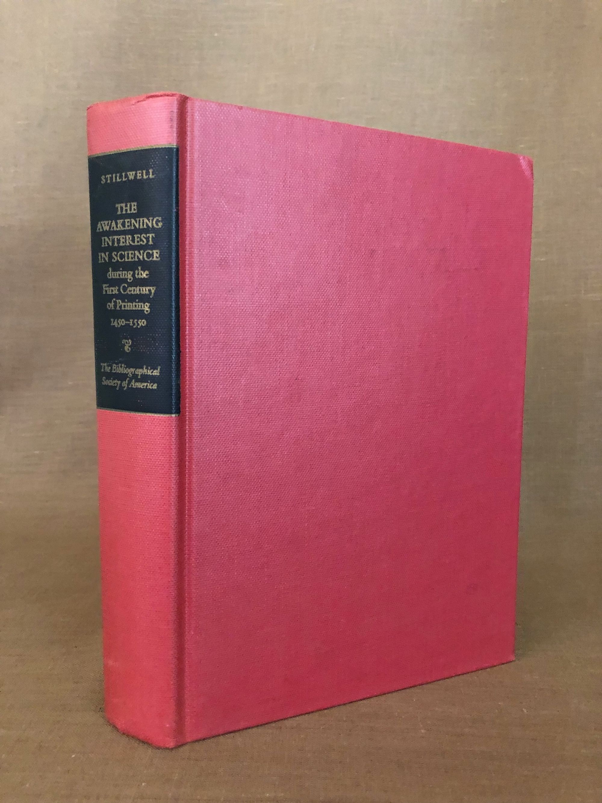 Stillwell, Margaret BinghamThe Awakening Interest in Science during the First Century of Printing. 1450 - 1550. An annotated Checklist of First Editions viewed from the Angle of their Subject Content. Astronomy, Mathematics, Medicine, Natural Science, Physics, Technology.Published by The Bibliographical Society of America, New York, 1970.First Edition