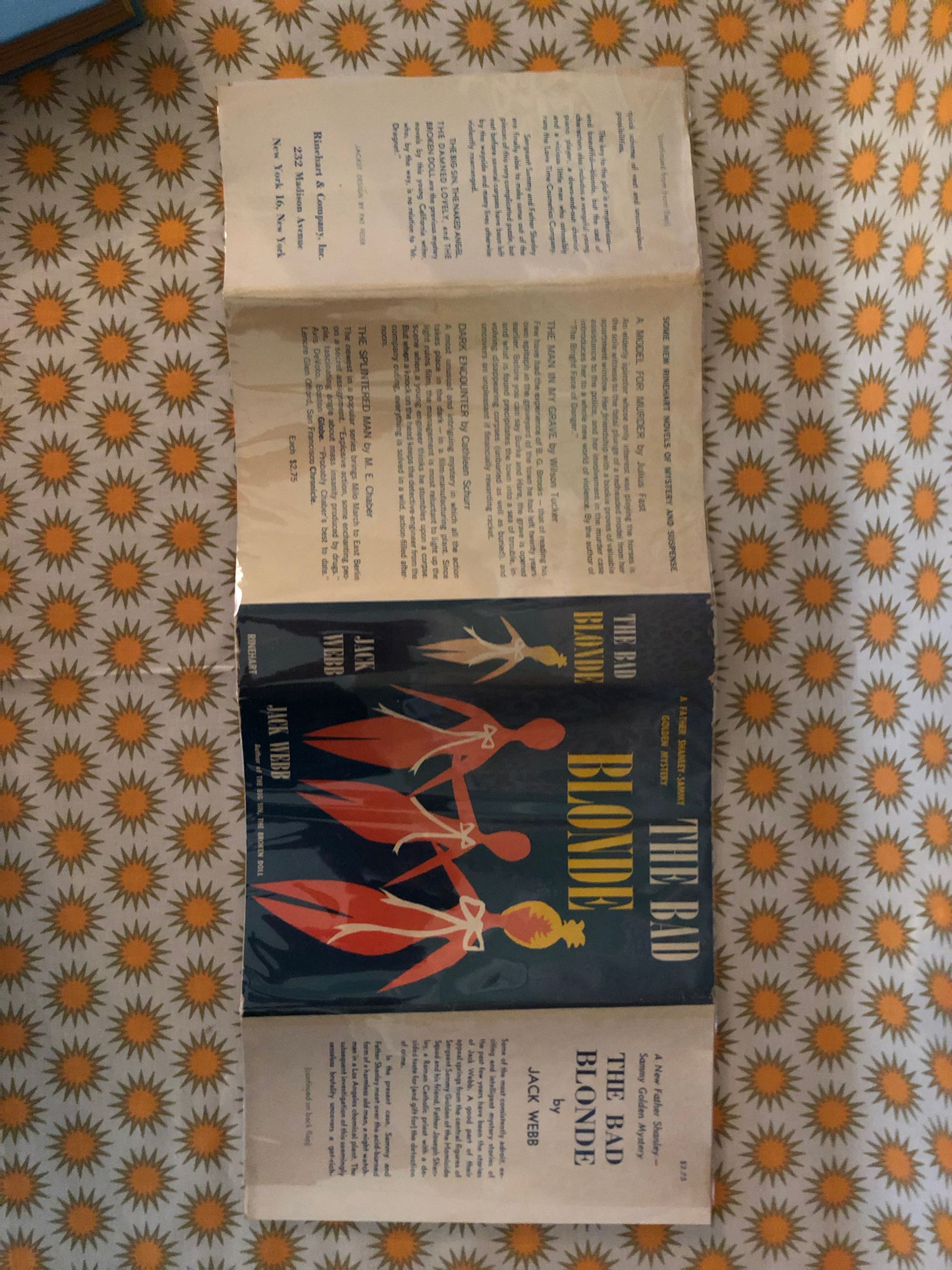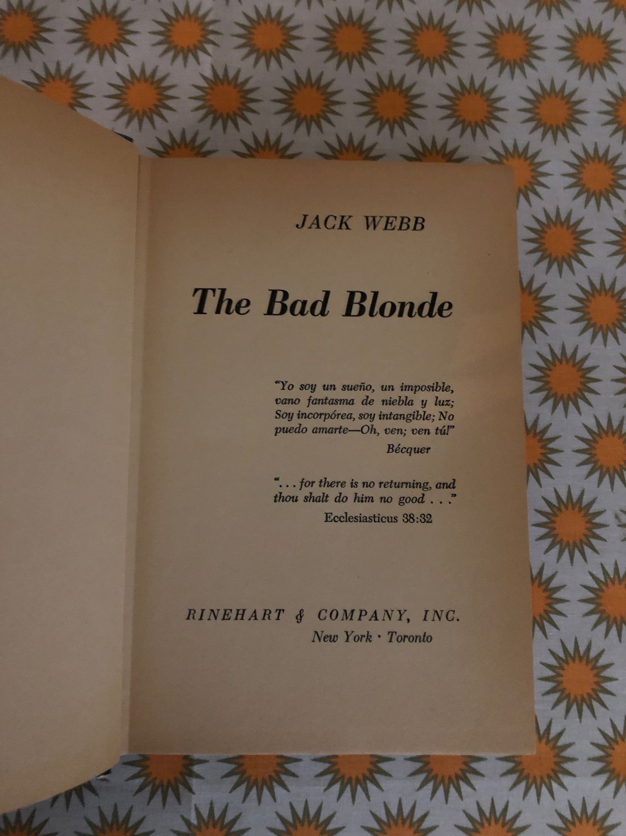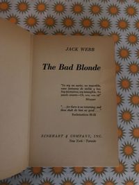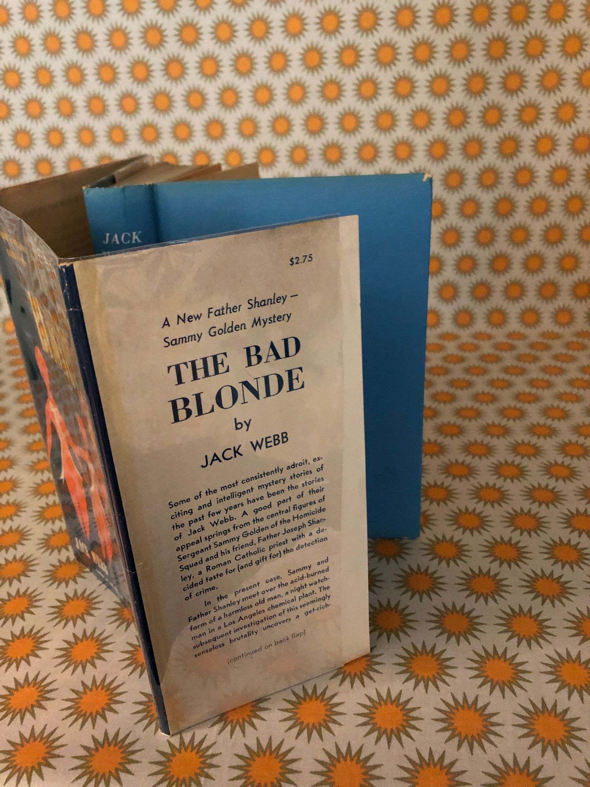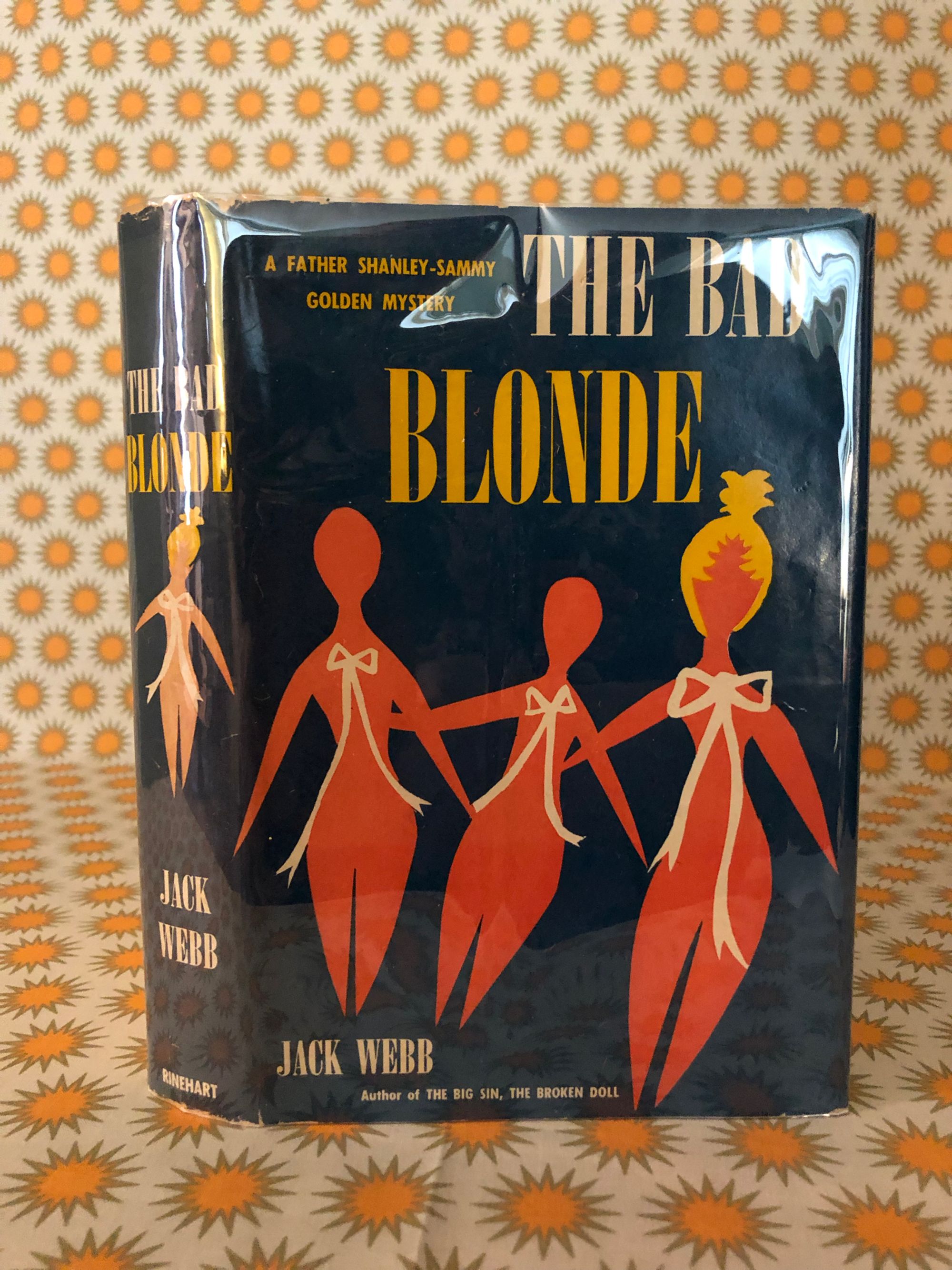 245pp. Scarce hardcover, with light blue cloth-covered boards, yellow and white titling, and dust jacket cover art by Pat Feder. JOHN ALFRED "JACK" WEBB (1916-2008) wrote a number of noir murder mysteries set in Los Angeles, California of the 1950's and 60's, this volume being the fifth featuring the dynamic detecting duo of Father Joseph Shanley and LAPD's Sammy Golden of the Homicide Squad. "A wanton blonde's clandestine romance sets police detective Sammy Golden and his crime-busting partner Father Joseph Shanley on the trail of a ruthless mobster who deals in dope and death. This is a fast, taut thriller. Condition: Very Good+ in a like dust jacket. Slight edgewear to corners and tail of spine of book, as well as the age- toning to be expected. Otherwise, tight and clean. Dustjacket is just about immaculate for its age, showing only remnants of small corner folds on two turn-ins, and the merest edge abrasion.