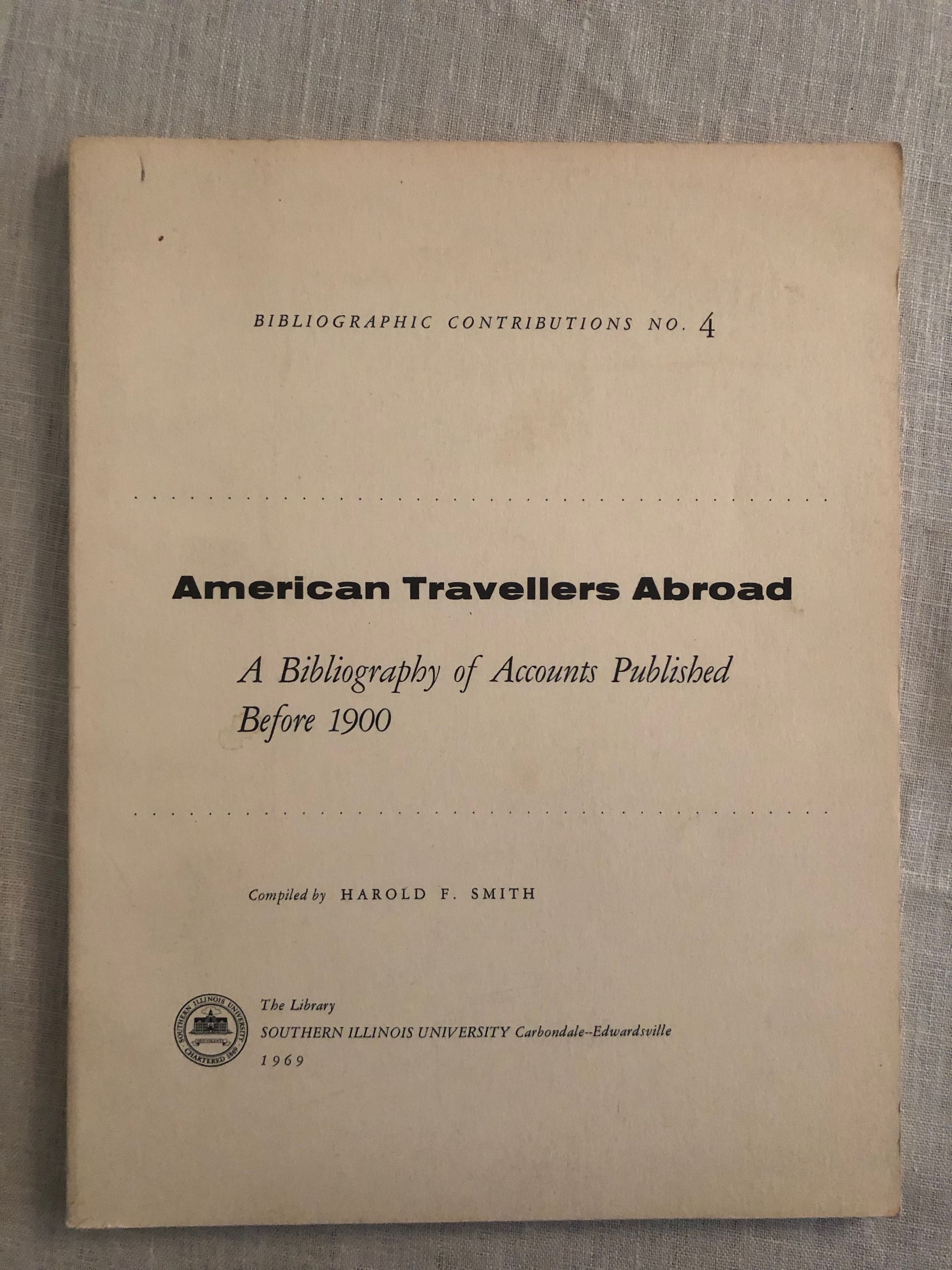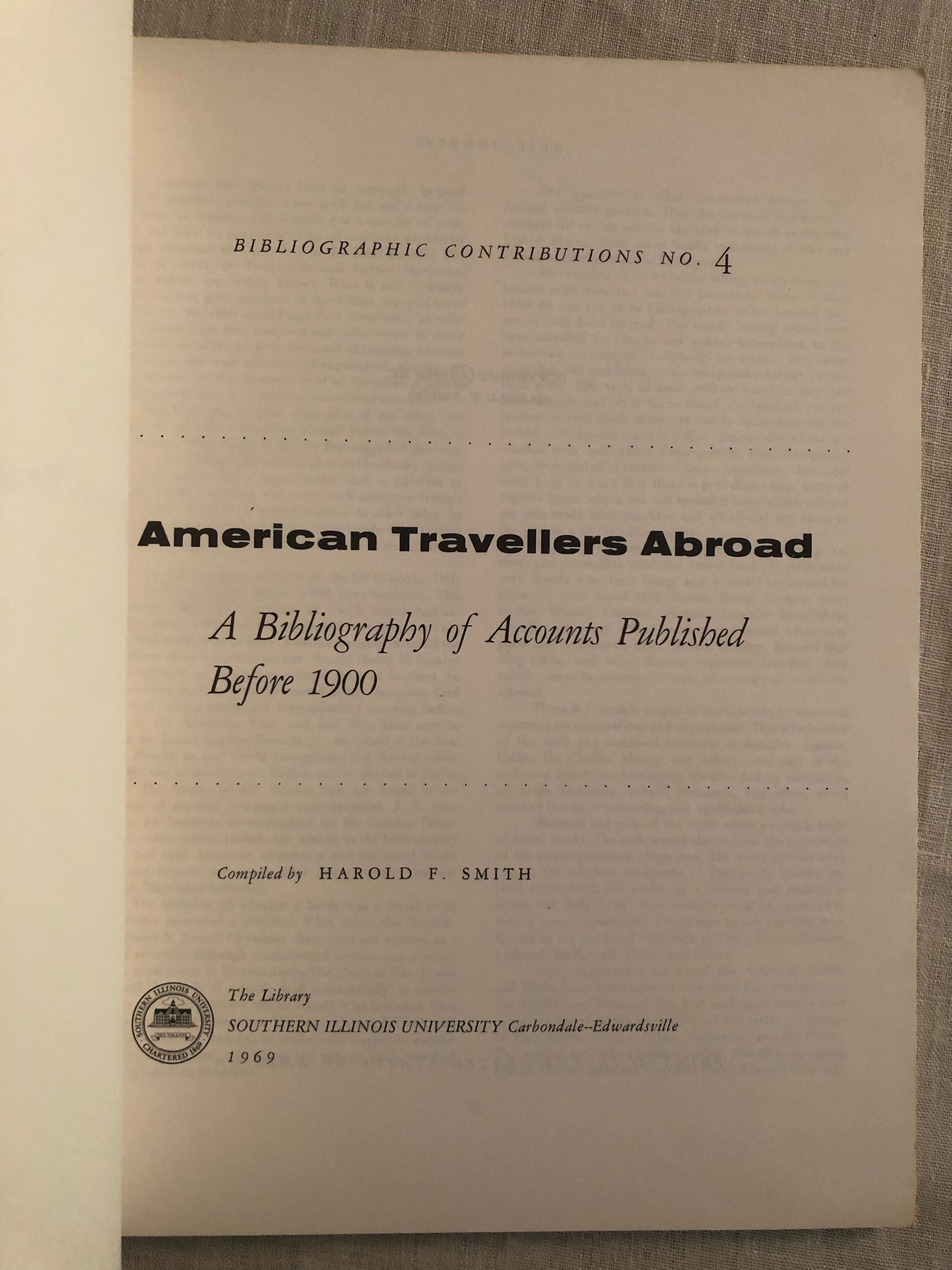 Smith, Harold E.American Travellers Abroad. A Bibliography of Accounts Published Before 1900.Published by The Library, Southern Illinois University, Carbondale-Edwardsville, 1969.First Edition