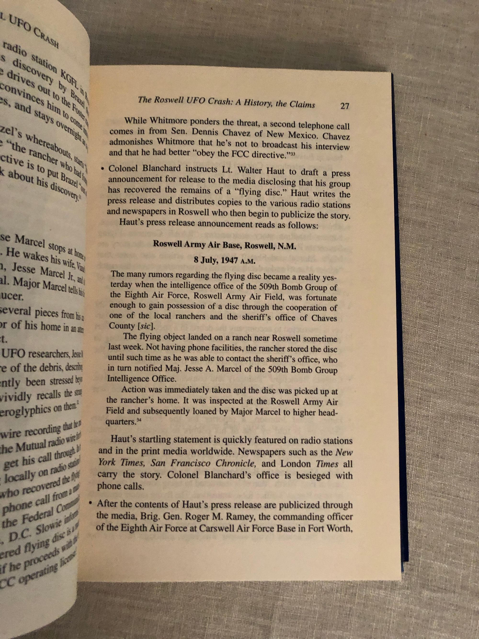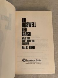 Hardcover with dust jacket, 264 pp. 8vo., in blue cloth trade binding with gilt titles. Author Kal K. Korff is the CEO of TotalResearch, an organization "studying the realm of the normal and the paranormal." Relates facts pertaining to the famous 1947 UFO crash near Roswell New Mexico, including new eye witness accounts, and further explanation of a coverup. Includes photographs and index. Condition: Fine, with a Fine dust jacket.