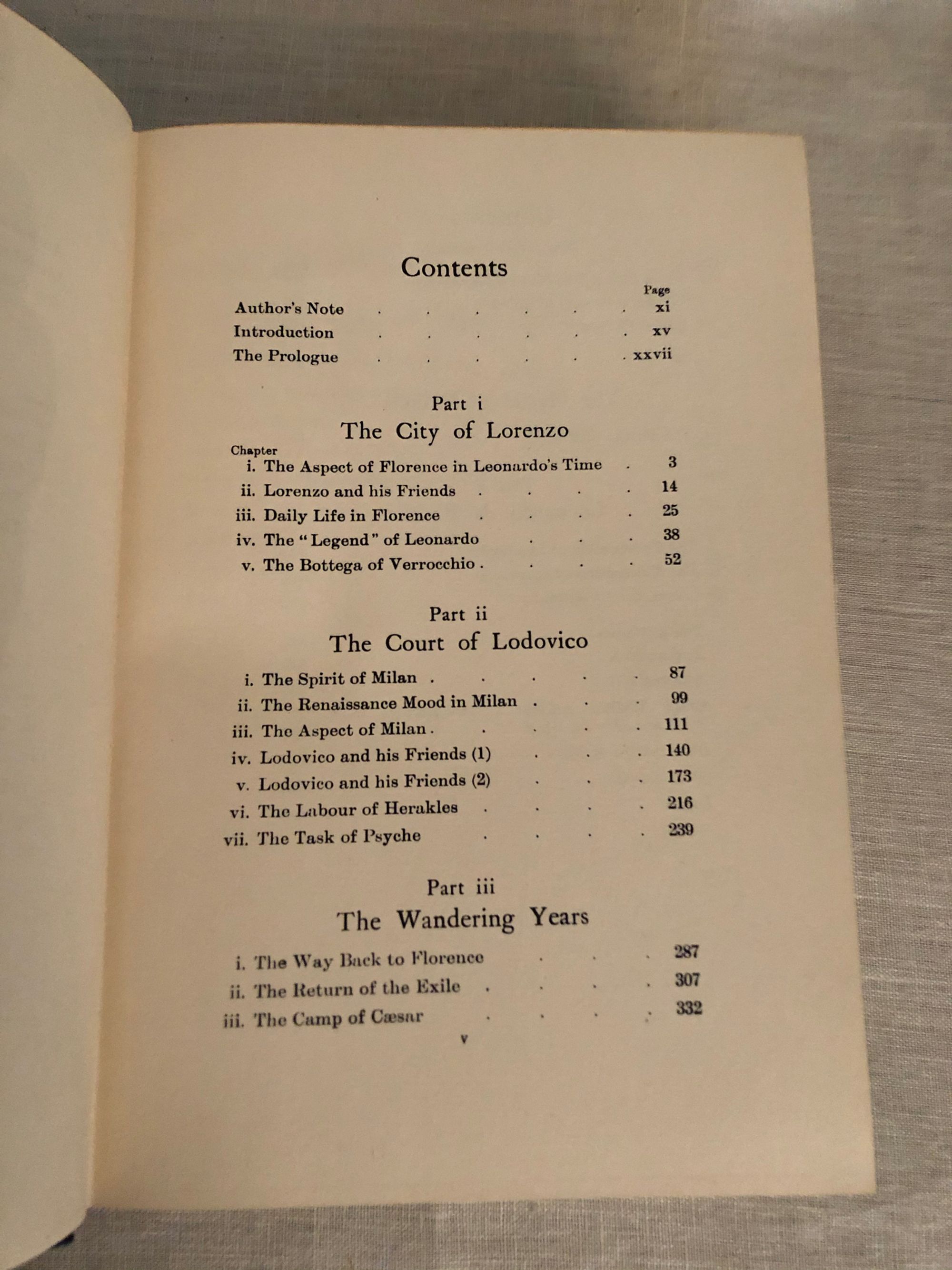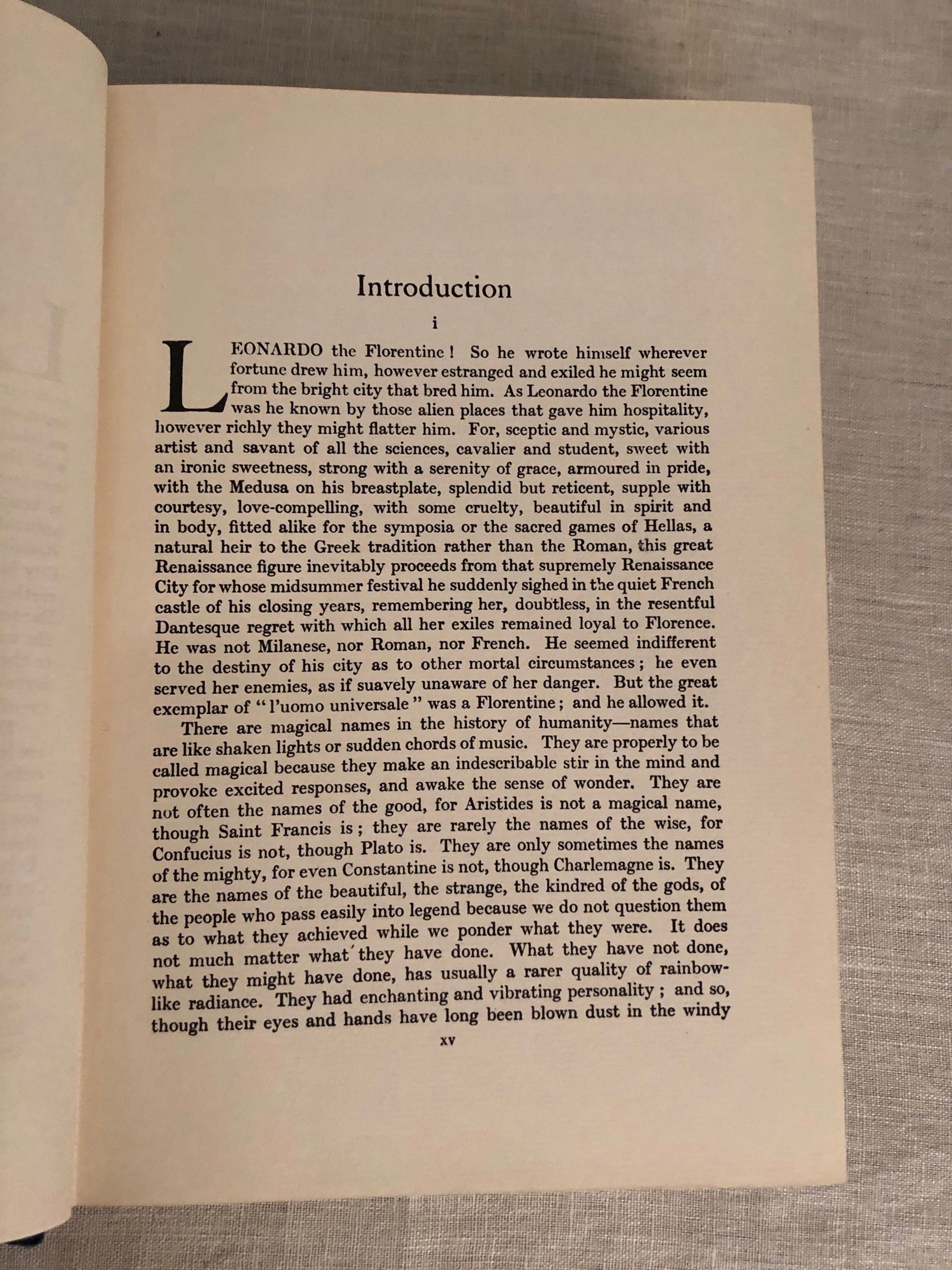 Hardcover, 8vo, blue cloth with gilt titles (no d/j), top edge colored ochre, 580 pp. Author Rachael Annand Taylor (1876-1960) was a Scottish lady poet, and one of the first females to study at the University of Aberdeen. She was also a journalist and teacher, as well as writing several non-fiction works about the Renaissance. She and her husband mixed in "Celtic Revival" circles in Dundee; her poetic works were criticized for a backward-looking Pre-Raphaelite medievalism. The current volume was undertaken after Taylor's resettlement in London, following separation from her husband. In the opening Note to this volume, the Oxford Classicist Gilbert Murray praises Taylor's "power of poetic interpretation" of her subject. The author gives this introduction to her topic: " If, in describing one side of the psychical history of Leonardo, I have contemplated the full tide of Renaissance energy as it sweeps around his art, have tried to restore the cities in which he dwelt, and to reanimate the people who decided his movements, it is because only this kind of indirect approach seemed to offer any novel angle from which to consider his unique and baffling figure." Includes nine black and white illustrations, various Appendixes, a Chronology, Bibliography and index. Condition : Very Good. Slight shelfwear, with two slightly bumped corners and a small imperfection near title. Hinges are intact, and the interior is very clean with minor age-toning.