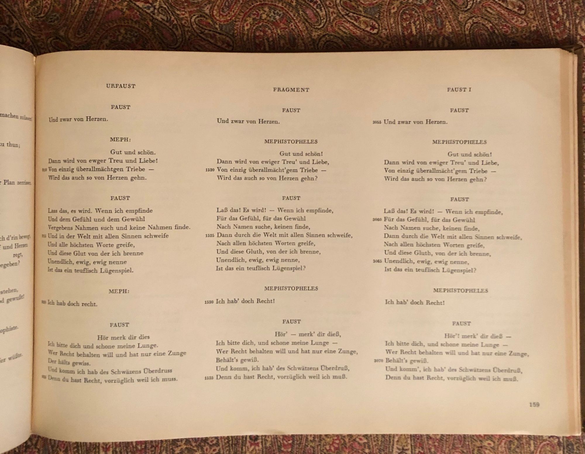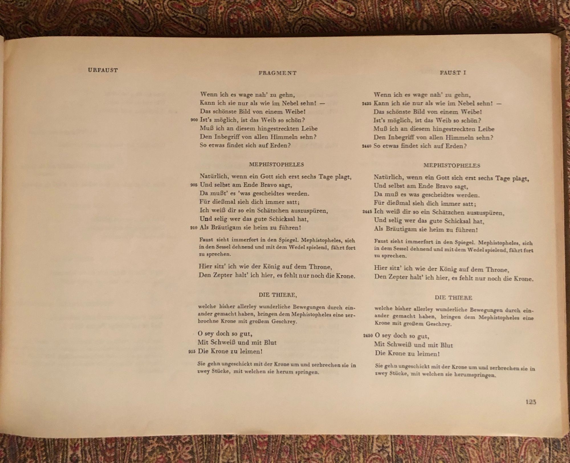 Hard cover, oblong quarto, 261pp plus "scene overview" in pocket at back, ex library, In German. The "Urfaust" is an early draft of Goethe's greatest work, Faust. This tragic play concerns the learned Faust, who make a pact with the devil (Mephistopheles) in order to gain worldly knowledge on the condition that he serves Mephistopheles for eternity. The Urfaust is written in poetic and prose form. Condition: About Very Good, with library stamps to endpapers and title page. Corners lightly bumped.