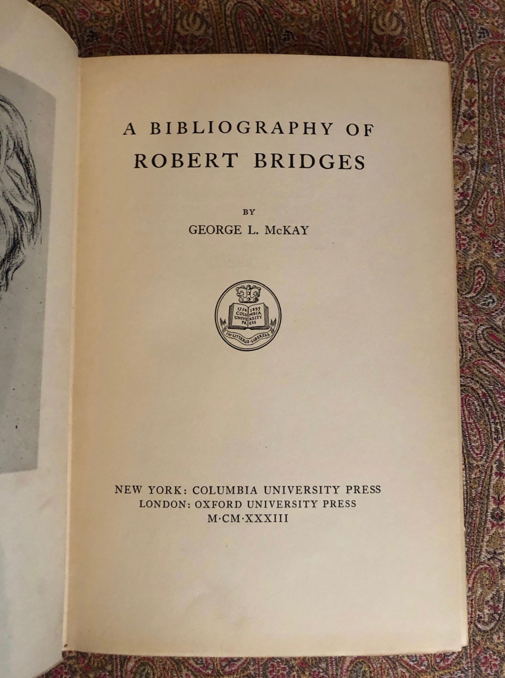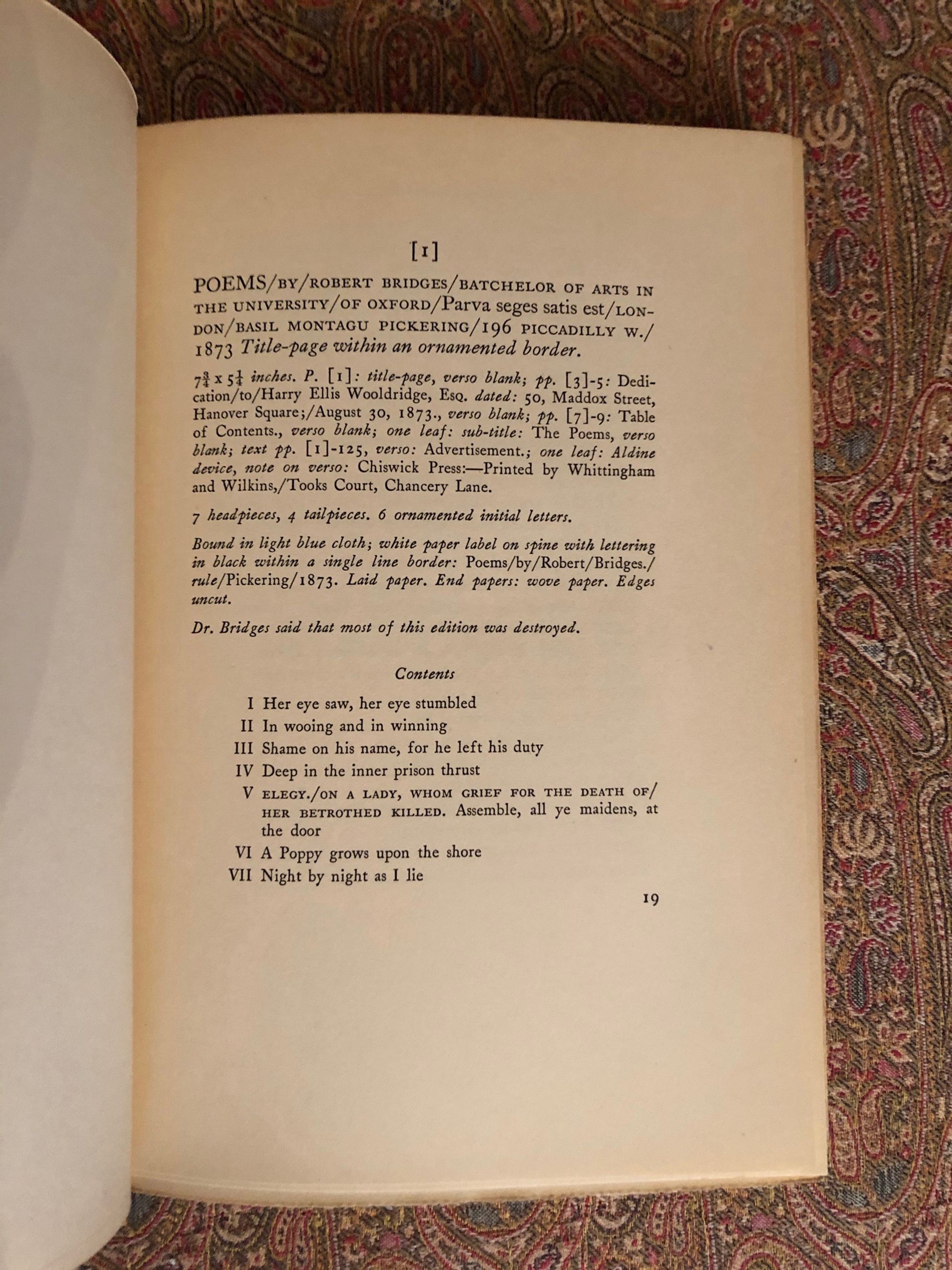Limited Edition, numbered 400 of 500 copies. Hardcover, 8vo, three quarter green cloth with marbled boards, 215 pp. Top edge gilt, others untrimmed. Includes note of the seventy-nine works published by the British poet laureate over his long, fifty year career, as well as other publications containing his works. Robert Bridges (1844-1930) initially trained as a physician, was appointed Poet Laureate in 1913, and founded the Society for Pure English. Condition: Very Good, with a bit of light scuffing to boards, spine surface somewhat oxidized, and very minor wear to several corners. Interior is age-toned. Owner's initials stamped on front pastedown. Overall, a sound and very attractive book.