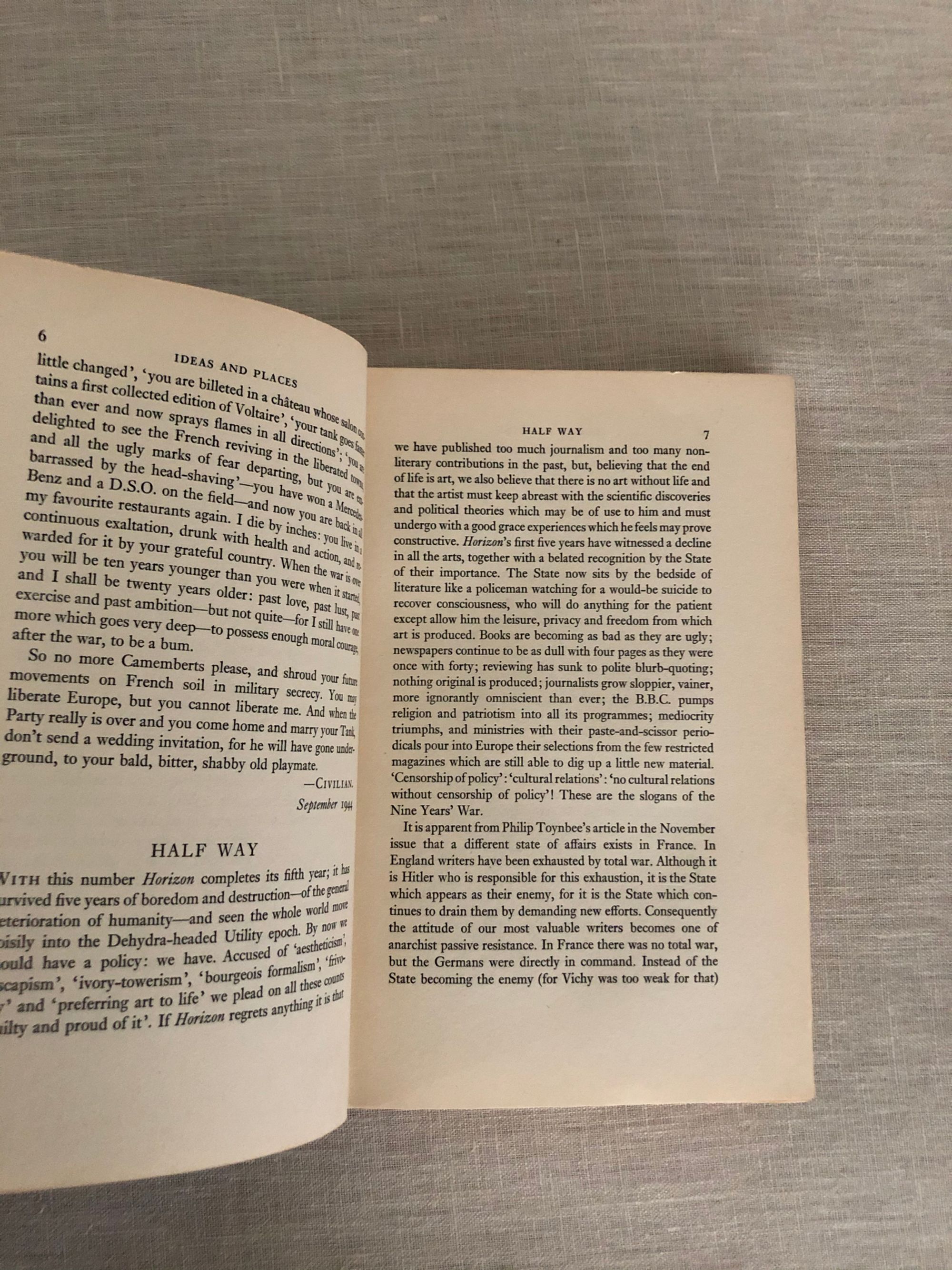 Hard Cover. 8vo. 280pp. Condition: Very Good with some sunning to covers, in a Fair dust jacket which has chips missing, including a large section of the spine (now protected in mylar). Ghost of a paper-clip to title page, causing small tears to the half-title. ** Signed collection of essays by the great English character, Cyril Connolly (1903 - 1974). An Etonian classmate of George Orwell, under whose shadow he strove, Connolly found his niche as the editor of the literary magazine Horizon, and as the author of the angst-ridden classic about writing classics, The Unquiet Grave (1944). This book contains writings by Connolly, as well as the response to a question as to the "Cost of Letters [i.e. writing]" by a host of writers including Robert Graves, John Betjeman, C.Day Lewis, Laurie Lee, George Orwell, V.S.Pritchett, Stephen Spender and Dylan Thomas. Also is a poem dedicated to Connolly by W.H.Auden, "The Fall of Rome". Signed on front flyleaf: "To dearest Elizabeth, with love from Cyril. 'Blessed are the botanists for they shall inherit a rich fibrous loam'. Provenance: By descent, from the library of Christopher Grey Tennant, 2nd Baron Glenconner (1899-1983) and his second wife Lady Elizabeth (née Powell), who were friends with various writers including Cyril Connolly, Stephen Spender and Anthony Powell. They were parents to the author Emma Tennant and Lord Glenconner's siblings included Edward Wyndham Tennant and Stephen Tennant.