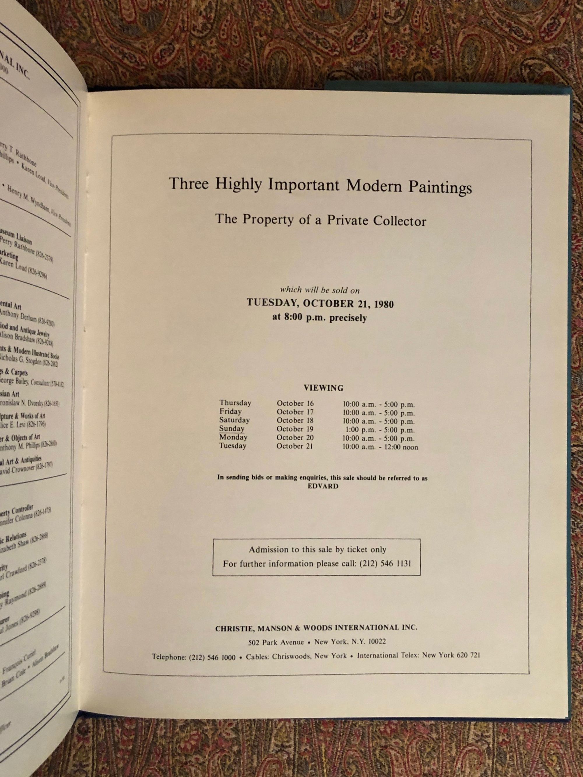 variousHighly Important Modern Paintings The Property of a Private CollectorPublished by Christie's, New York, 1980.First Edition