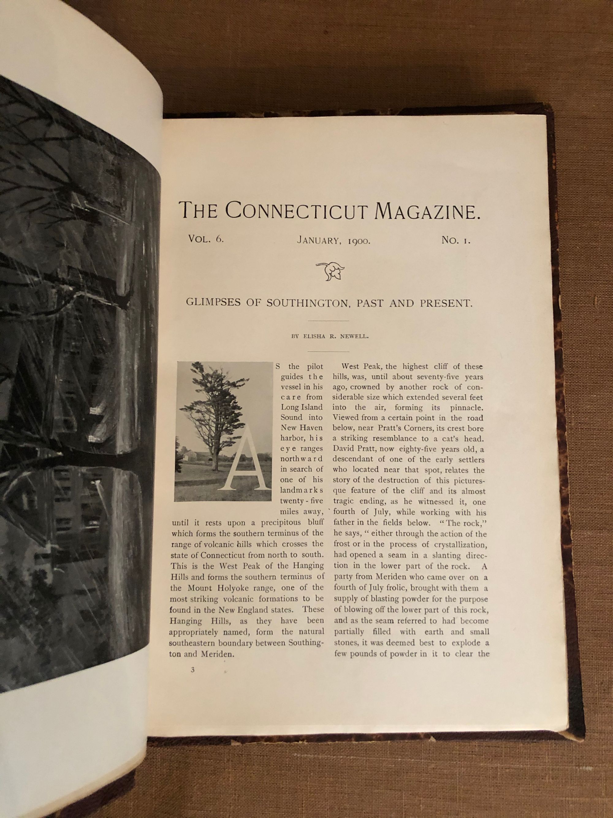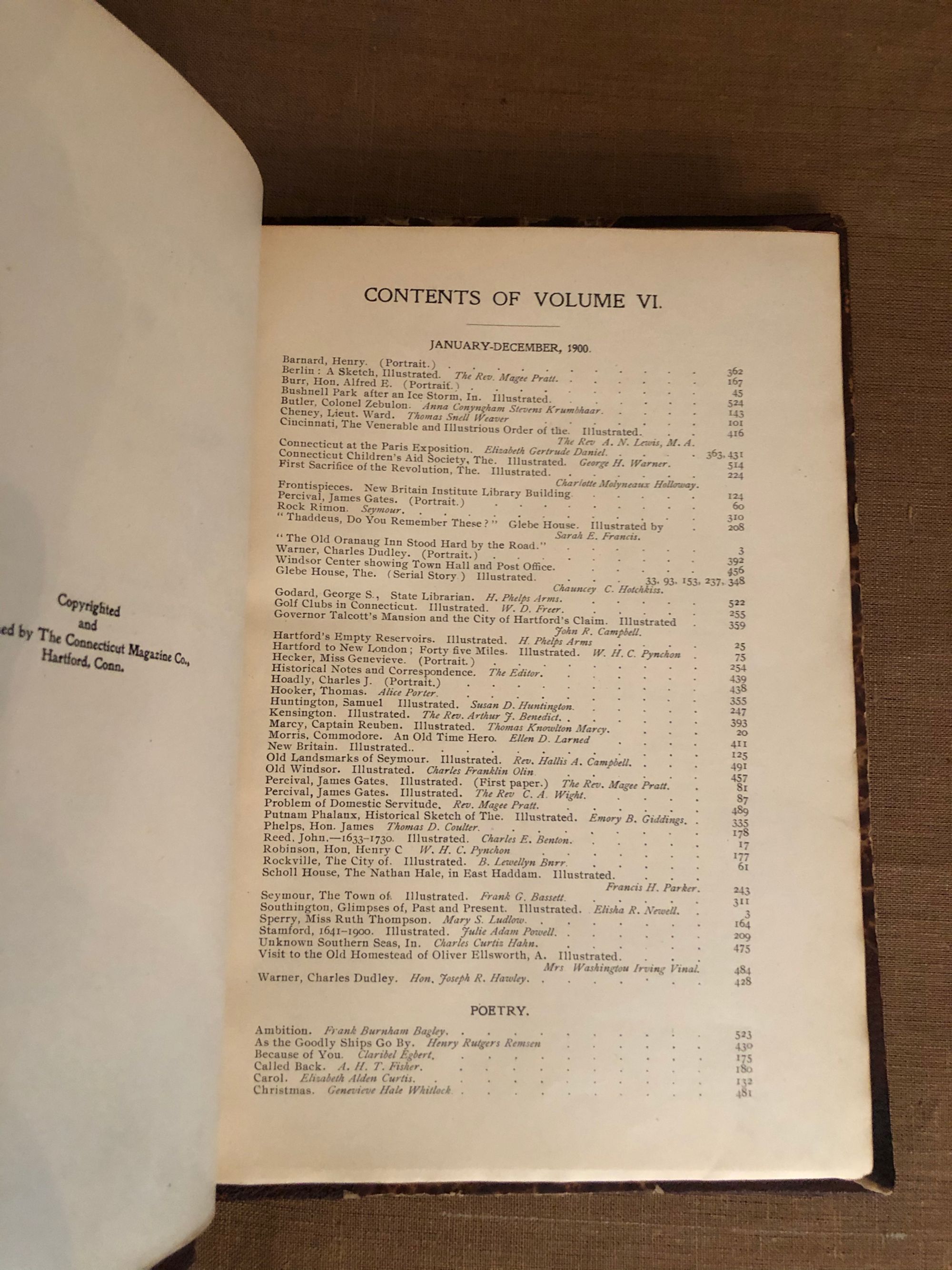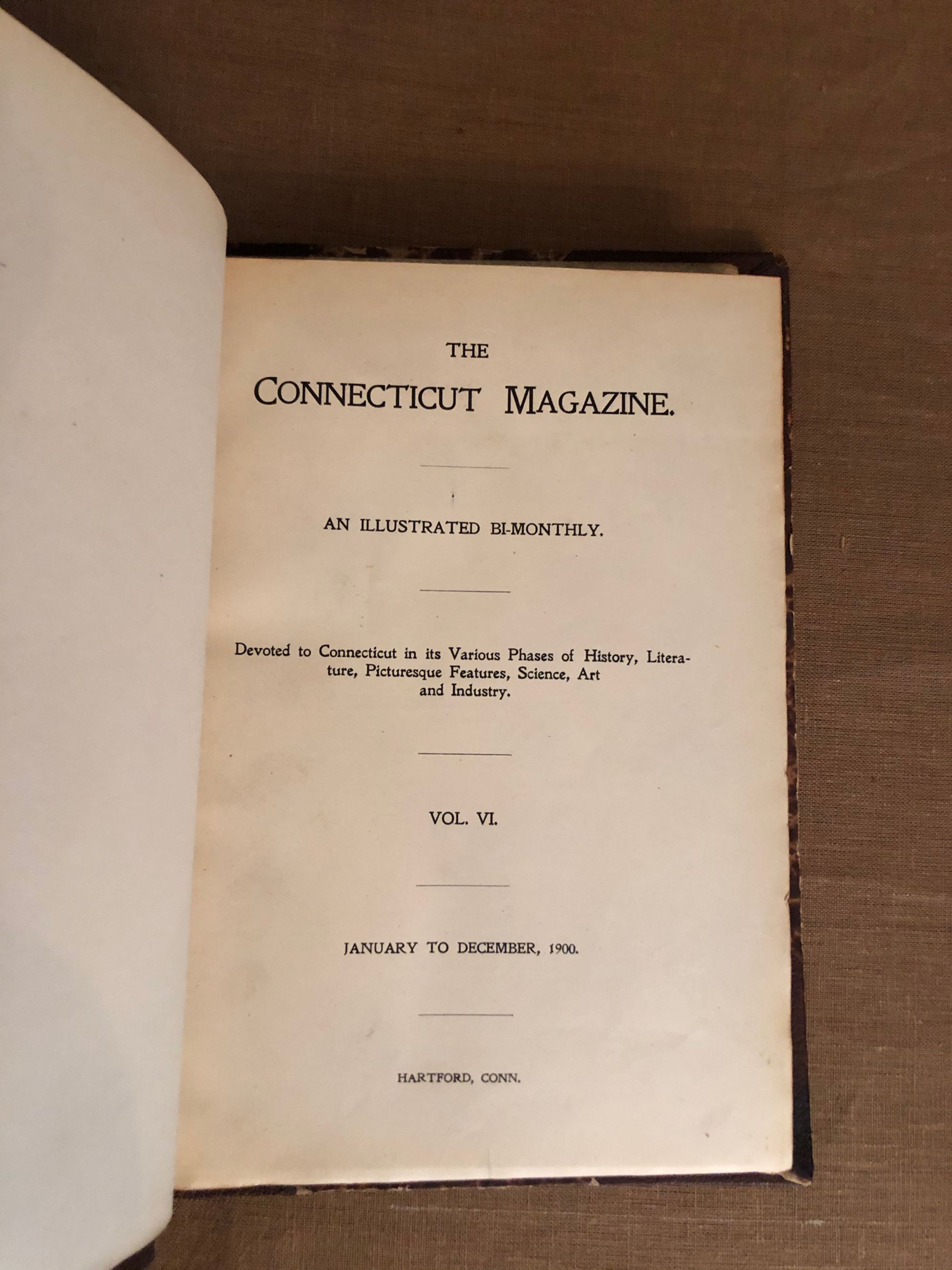 548pp. Scarce year 1900 of The Connecticut Magazine, featuring articles/illustrations titled Henry Branard, Berlin, Alfred E. Burr, Bushnell Park after an Ice Storm, Colonel Zebulon Butler, Lieut Ward Cheney, The Venerable and Illustrious Order of the Cincinnati, Connecticut at the Paris Exposition, The Connecticut Children's Aid Society, The First Sacrifice of the Revolution, New Britain Institute Library Building (frontispiece), James Gates Percival (portrait), Rock Rimon, Charles Dudley Warner (portrait), Windsor Town Hall and Post Office, The Glebe House, George S. Godard, Golf Clubs in Connecticut by W.D.Freer (illustrated), Governor Talcott's Mansion and the City of Hartford's Claim, Hartford's Empty Reservoirs, Hartford to New London, Miss Genevieve Hecker, Charles J. Hoadly, Thomas Hooker, Samuel Huntington, Kensington, Captain Reuben Marcy, Commodore Morris, New Britain, Old Landsmarks [sic] of Seymour, James Gates Percival, Problem of Domestic Servitude, Historical Sketch of The Putnam Phalanx, Hon. James Phelps, John Reed 1633-1730, Hon.Henry C Robinson, The City of Rockville, The Scholl House, The Town of Seymour, Glimpses of Southington, Miss Ruth Thompson Sperry, Stamford 1641-1900, In Unknown Southern Seas by Charles Curtiz Hahn, A Visit to the Old Homestead of Oliver Ellsworth, Charles Dudley Warner. Also poetry by Frank Burnham Bagley, Henry Rutgers Remsen, Claribel Egbert, A.H.T.Fisher, Genevieve Hale Whitlock, Florence Folsom, Charles J.Girelius, H. Phelps Arma, Burton Langtry Collins, Herbert Randall, Jane Marlin, Sally Porter Law, W.Harry Clemons, ELizabeth Alden Curtis, Margherita Arlina Hamm, John Howard and Horace D.Byrnes. Condition: Covers detached. Spine chipped. Interior about Very Good.