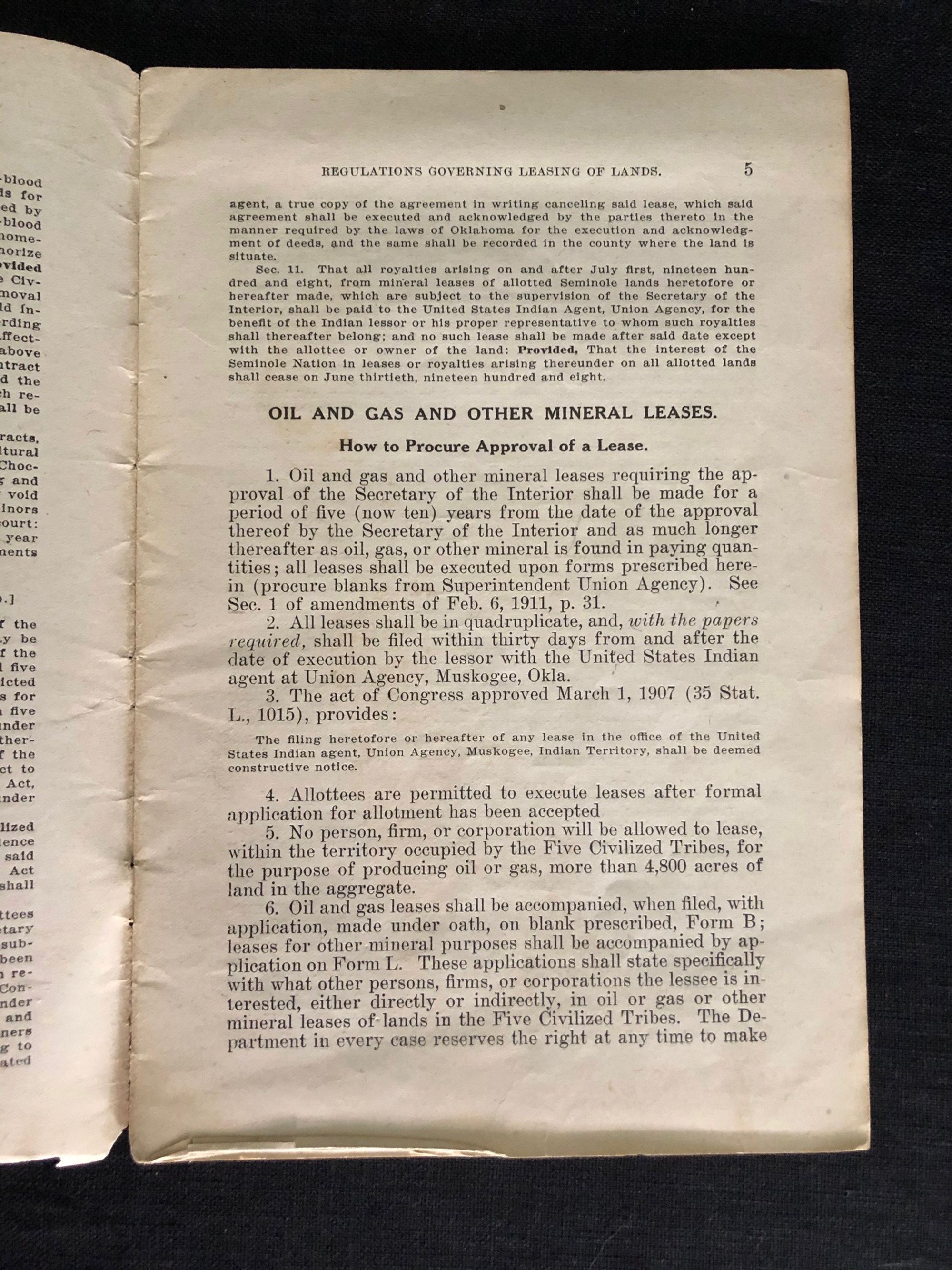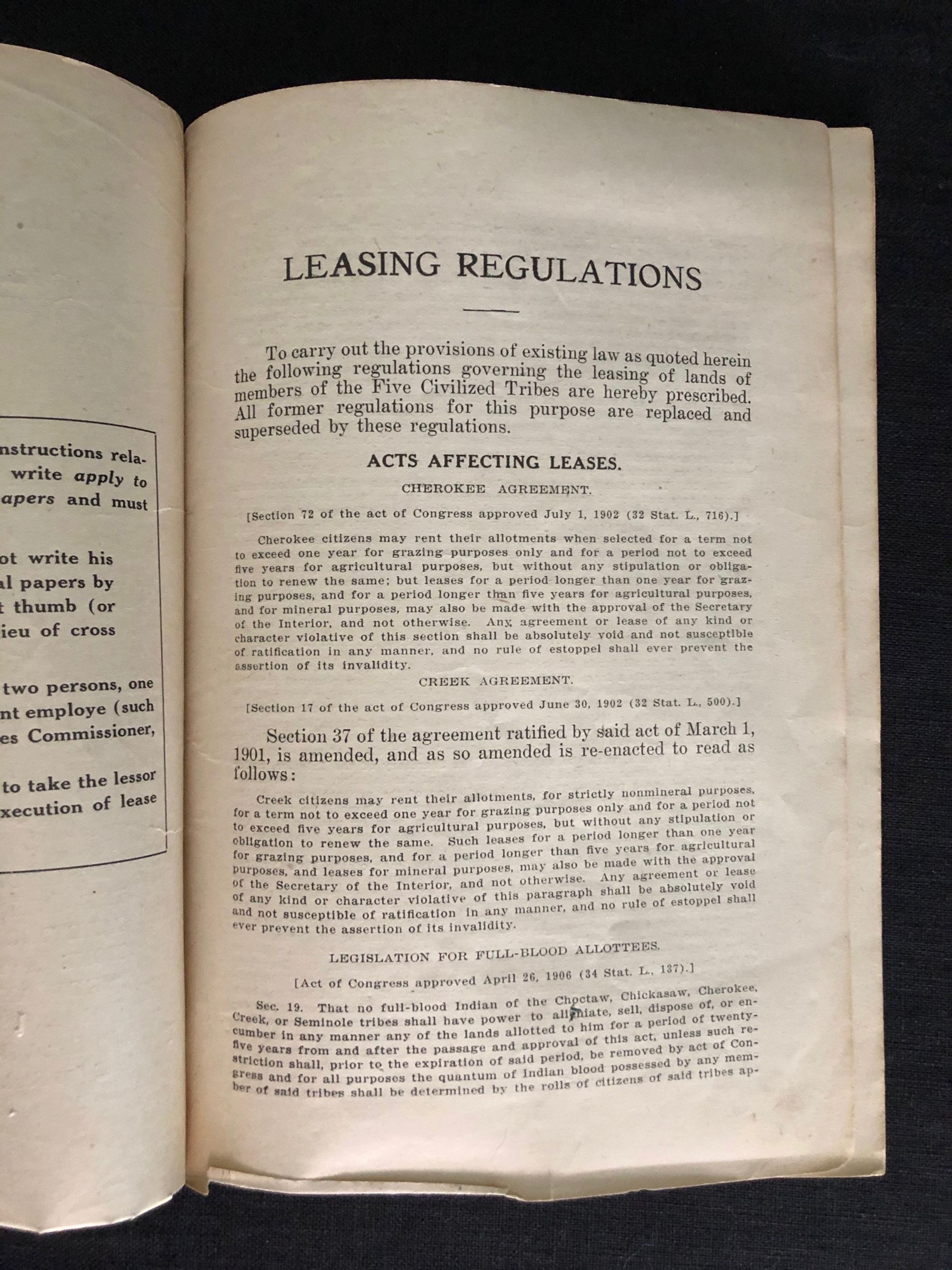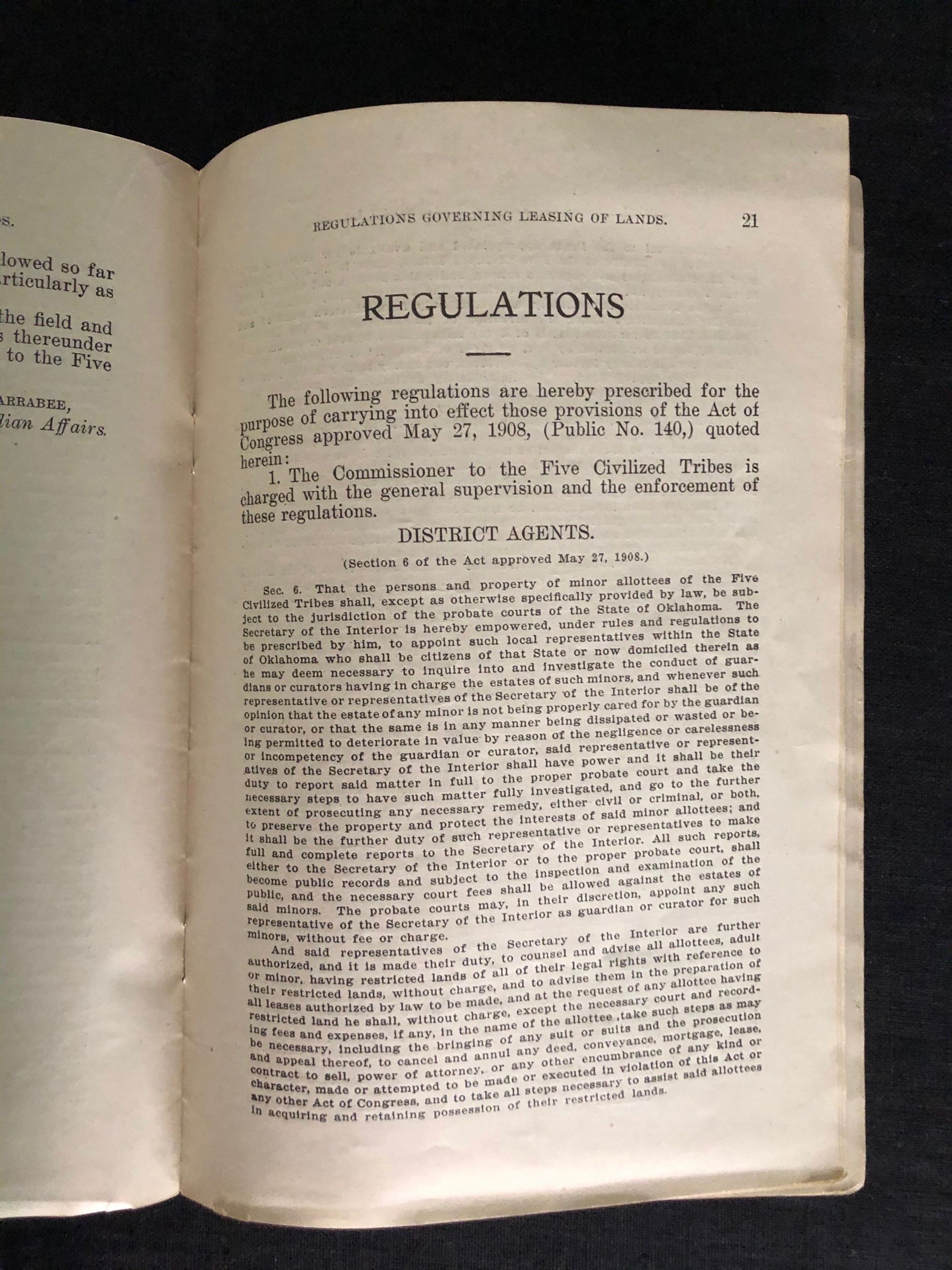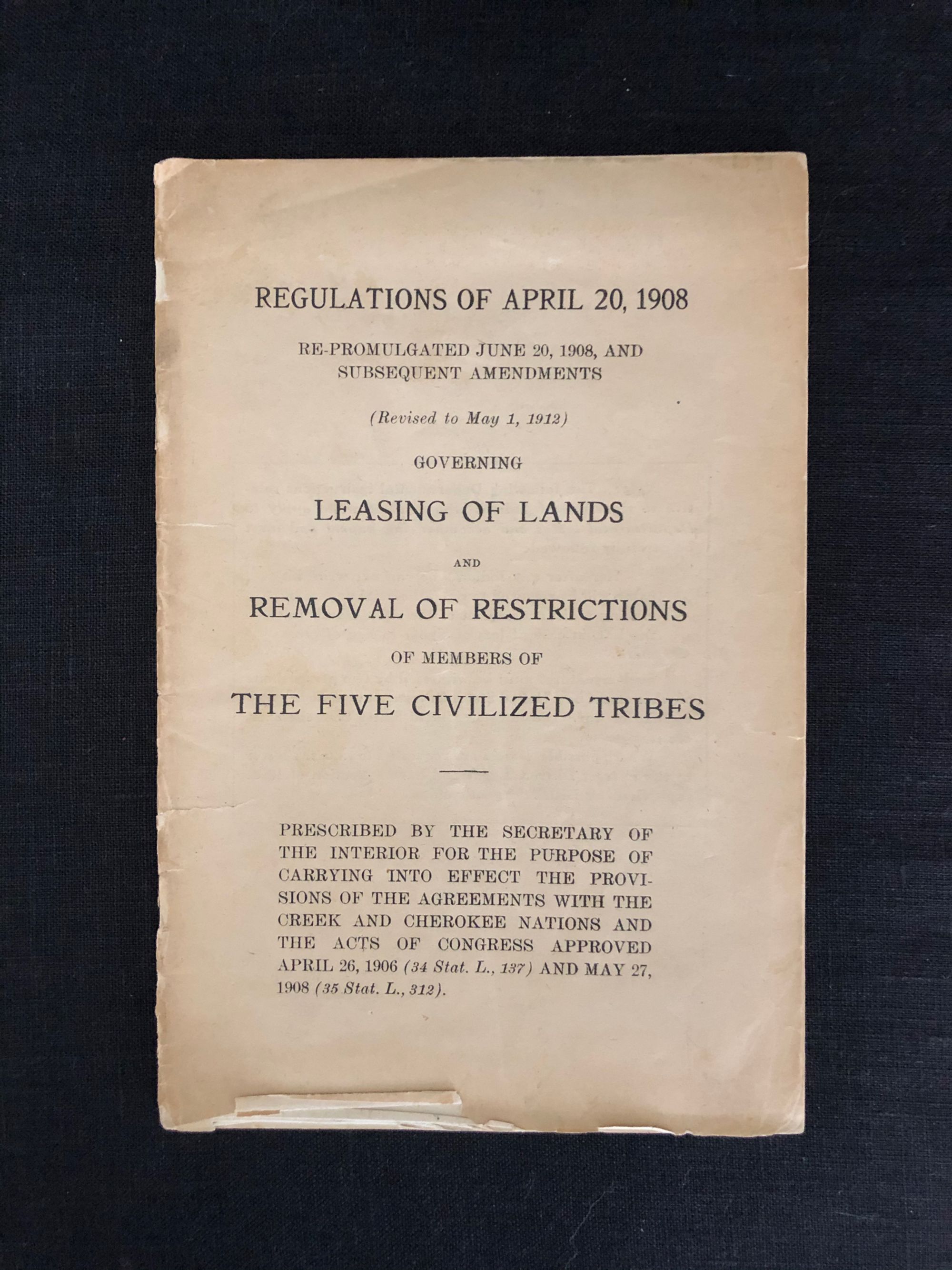 36pp. Stapled booklet describing the various laws applicable to land lease and rights therein, including instructions on how to take thumbprints from those who cannot write. Places restrictions on the ability of corporations to lease land from Native Americans. Condition: Covers worn with some chipping to spine and to bottom of front cover and first few pages. Scarce.