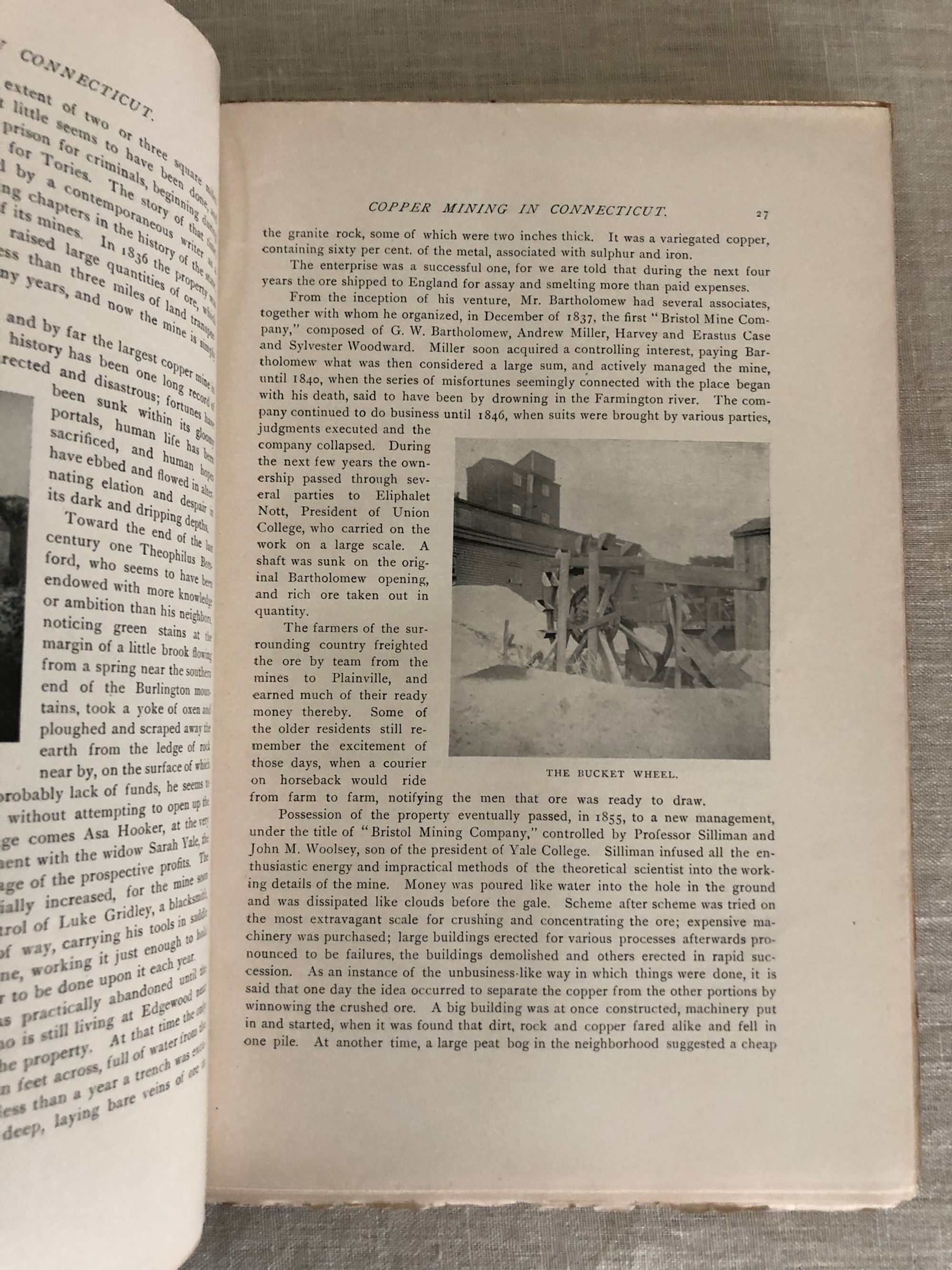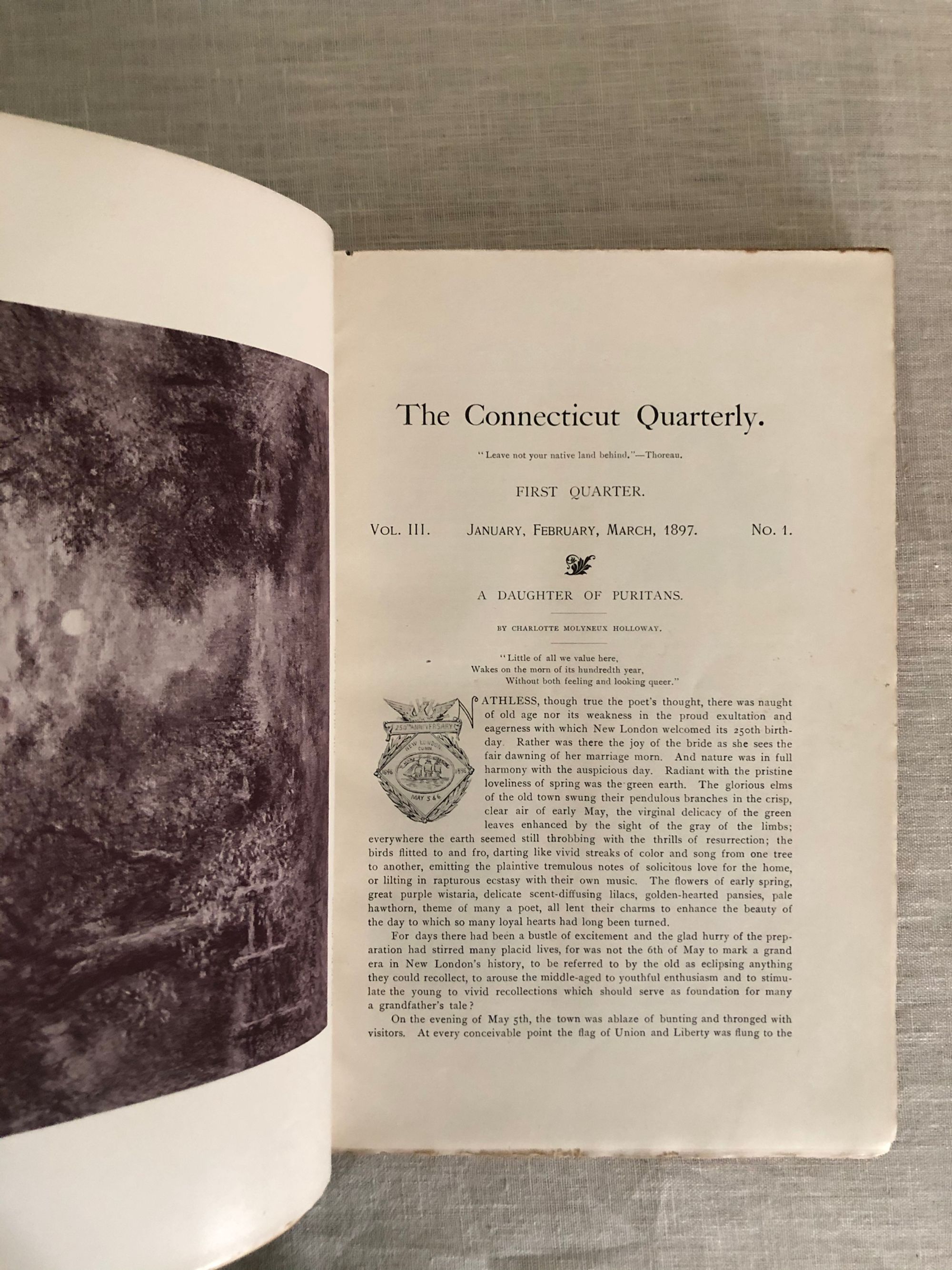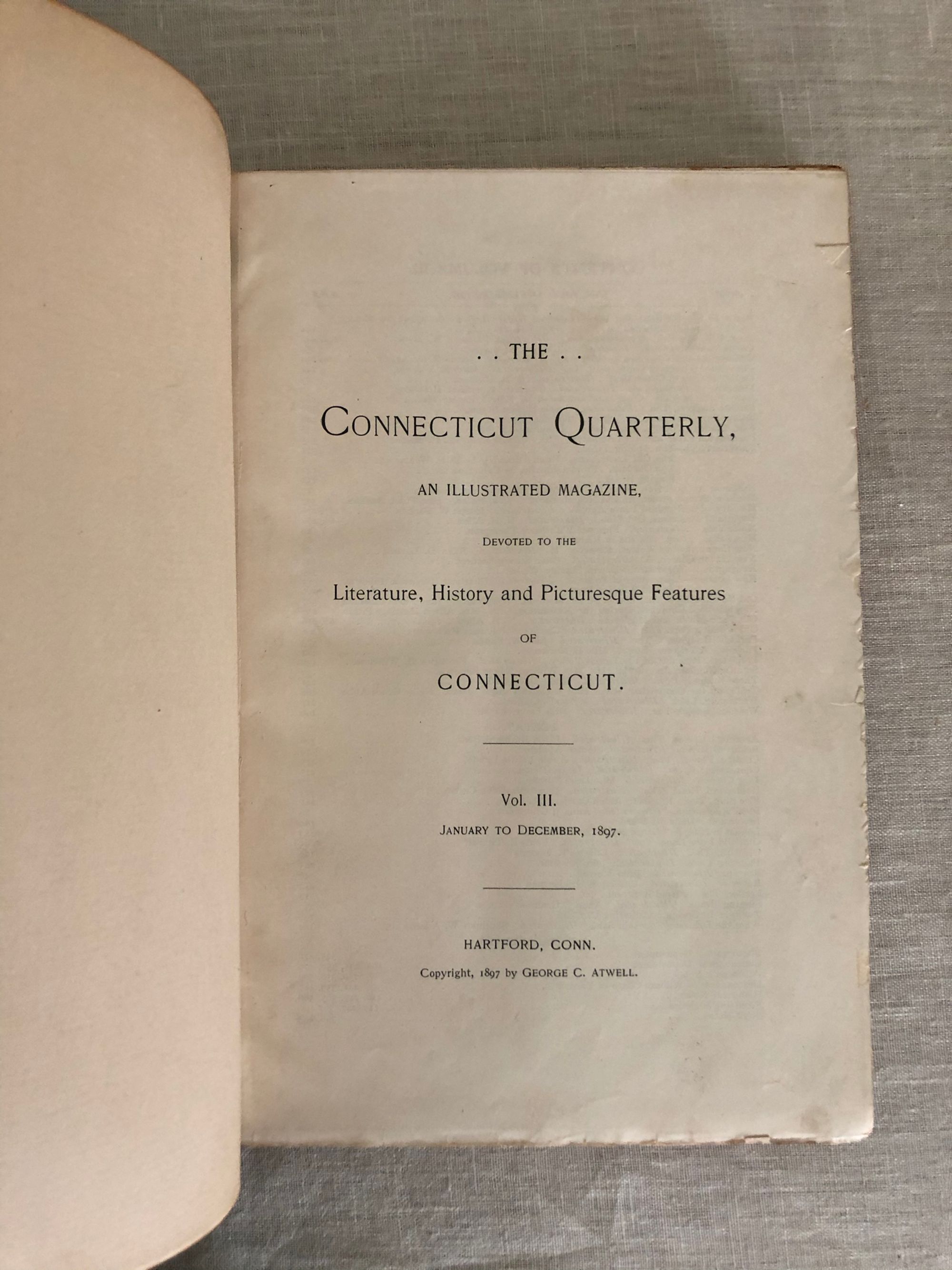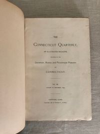 pp 502 [10] Scarce issue of The Connecticut Magazine, with articles/illustrations titled: Battle of the Hartford and the Tennessee, Norwich Bean Hill, Connecticut's Soldiery, Connecticut and Virginia a Century Ago, The Convention Troops in Connecticut, Copper Mining in Connecticut, A Daughter of Puritans, Early Rules of Yale, The Enfield Shakers, An Escape from Newgate, The Fair Trader's Voyage, The Farmington River and its Tributaries, Hillhouse Avenue New Haven, Boston Street Madison, A Ministry of a Hundred Years Ago, Old Time Music and Musicians, Music Vale, Miss Sally, A New Haven Church, Newington, New London - A Daughter of Puritans, The Old Whaling Port, The Parks of Bridgeport, A Trip to Paradise, Prehistoric Remains of the Tunxis Valley, In Satan's Kingdom, Three Killingly Boys, Traffic on the Connecticut River, Waramaug Lake, The Wolcott Plateau. With poetry by: Ellen Brainerd Peck, Grace Appleton, Annie Laurie Lynde, James Dixon, Milo Leon Norton, Elizabeth Alden Curtis, Anna J Granniss, Delia B Ward, Grace Irene Chaffee, Louis E Thayer, Charles R Loomis, John Rossiter, Julia Merrell, Carolyn E Dickerman, Alfred B Street, and Catherine C Clark. Condition: About Good, with crack to outer joint of binding and some rubbing to spine. Hinges repaired with tape.