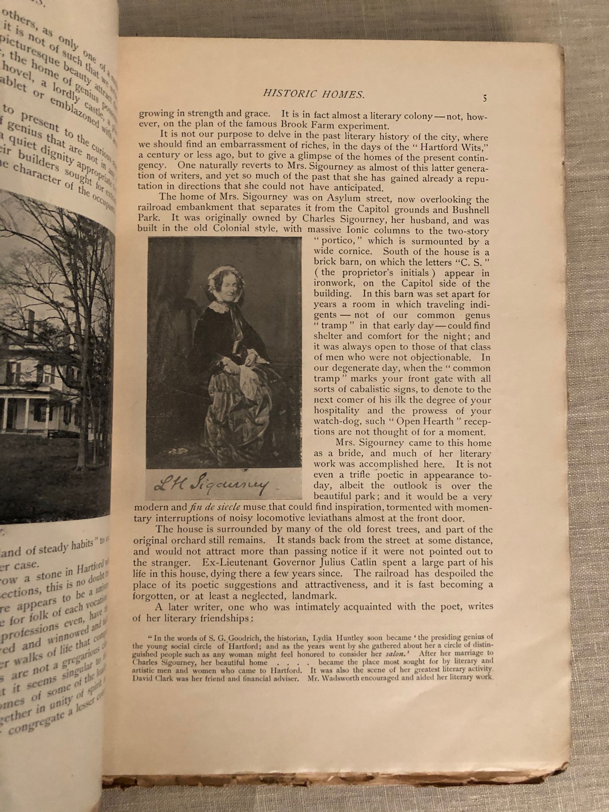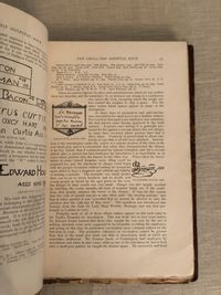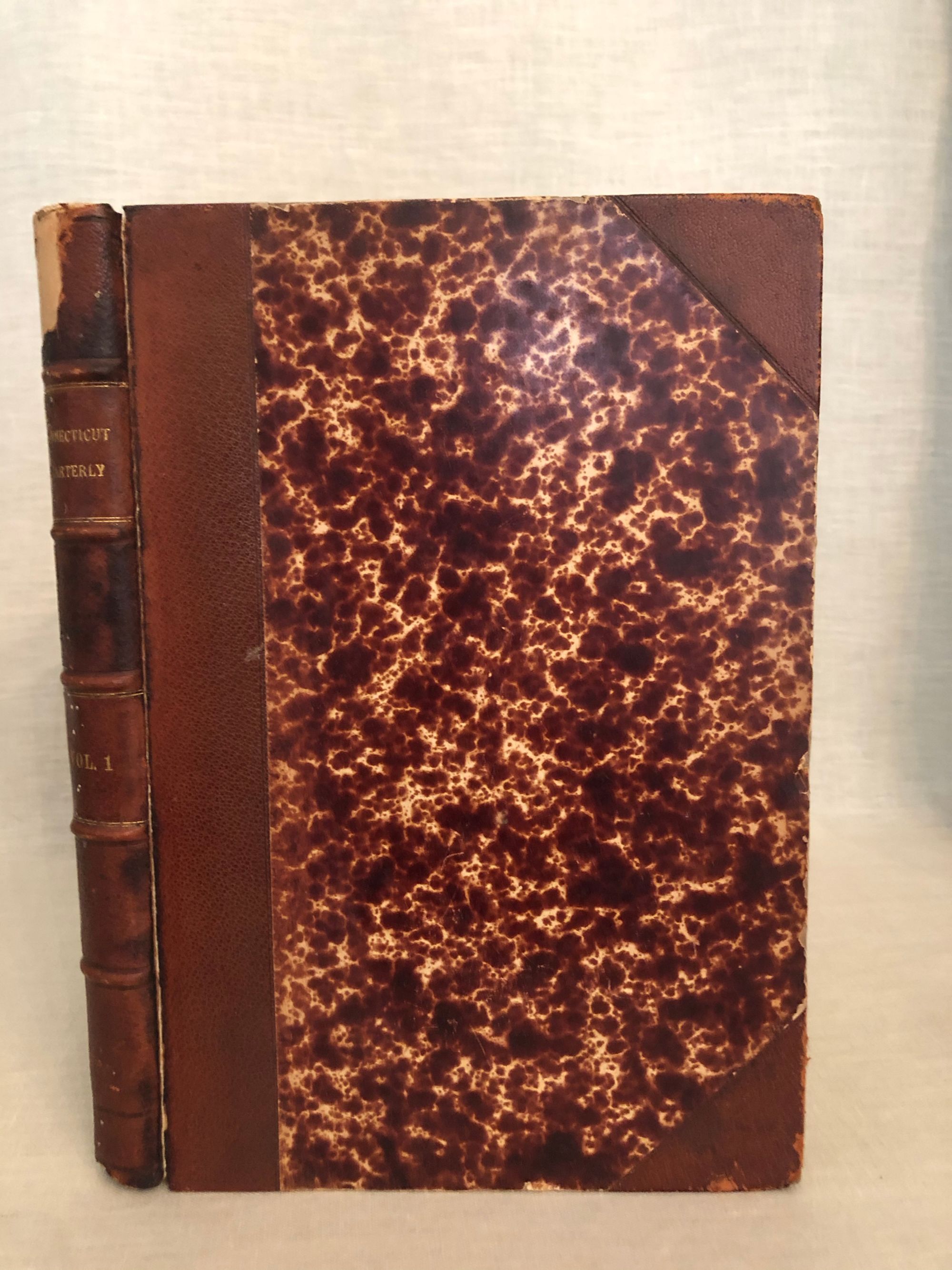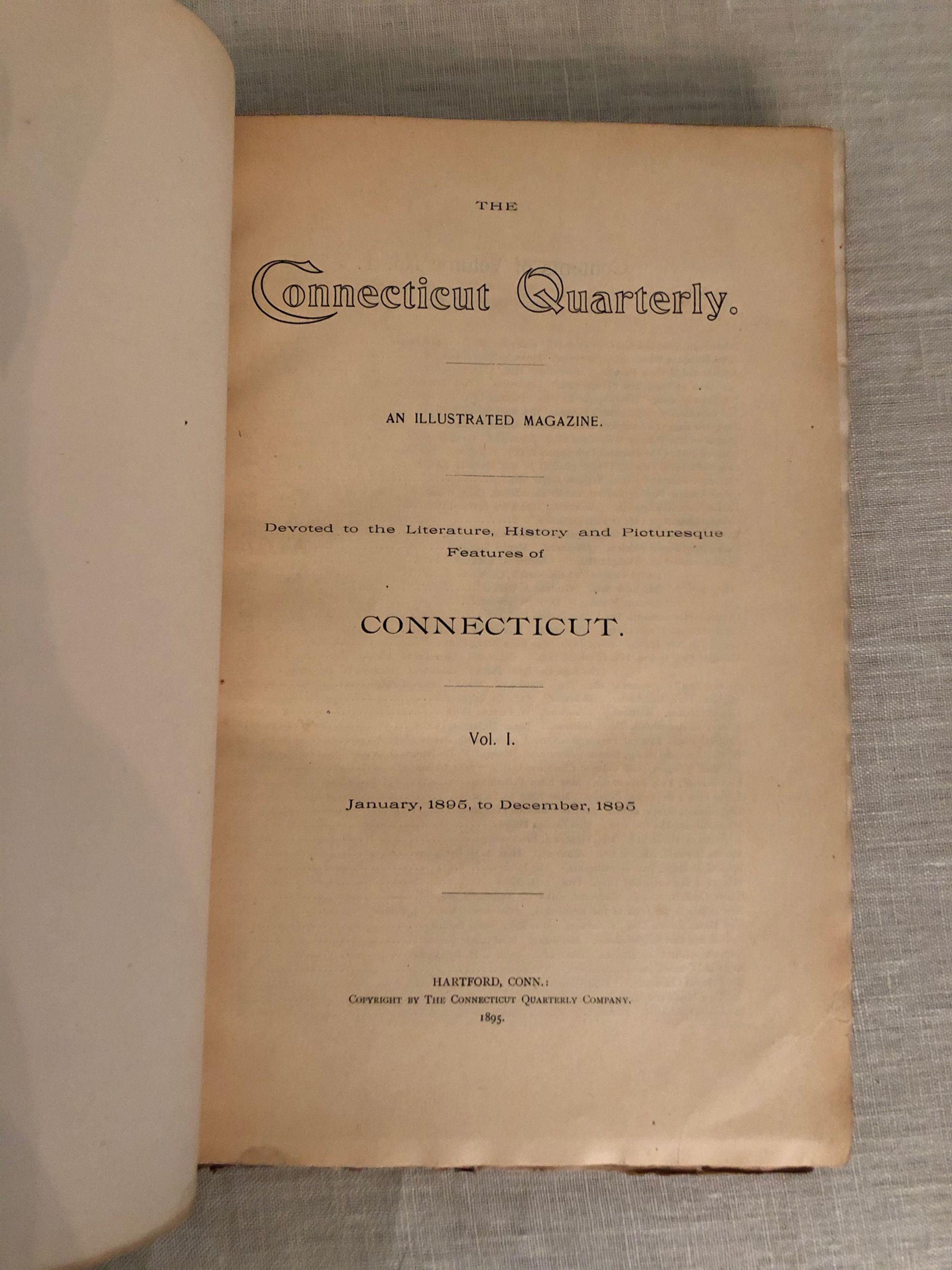 410pp. Scarce first volume of The Connecticut Magazine, with articles/illustrations titled: Aaron Burr, The History of Anaesthesia, Ancient and Modern Norwalk, The "Henry Lee" Argonauts of 1849, Autumn Morning by D.F.Wentworth, Bits from Grand Mother's Journal, Bungalow Bay, Ella Wheeler Wilcox and The Bungalow, Bushnell Park, Campbell's Falls, Canton, Center Church Burying Ground, Clinton, Old Colonial Characters, Farmington, The Girl from Massachusetts, Granby, The New Haven Green, The Hartford Park System, The Hospital Rock, Yale Boys of the Last Century, Letter from a Repentent Royalist, Scope or the Lost Library, Memories of Meriden, Musical Melange, Old Time Music and Musicians, Some Native Orchids, New Britain in the Days of the Revolution, Reginald Roxdale, A Revolutionary Boycott, Simsbury, The Small Pox Hospital Rock, Sociology and Civics, Suffield, The Towers of Talcott Mountain, The Thomas Hooker of Today, The Three Dates, Treasure Trove, Tunxis, A Visit to Mrs Sigourney, The Wide Awakes. With poetry by: Ellen Brainerd Peck, Florence Carver Davis, Fanny Driscoll, Louis E Thayer, W Farrand Felch, Albert Lewis Thayer, C Calverley, Robert Clarkson Tongue, John Rossiter, Joseph Archer, Henry Mason Chadwick, Franklin E Denton, Willard Werner, John Greenlead Whittier, Herbert Randall, Adele Green, Rose Terry Cooke, John Payne, F C H Wendel, Stockton Bates, Joseph Truman, Rufus Dawes, Will Farand Felch, and Richard E Burton. Condition: Large chip missing from top of spine. Hinges reinforced with tape. Interior Very Good.