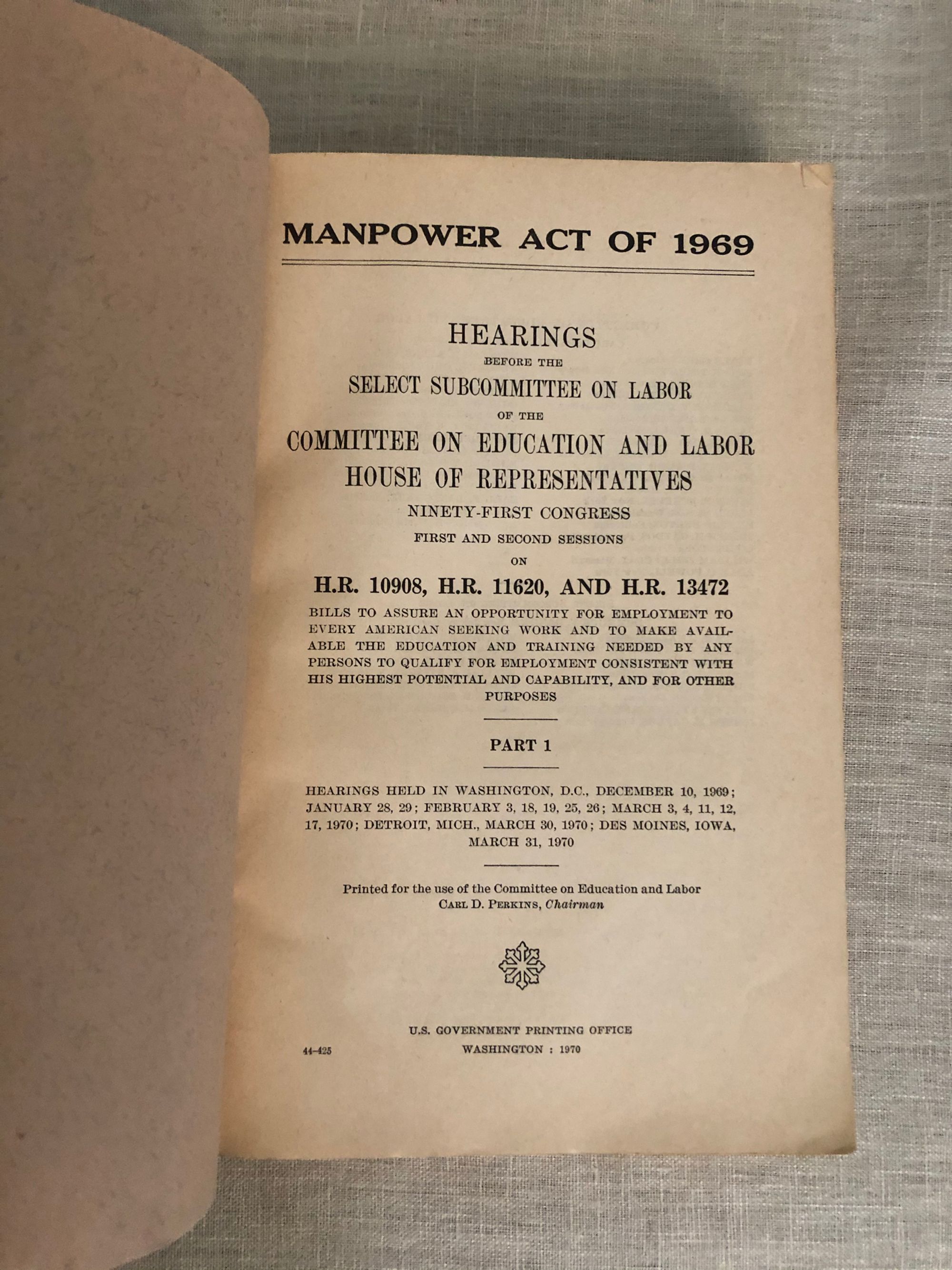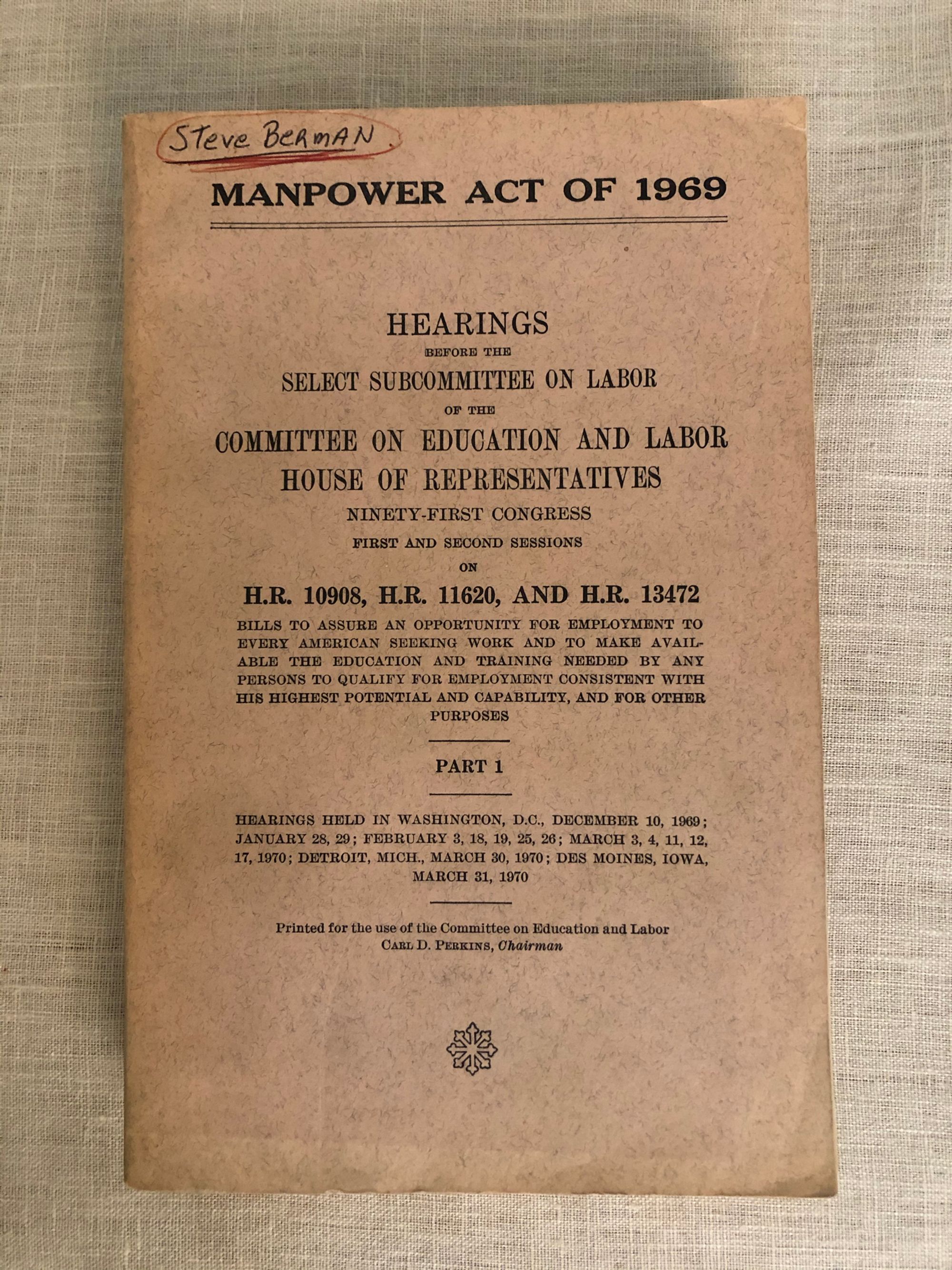 697pp. Stimulus package from the Nixon era aimed at providing centralized state oversight of the economy in the United States, including training programs, wage controls etc. Condition: ALmost Very Good, but with ghosts of paper clip to the last few pages, owner's name on the front cover, and creasing, dust-soiling to the covers.
