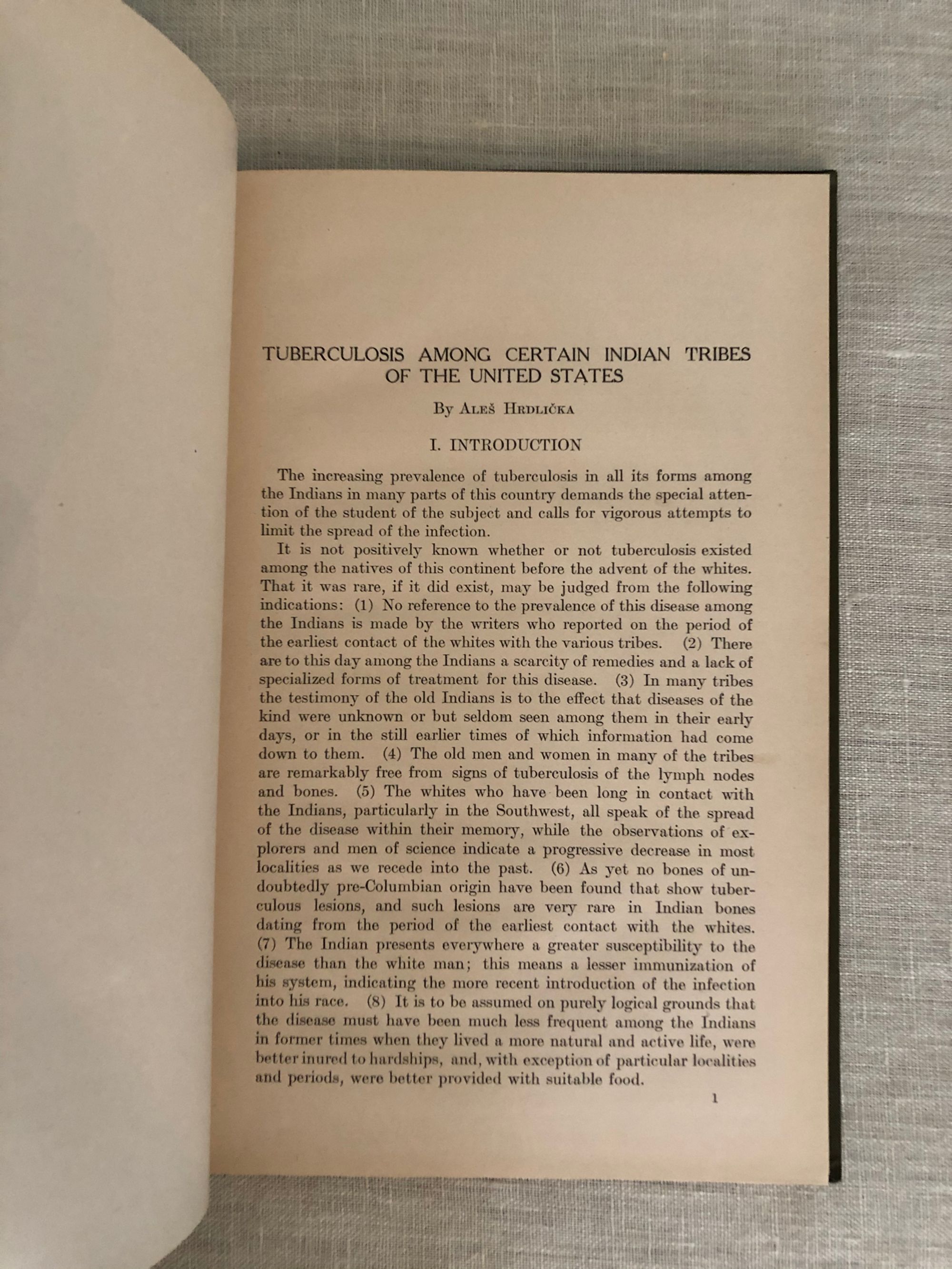 48pp + 22pp of plates. Alois Ferdinand Hrdlička (1869 - 1943) was a Czech anthropologist who had suffered from tuberculosis as a child and, seeing the difficulties in its treatment, determined to study medicine. After graduating, he left for Paris to work in the newly emerging field of anthropology. Condition: About Very Good, with the host of a bookplate having been removed from the front pastedown.