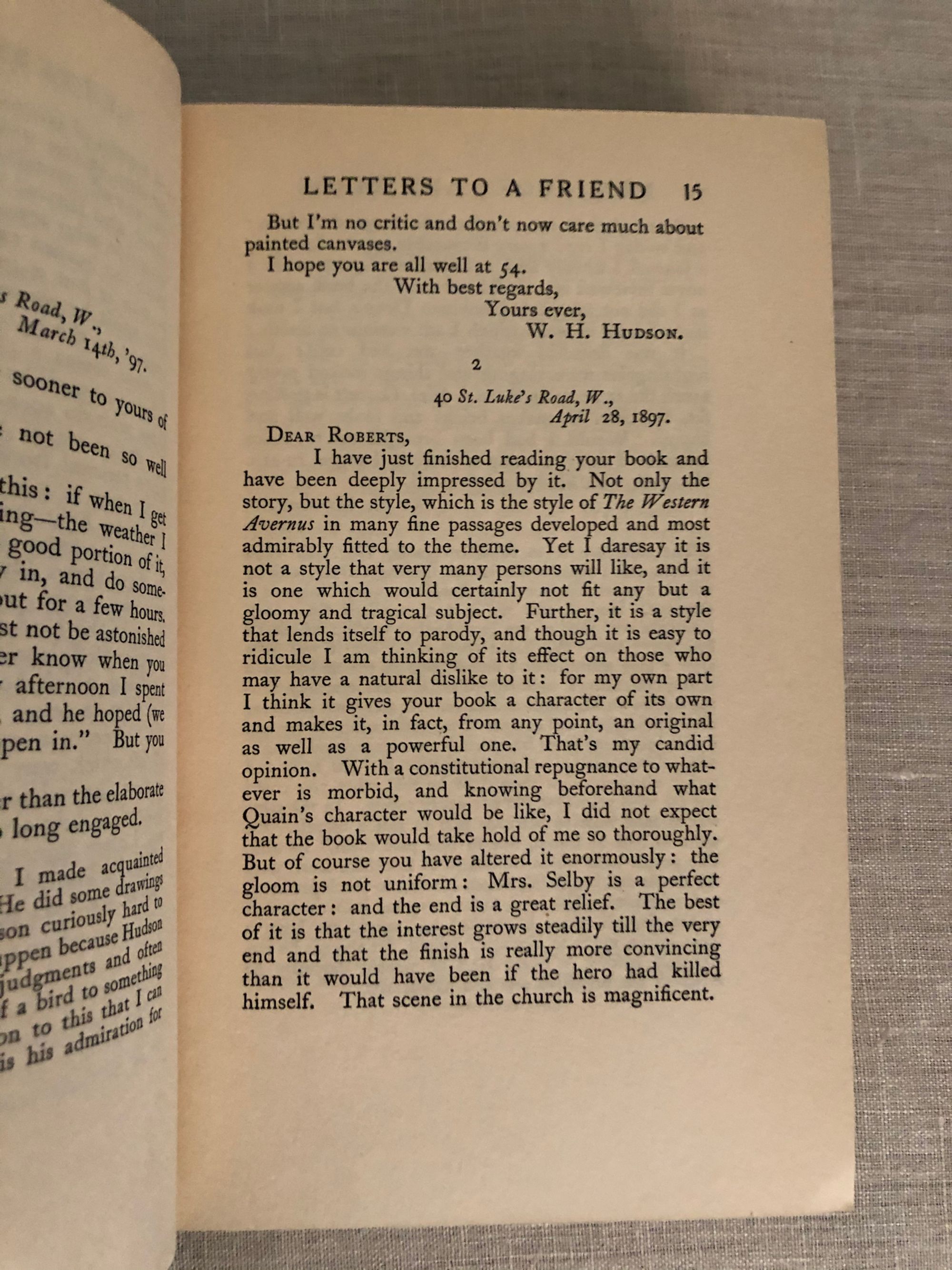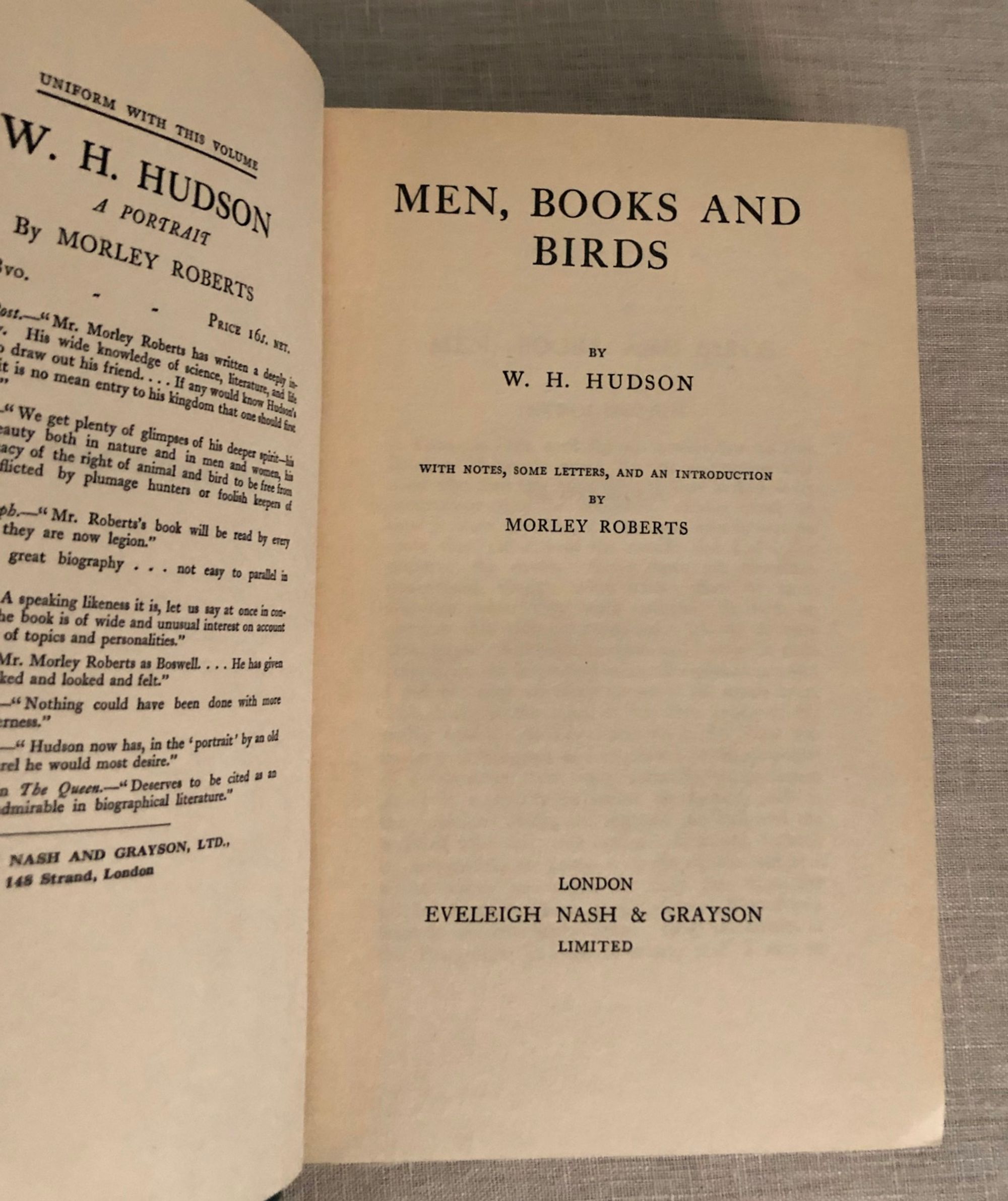 Hard cover, 8vo., 368pp. In publisher's green cloth binding with gold lettering to spine. Condition: About Very Good, but with some rubbing to the covers. ** Collection of letters written by the author and ornithologist, William Henry Hudson (1841 - 1922). Hudson was an Argentinian who emigrated to England and became an avid naturalist and ornithologist. Having left Argentina, he continued to write about the South American wilderness, including the novel "Green Mansions: A Romance of the Tropical Forest" (1904) which was made into a 1959 movie starring Audrey Hepburn and Anthony Perkins. OCLC 2505562.
