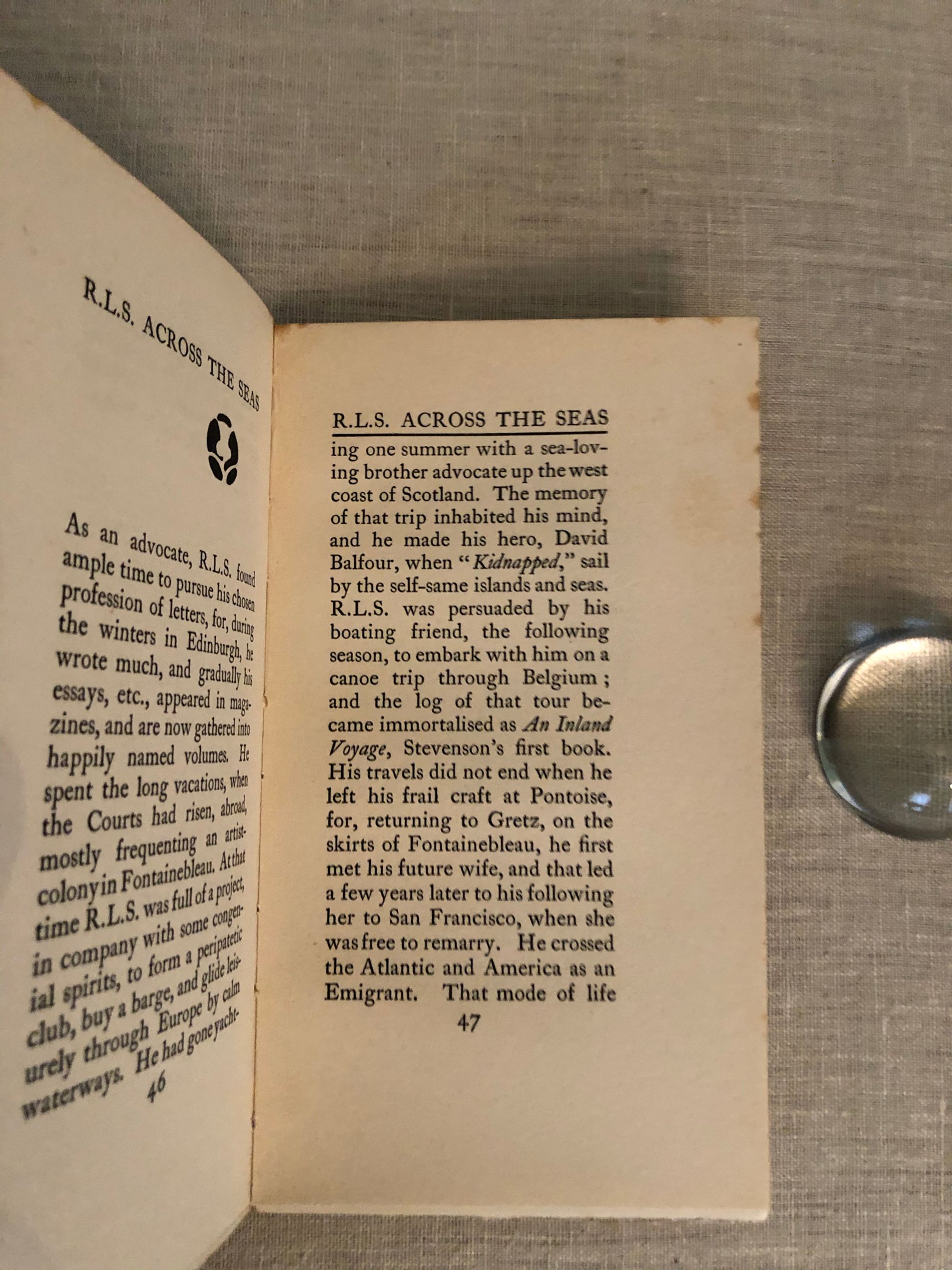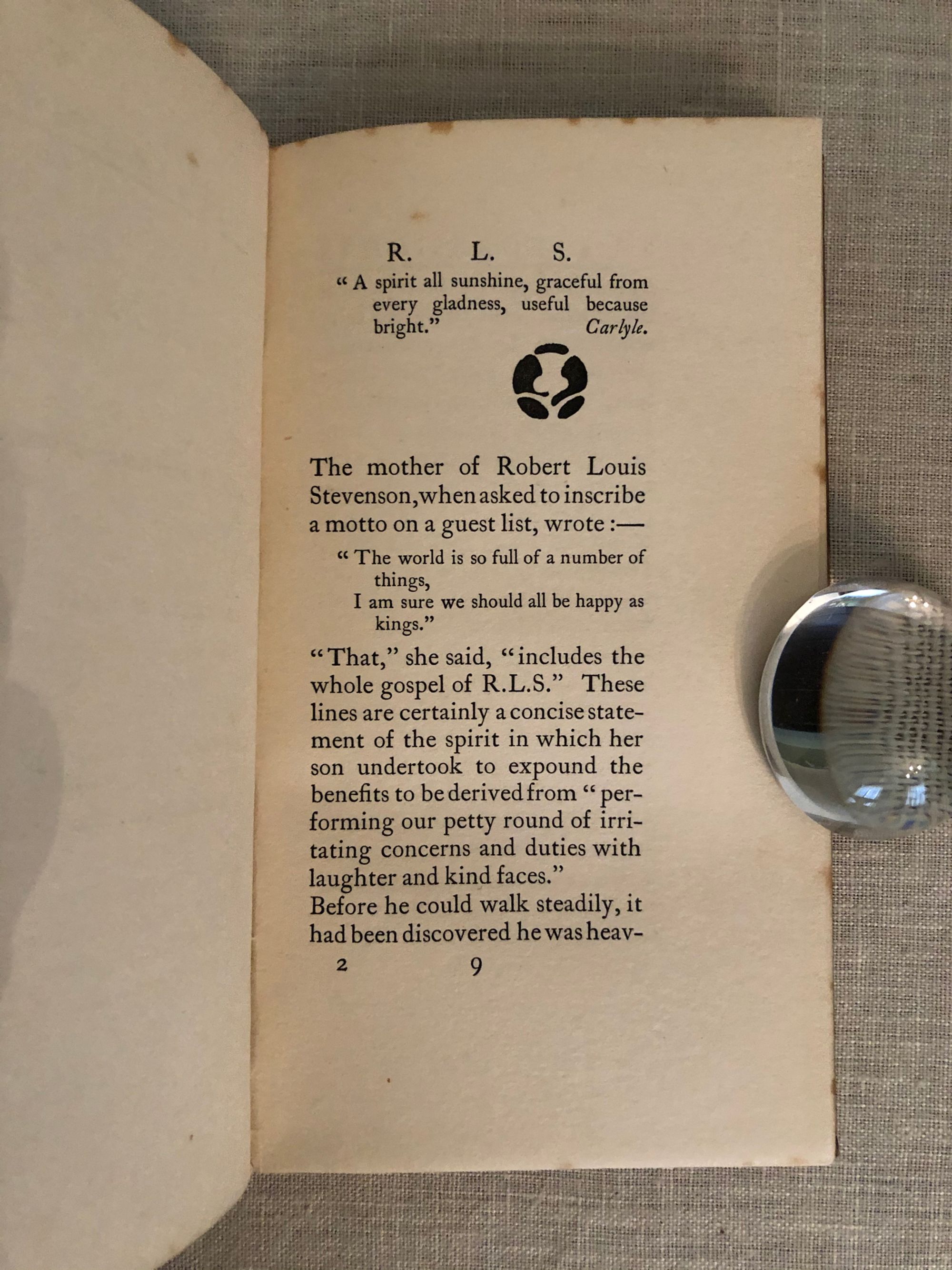 Hard Cover, 12mo, 69pp + ads. Condition: Very Good. Covers dust-soiled with some wear to corners and a mark to the front cover. Foxing to the fore-edges of the text block visible when the book is closed. ** Illustrated biography of Robert Louis Stevenson by Eve Blantyre Simpson (1855 - 1920), and Edinburgh-born author. Her father, James Y Simpson, was an obstetrician who pioneered the use of chloroform as an anaesthetic. ** Contains a description on Stevenson's appearance - his father "begged [him]... to go to his tailor's, for he disapproved of the youth's scruffy, mountbankish appearance". An interesting book for the description of Stevenson's reactions to the world in his travels at at home in Scotland.