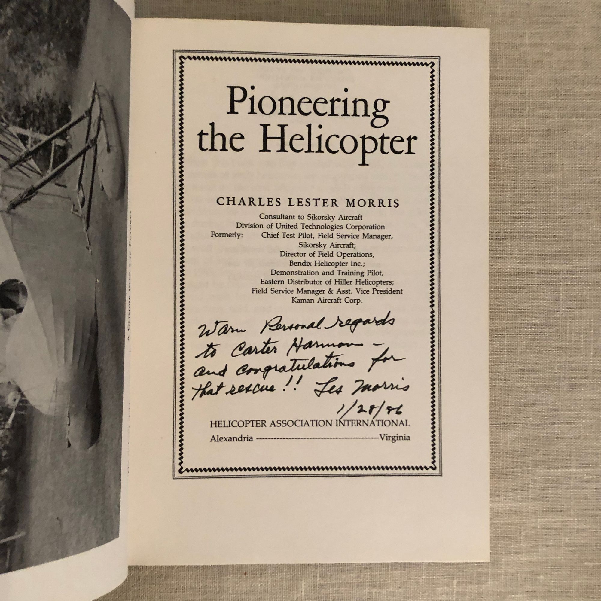 Hard Cover, 8vo., 161pp. Condition: Very Good. Light spotting to covers. Light light foxing to the fore-edge of the text block and to the endpapers. ** History of the development of the helicopter, by Charles Lester Morris, a test pilot for Sikorsky. The author has inscribed the book on the title page: "Warm personal regards to Carter Harman - and congratulations for that rescue! Les Morris 1/28/86". Carter Harman (1918 - 2007) piloted the first mission by a US military helicopter in a combat zone in 1945, for which he was awarded the Distinguished Flying Cross. After the war Harman became a music critic and was the sound recorder for the 1963 film adaptation of "Lord of the Flies". OCLC 17237743.