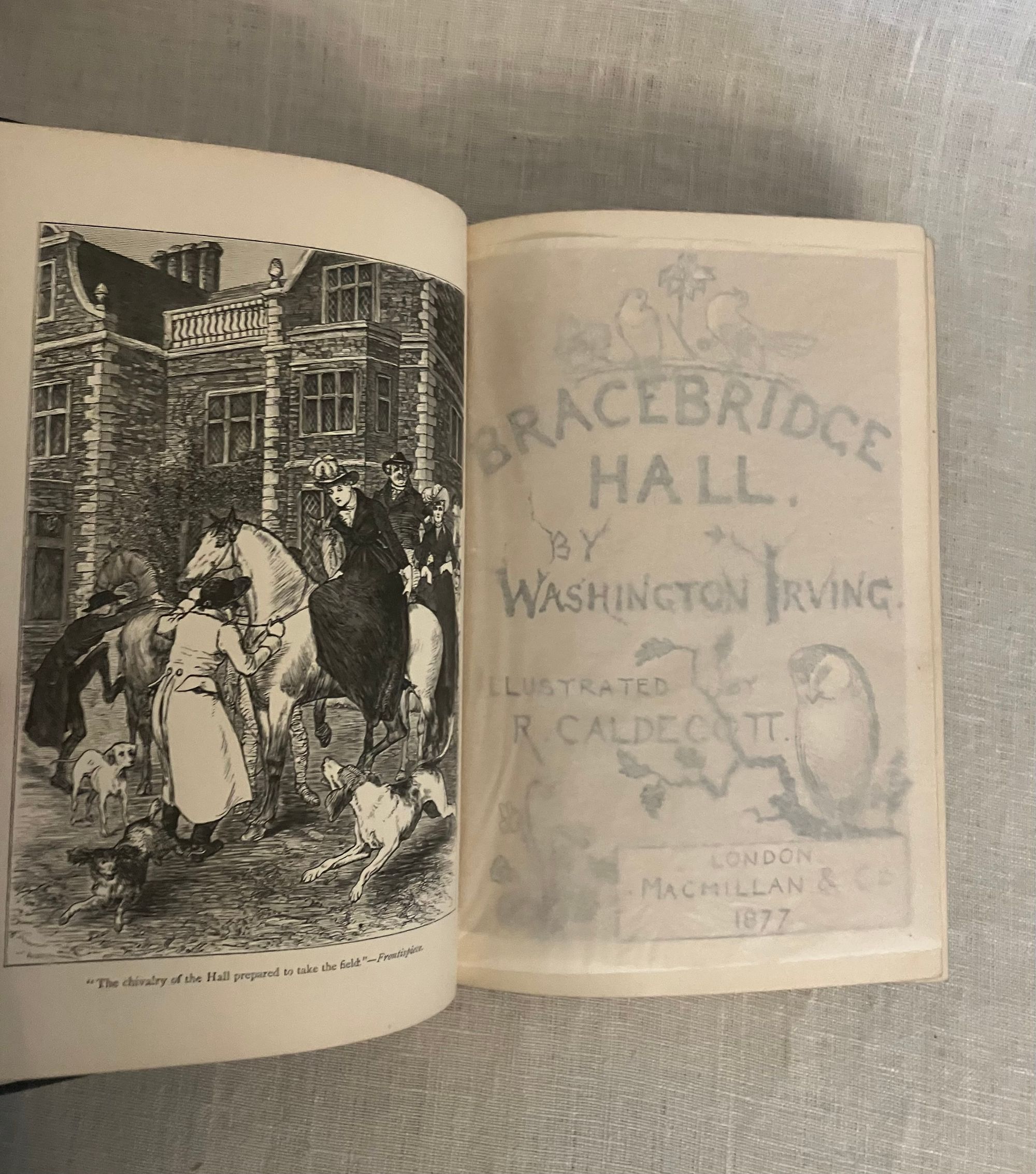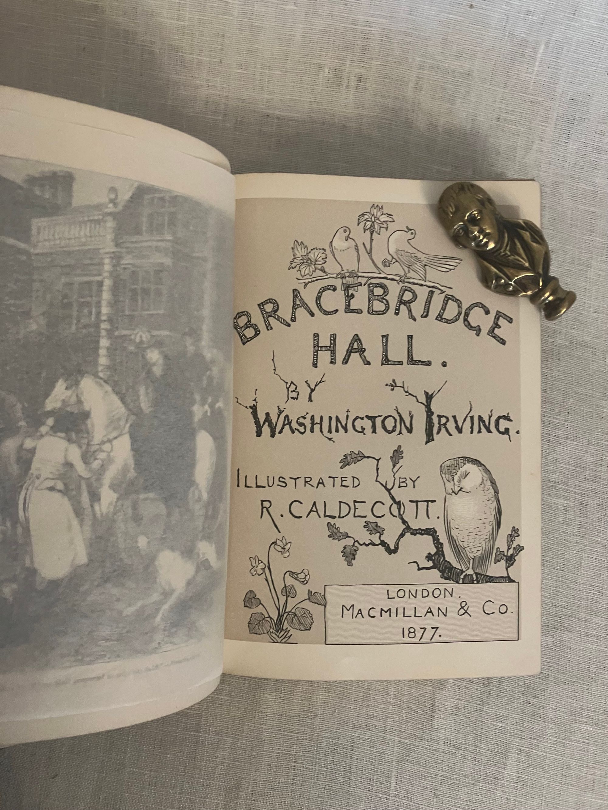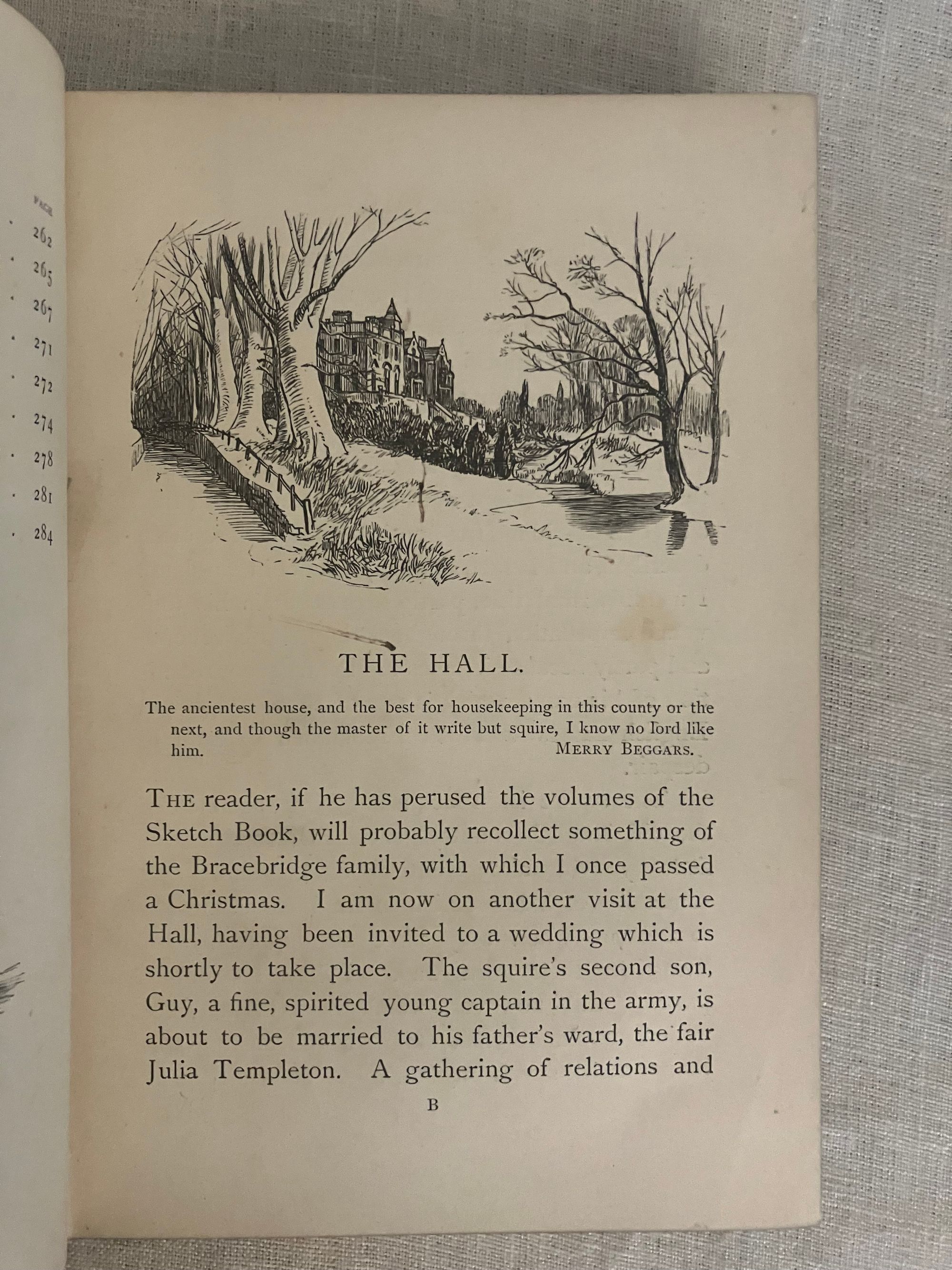 First Edition Thus. Hard cover, Crown 8vo., in dark green publisher's cloth with gilt decoration and titles to front board and spine, 284 pp. plus 4 pp. reviews and publisher's ads. No dust jacket. Frontispiece with tissue guard. Printed by R & R. Clark, Edinburgh. CONDITION: Very Good. Hinges are partly cracked. Corners are gently rubbed, and there is a small closed tear in cloth at head of spine. Interior is clean, lightly age-toned with no obvious foxing. A pictorial bookplate of a former owner is upon the front endpaper. Small bookbinder's label on rear endpaper: "Bound by Burn and Co., London." **American AUTHOR (1783-1859) Washington Irving's "Bracebridge Hall" was a series of comic sketches written while the author was visiting Birmingham, England and originally published as "The Sketchbook of Geoffrey Crayon" in 1822.* ILLUSTRATOR Randolf Caldecott (1846-1886) is acknowledged in the Preface as the "same able pencil" to have illustrated MacMillan's re-publication of Irving's "Old Christmas" the year prior. Gift inscription in old ink dated 1879. Small bookbinder's label on rear pastedown: "Bound by Burn and Co., London."