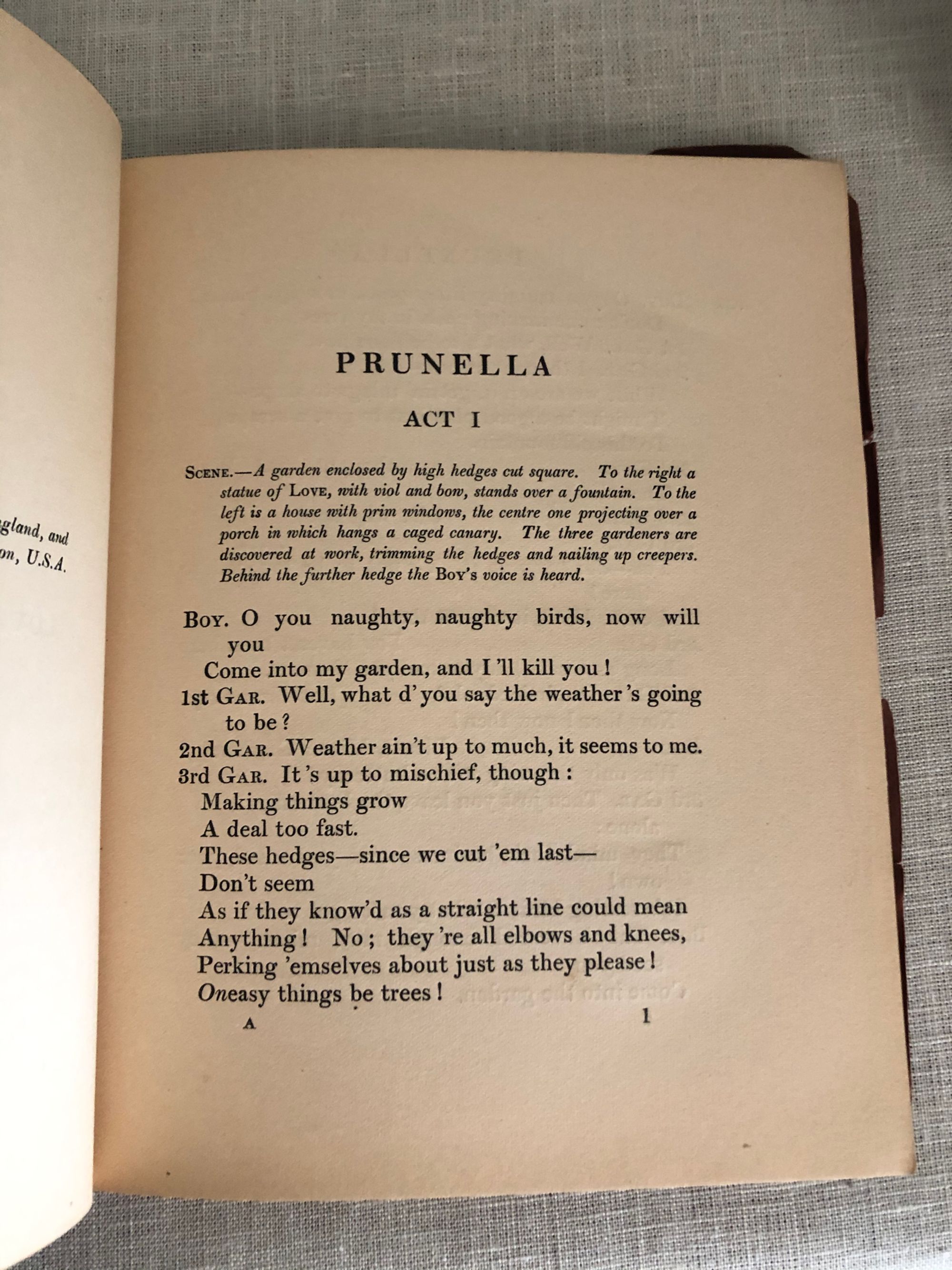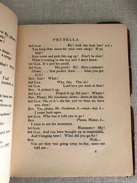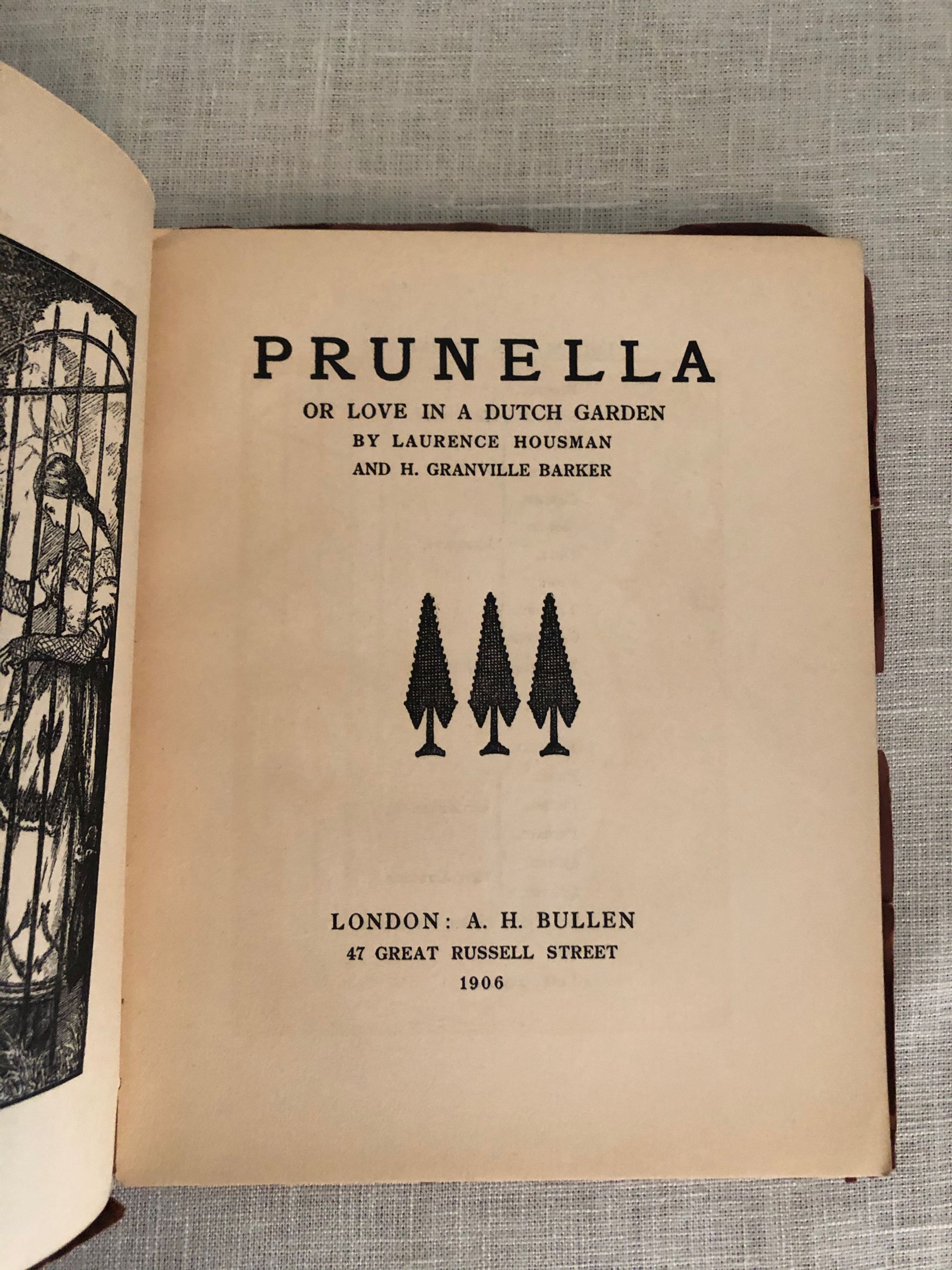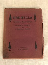 89pp. Condition: Covers worn at edges with some chips especially to tail of spine which has a small piece missing. ** Play by Laurence Housman (1865 - 1959), brother of the poet A.E.Housman, and Harley Granville-Barker (1877 - 1946). The protagonist of the play, Prunella, lives with her aunts Prim, Prude, and Privacy, until a traveling band of players comes to town, and Prunella runs off with the leader, Pierrot, to become his "Pierrette". It was made into a movie "Prunella" in 1918.