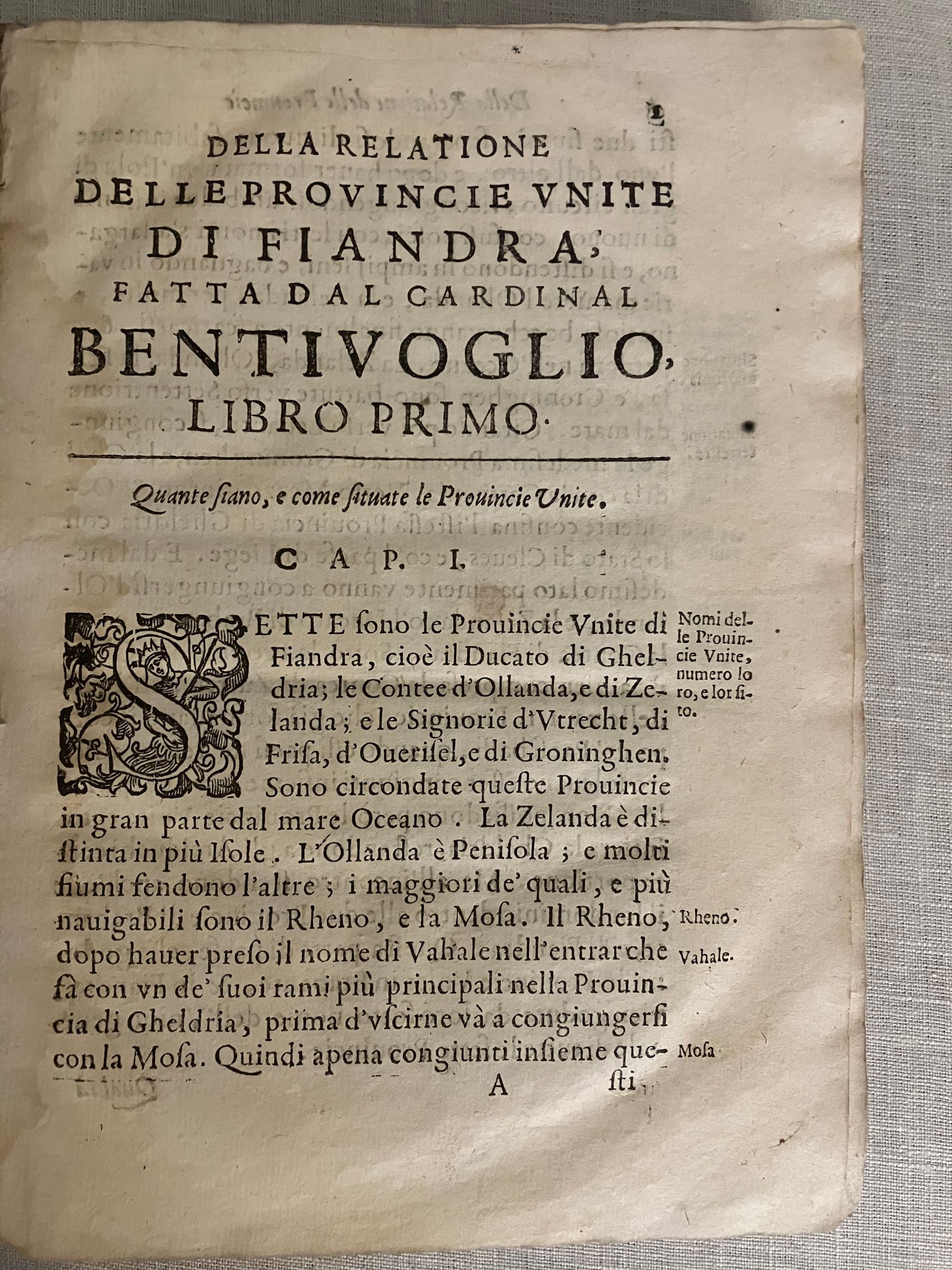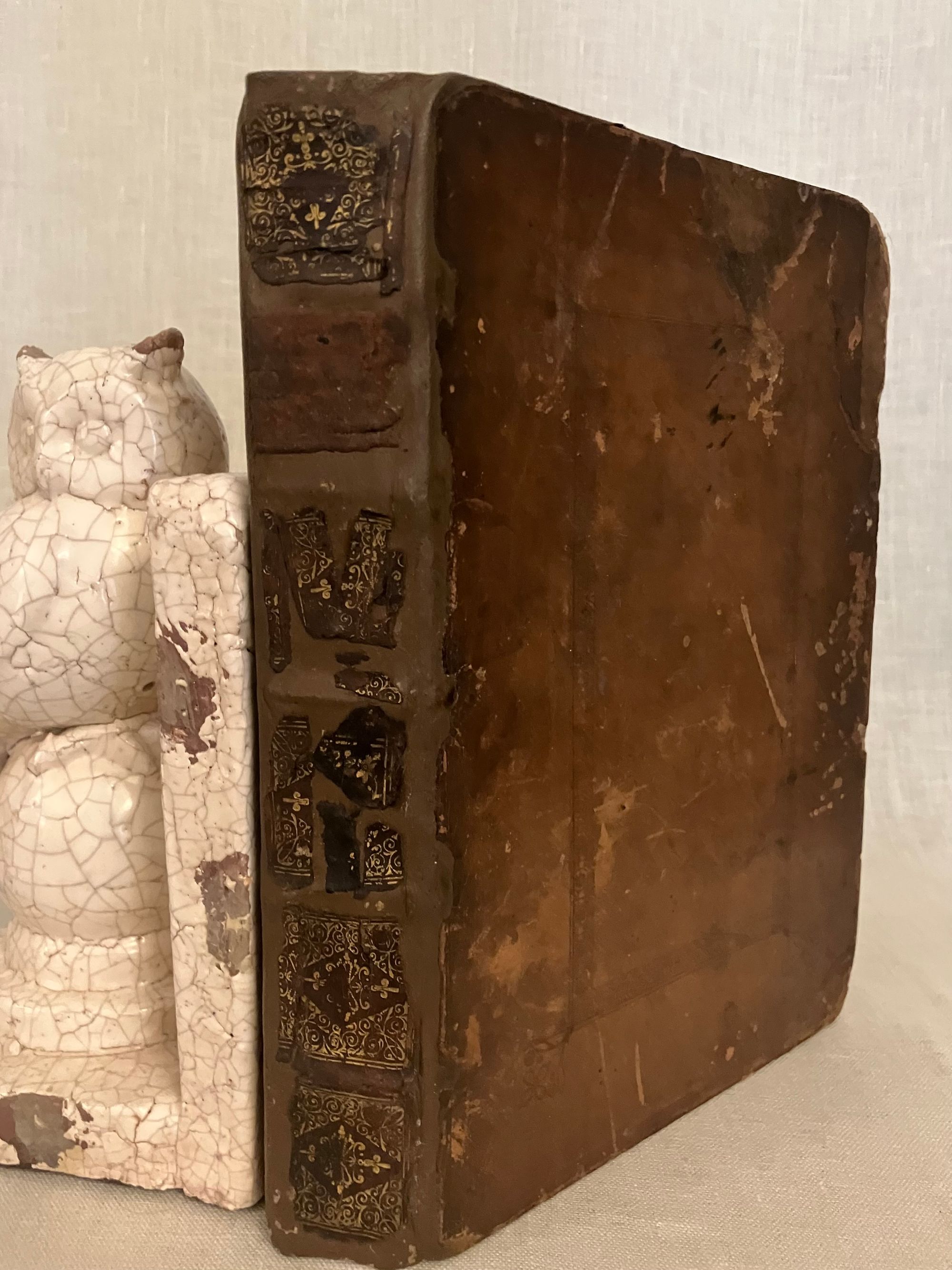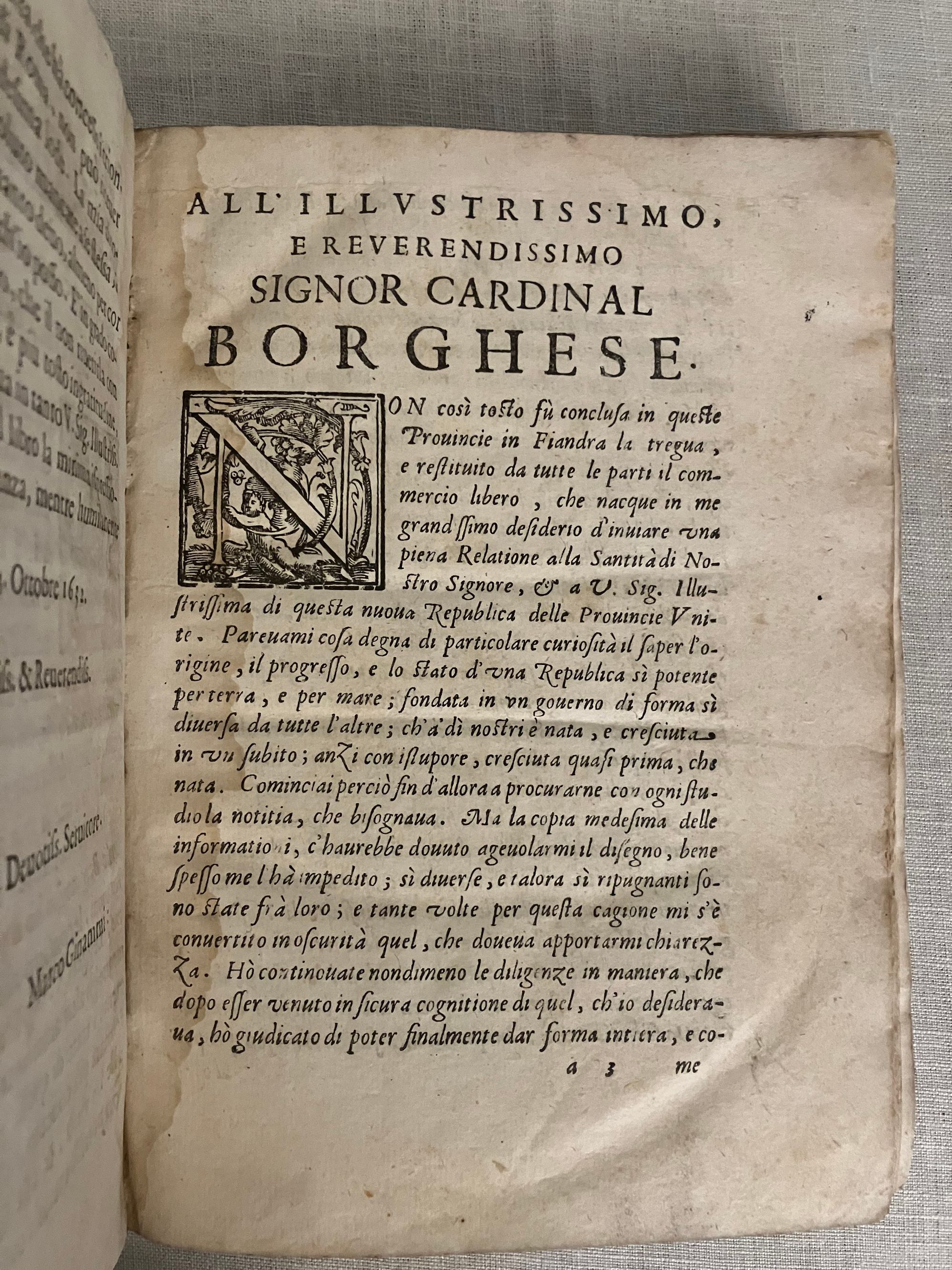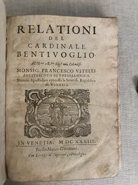 Reprint. Second Ginammi edition (his first printed the year prior.) Hardcover, 8vo in full calf, rebacked, with blind-stamped decoration to boards of rolled floral rectangular decoration and plain double filet to outer edges. Corner fleurons to the front and rear boards. The spine, with remnants of raised compartments, has bits of the original gilt decoration applied with charming irregularity. An applied leather label is illegible. Page edges are deckled with red spatter. In Italian. The title page features a printer's device with the figure of Hope, a woman facing the sun, leaning against an anchor. This figure was copied from a statue by Iacopo Sansovino at the Church of the Savior, located next to the printing house. (L. Spera, BDI, Vol. 55, 2001.) The motto on printer's device: "Spes mea in Deo est," (My hope is in God.) 2 titles in one with continuous numbering. Text features wonderful typography with side notes, wood cut historiated initials and other decorative headers and footers. **COLLATION: pp. [28] 417 [3]. [2]a6 b8 A8-I8 K8-T8 V8 X8-Z8 Aa8-Dd8. Page 361 misnumbered as 347. **CONDITION: Good antiquarian condition. Boards are worn, with show-through to the boards on corners, back and spine. There are signs of water damage to the text block at spine edge. Wear to the fore-edge of the first and final signatures.** CONTENTS: The printer's dedication of the work to Cardinal Bentivoglio, dated 1632; Bentivolglio's dedication of his work to Signor Cardinal Borghese, dated 1611; Table of Contents by Chapters; Preface to Primo Volume; Printer's Preface; Alphabetical Table of Contents incl. both works; Most quoted sentences, all p.[1-28]. VOLUME PRIMO: Report of the Provinces of Flanders made by Cardinal Bentivolio, including an assessment of the political and military strengths 1-164pp. VOLUME SECUNDO: "Della Relatione di Findra, Parte Seconda " p. 165-306. THIRD PART:" Relatione della fuga di Francia Denrico di Borbone Prencipe di Conde, Primo Prencipie del Sangue Reale di Francia, e di quello che sugui fino al sua ritorno a Parigi," p. 307-362. FORTH PART: "Relatione della Mossa D'Arme che Segui in Fiandra L'Anno MDXXIV, per Occasione d'Haver Le Provincie Unite Occupata La Terra, e Castello di Giuliers,"p. 363-417. FINALLY: "Libri Stamparti da Marco Ginammi alla Liberia della Speranza," 2pp. Printer/publisher's catalogue. **AUTHOR, Cardinal Guido Bentivoglio d'Aragona, (1579-1644) was an influential historian and papal statesman, or nuncio, at the Court of the Netherlands around the time of the conclusion of the Eighty Years War, and later, at the court of France. Educated at the University of Padua in both civil and canon law, he was singled out for early advancement by Pope Clement VIII, becoming his private chamberlain. Under Pope Paul V, Bentigvolio would become nuncio at the Court of Archduke Albert and Isabella in the Hapsburg Netherlands from 1607-1615, and later Cardinal Protector of France between 1618-1621. Bentivolgio was a signer of the papal condemnation of Galileo, his one-time teacher at Padua. He was favored as successor to Pope Urban VIII, but died suddenly after the opening of the conclave in 1644. ***First published in1629, Bentivoglio wrote to his colleague Cardinal Vitelli, nuncio to Venice and Thessalonika, in the Relationi, with observations on the United Provinces of the Netherlands: the people, the naval and military strength and personalities of the major international players in the area. He also discusses the stresses leading into to the Thirty Years' War, frictions between the Austro-Spanish Hapsburgs and the French Bourbons, and the struggles for control by Catholic and Protestant parties. The second book, with its own half title page, is a history of the War of Flanders. *** PRINTER, Marco Ginammi (1590-1654) published two editions of the Relationi, this one in 1633 and another in 1636. The infamous plague which devastated Venice between 1628-30 had forced Ginammi to temporarily cease all production, and he had to borrow a press to print an Operetta he had penned celebrating the end of the pestilenza in 1631. However, his fortunes would recover. He was elected both priore and sindaco (mayor, or administrator) to the Guild of Printers and Booksellers of Venice in the 1630's and 40's, and owned and rented out land. His was a small family print shop, although his bookstore carried volumes produced all over Italy. He would collaborate editorially with a number of others. He published a great number of the works of Ludovico Zuccolo as well as the sacred works of Pietro Aretino. A son, Bartolomeo Giammi, learned Slavic and Turkish languages, enabling the family print shop to cater to the "oriental" markets. Ginammi also translated French editions into Italian. USTC: 4012401 (11 copies worldwide.) RARE.